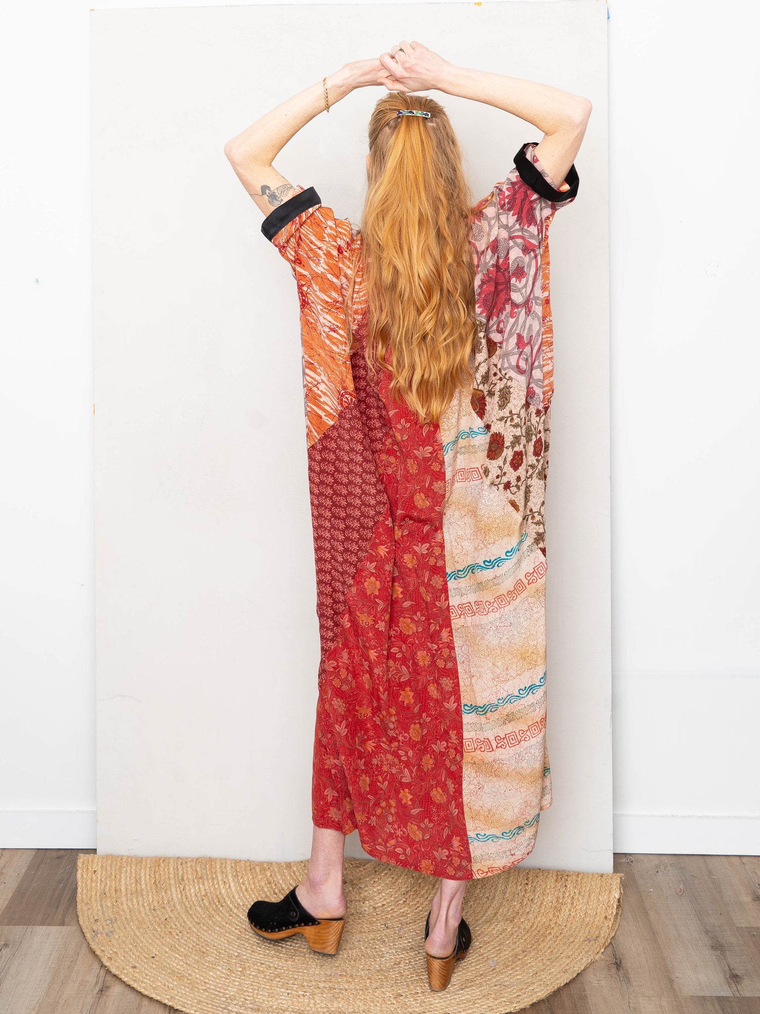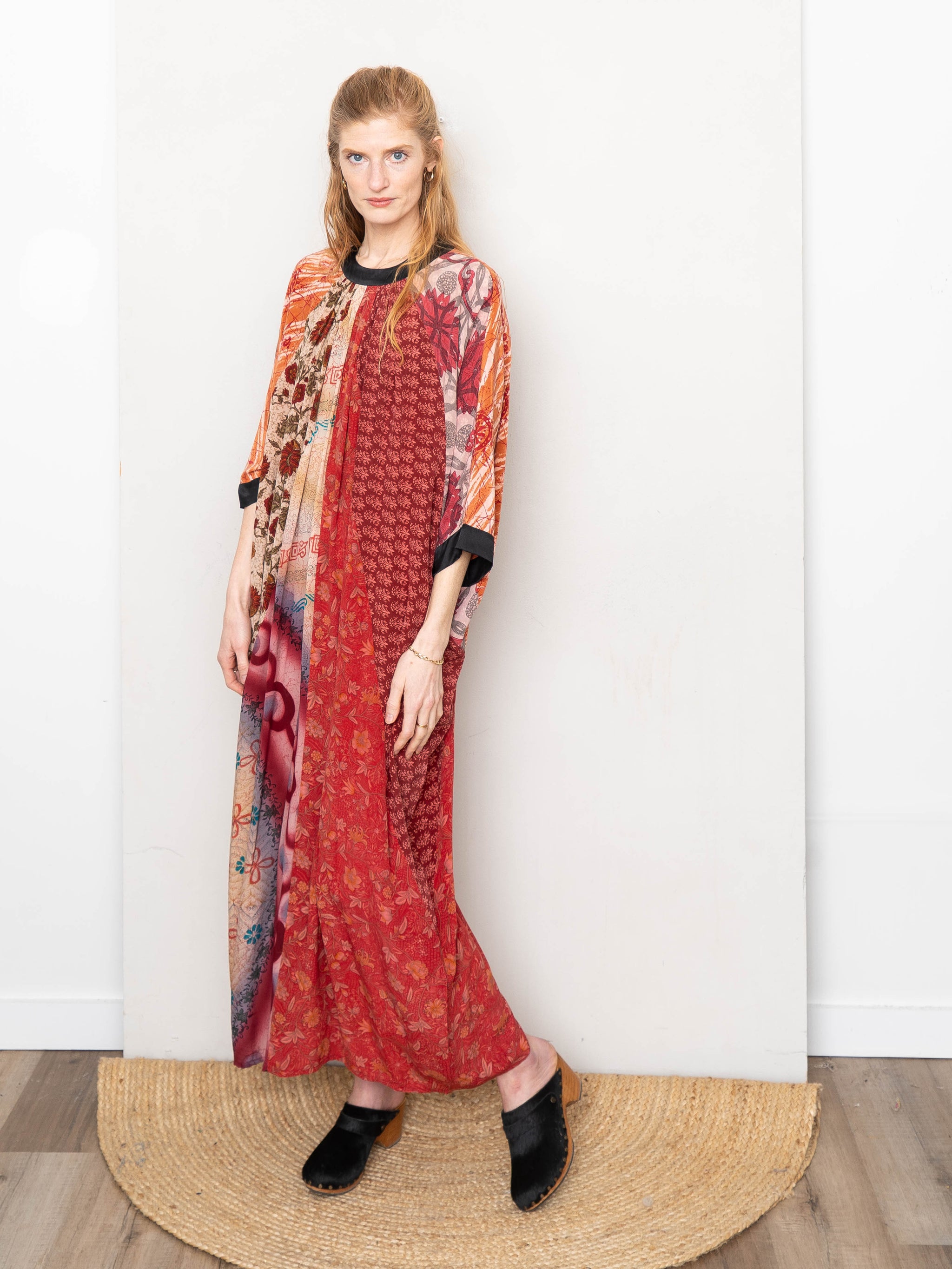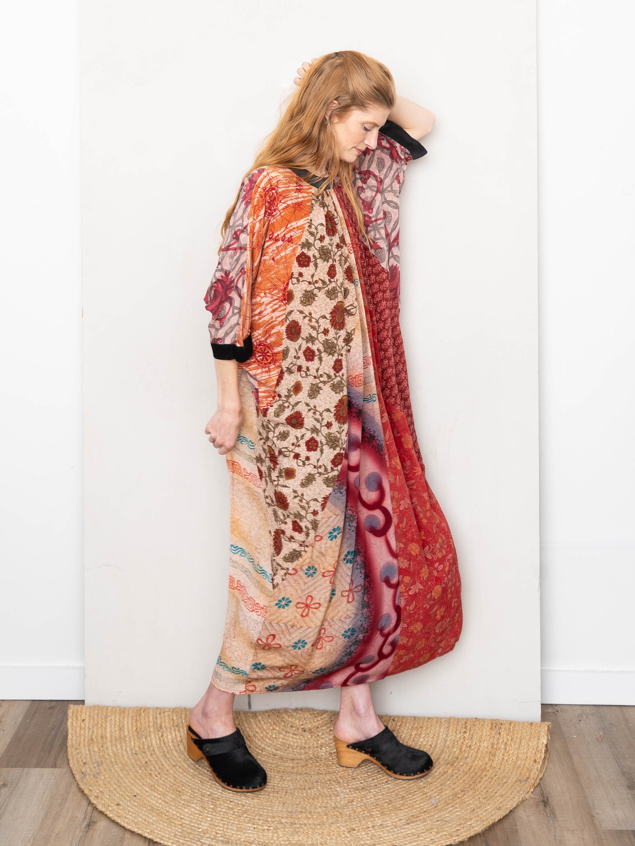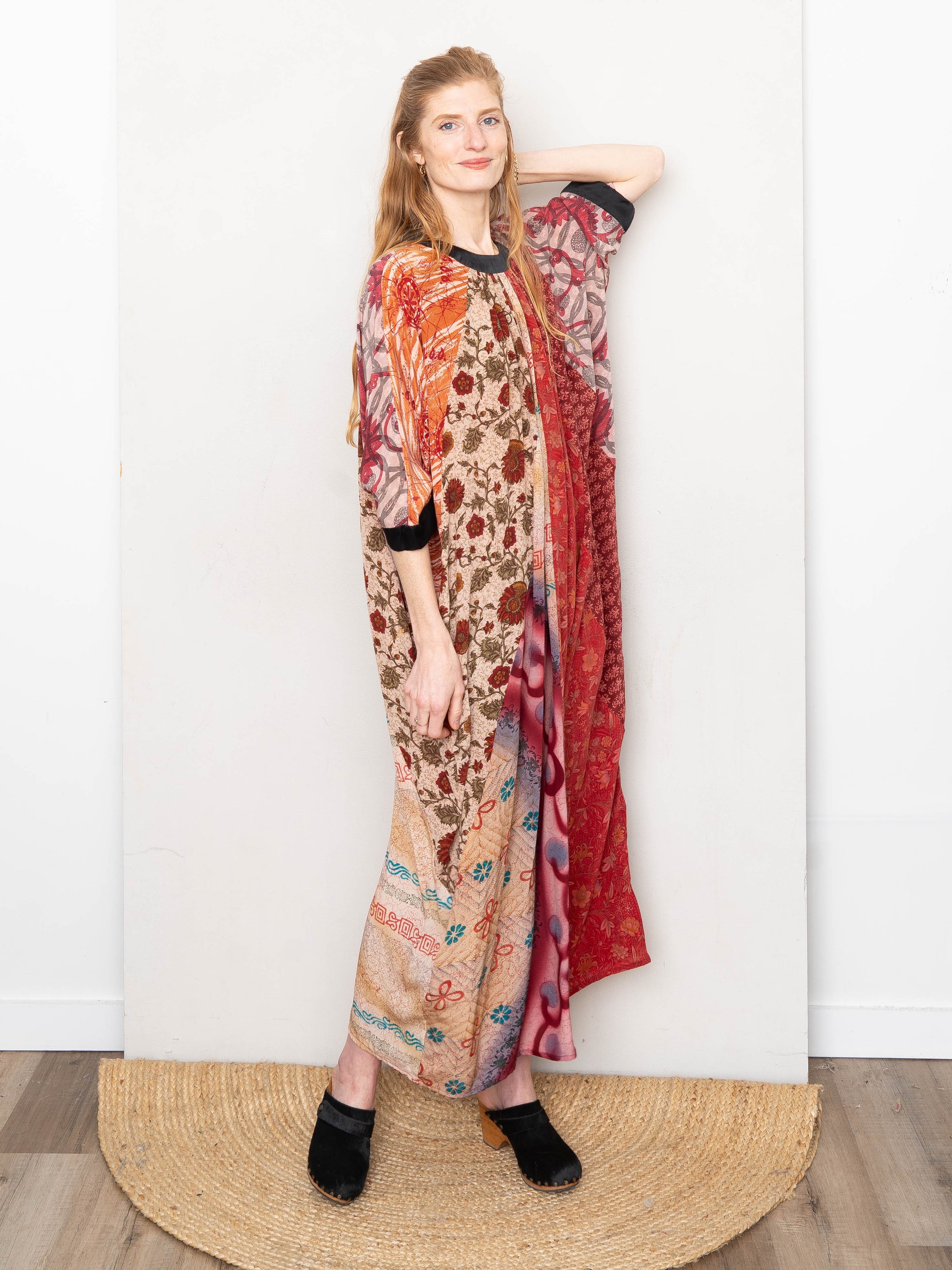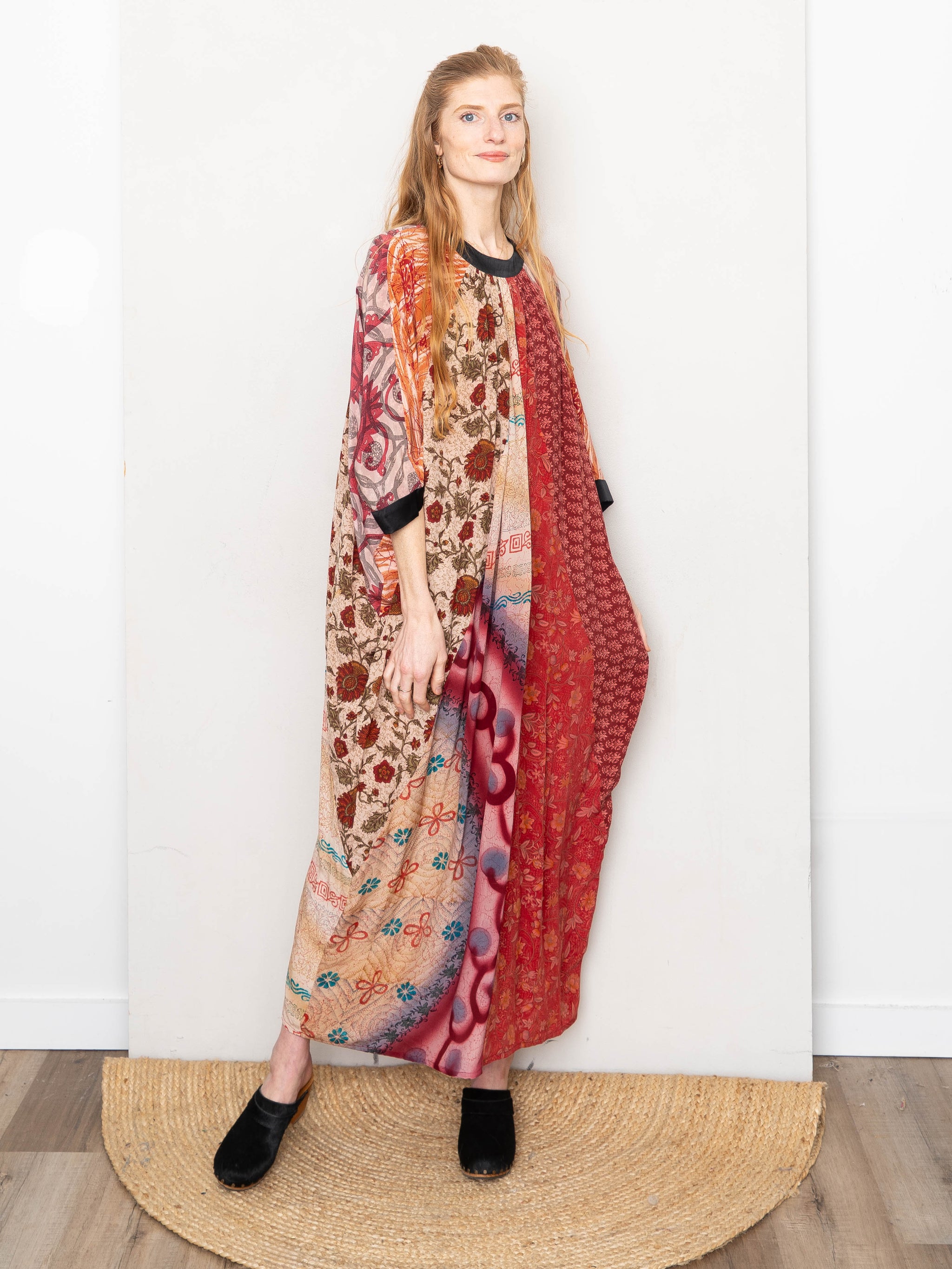 The Simmy Dress is a loose, flowy silhouette crafted from recycled silk saris—each hand-selected and thoughtfully pieced together from up to six different prints. Designed with an asymmetric gathered detail and invisible back zipper, every dress is one-of-a-kind and never repeated. Easy to wear, easy to tailor, and made to celebrate pattern and play.