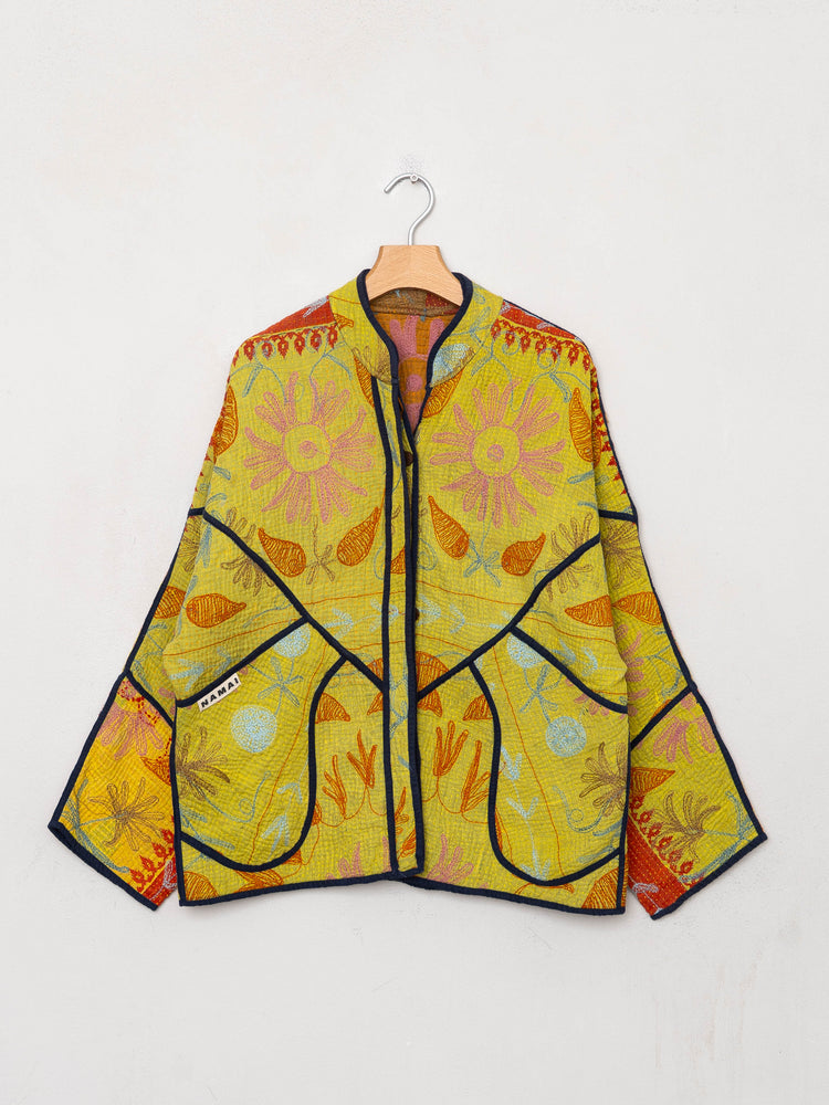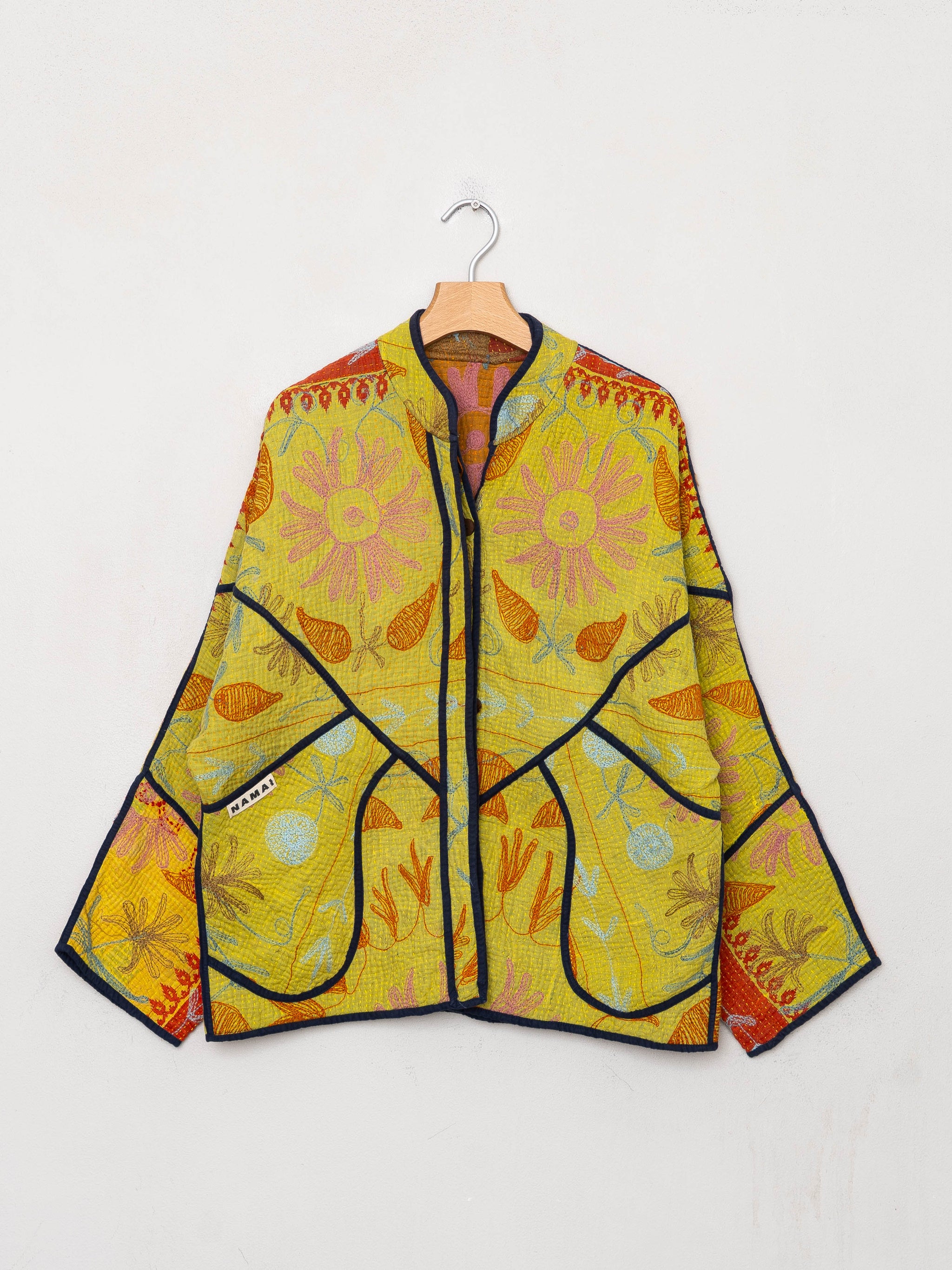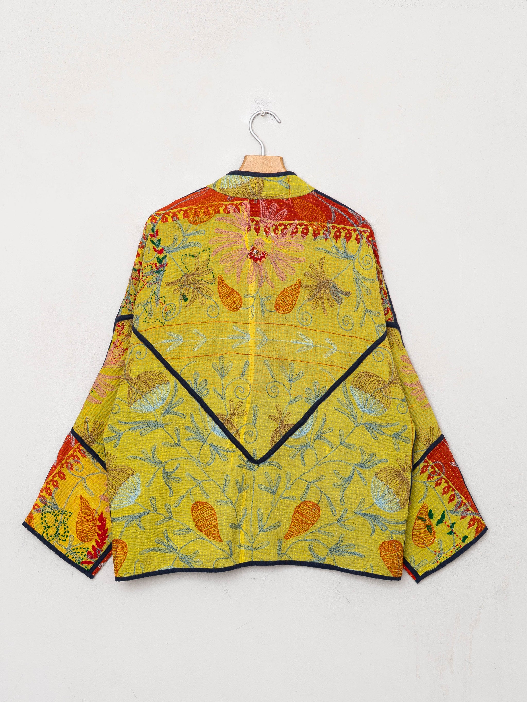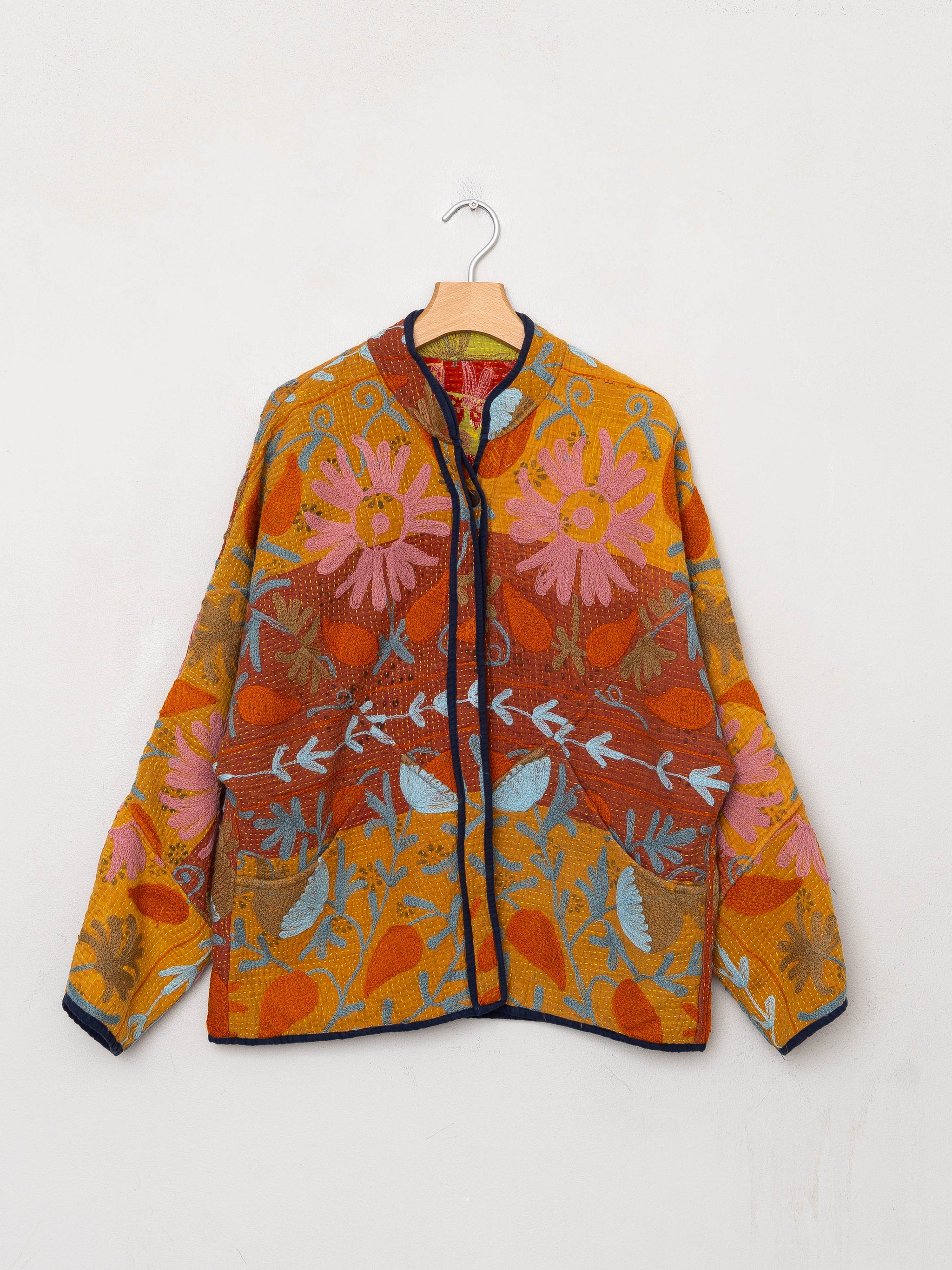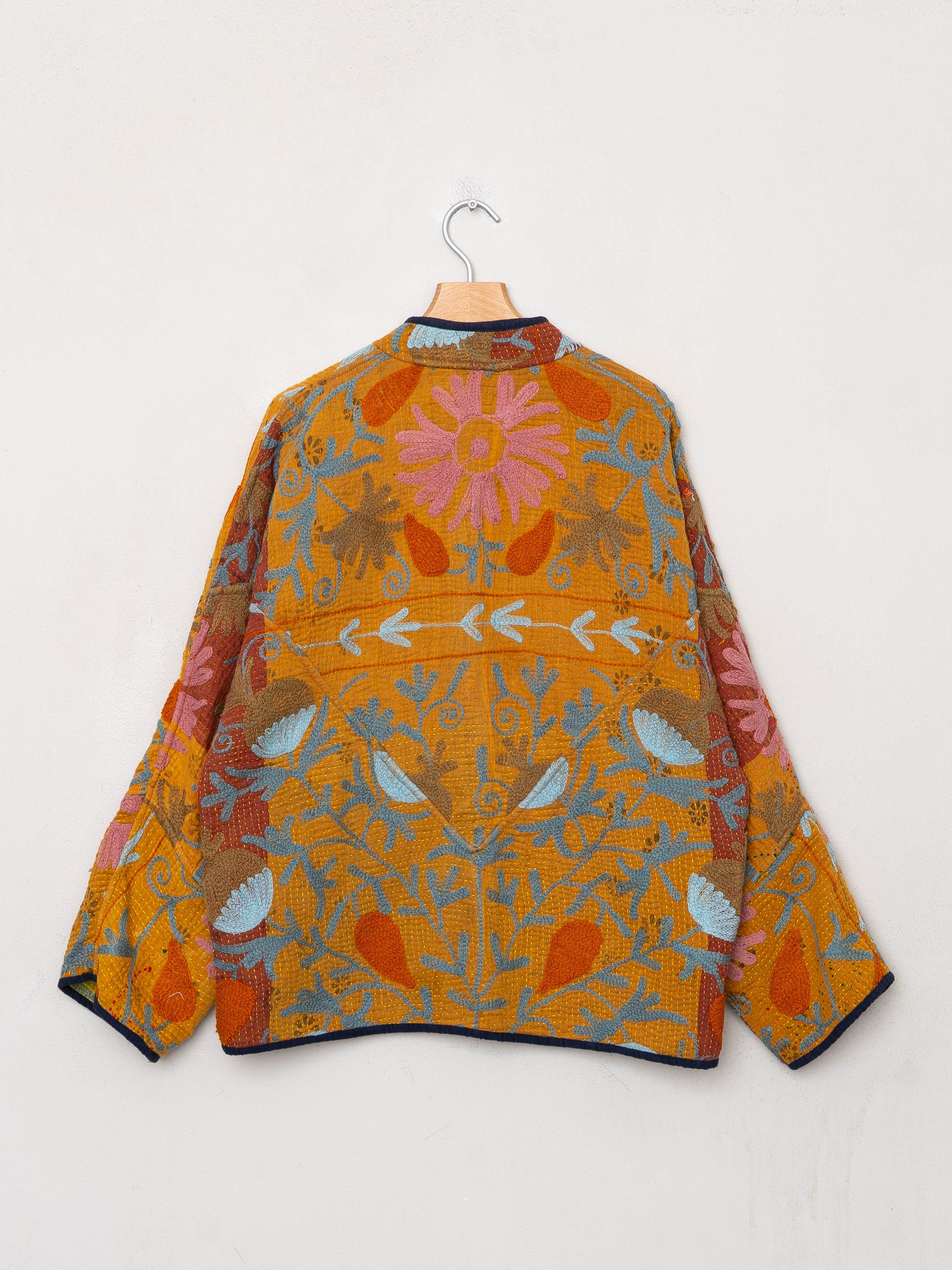 Our Suzani jackets are made from a repurposed Suzani Kantha quilt—vintage cotton stitched with colorful wool embroidery in a flowing chain-stitch style.