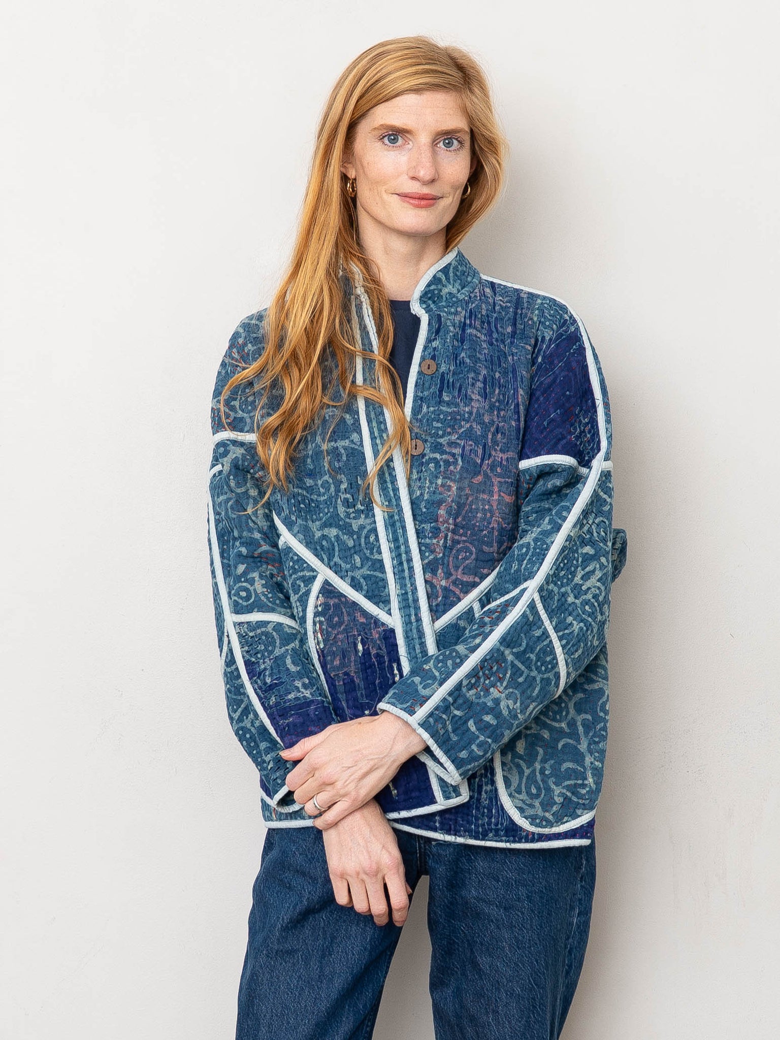The Ladhiya Jacket is a relaxed, hip-length style with an easy, oversized fit and generous patch pockets on both sides. Fully reversible and made from vintage Kantha quilts, each piece is completely one of a kind—no two are alike. Designed with thoughtful details like rollable sleeves, a mandarin collar, and coconut shell buttons on both sides for effortless wear.