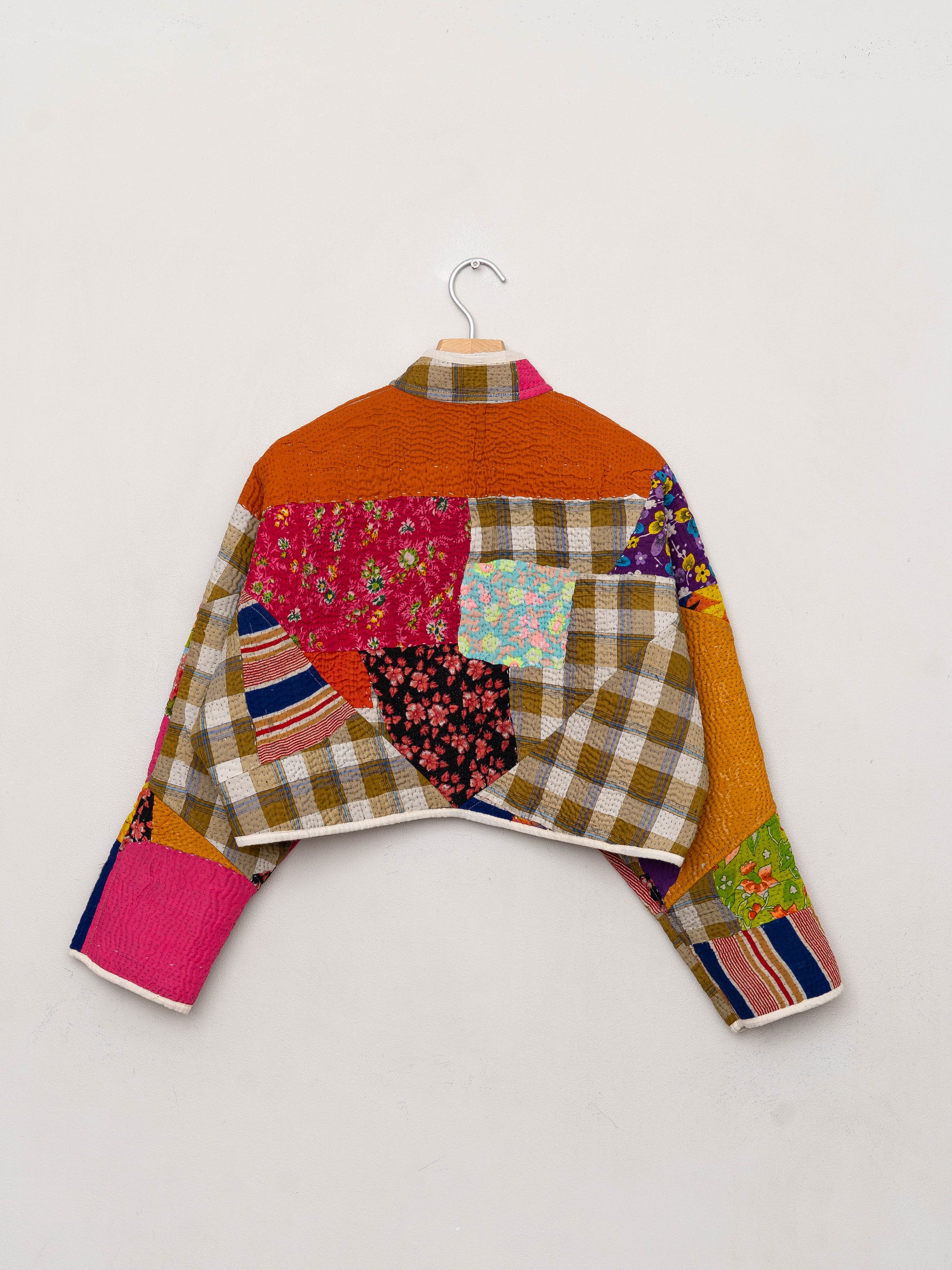 • The Kaira Jacket is a fully reversible cropped quilted jacket made from vintage Kantha quilts, each with its own stitching, layout, and patina (signs of age). Its boxy silhouette, mandarin collar, and rollable sleeves create a clean, modern shape that stands apart from mass-market cropped jacket styles.
