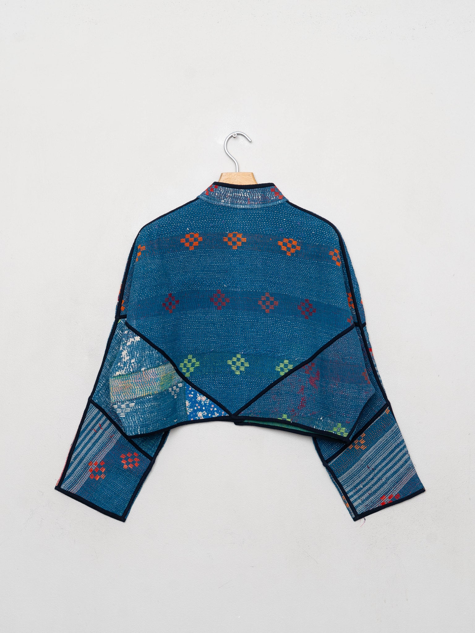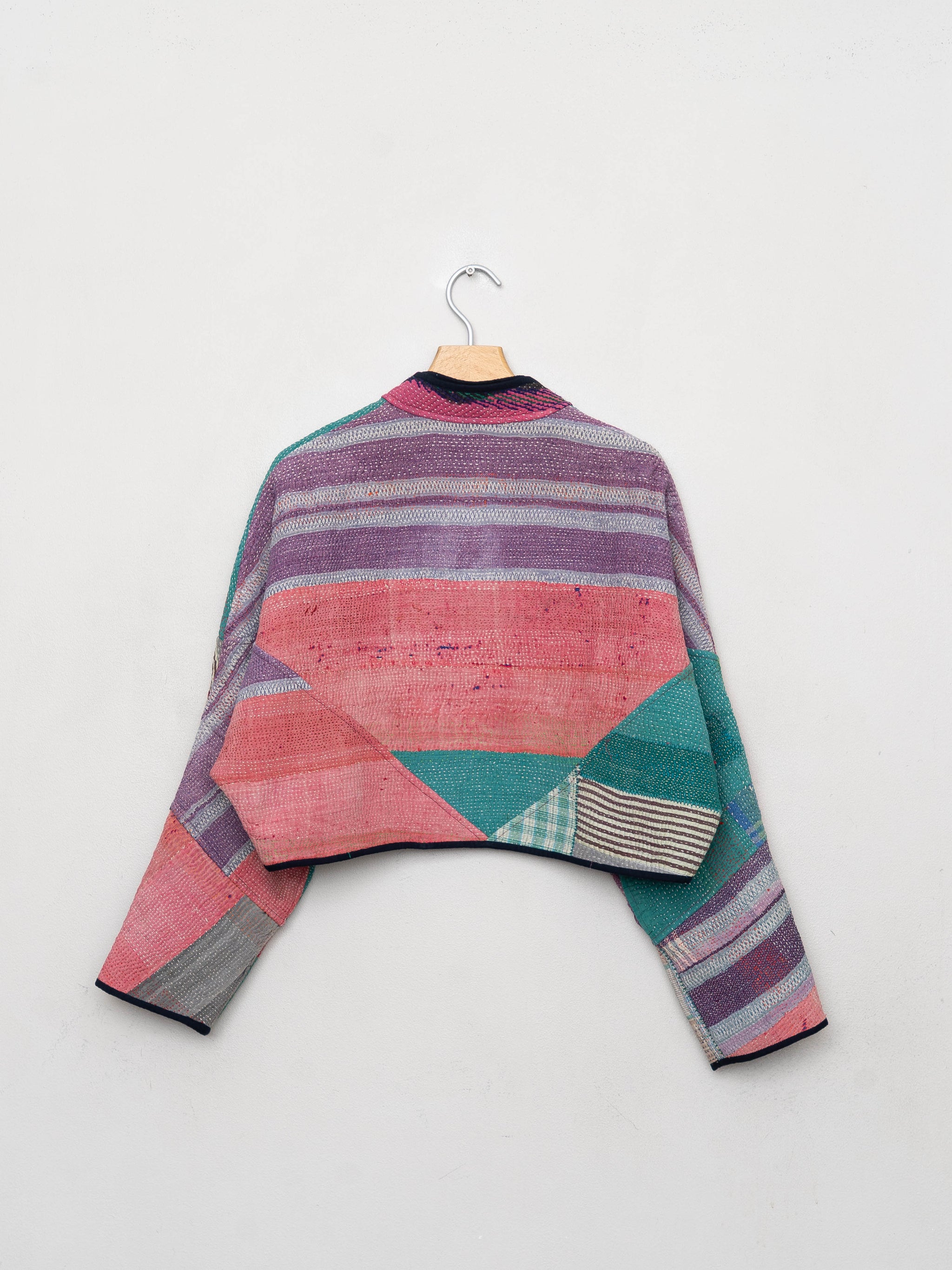 • The Kaira Jacket is a fully reversible cropped quilted jacket made from vintage Kantha quilts, each with its own stitching, layout, and patina (signs of age). Its boxy silhouette, mandarin collar, and rollable sleeves create a clean, modern shape that stands apart from mass-market cropped jacket styles.