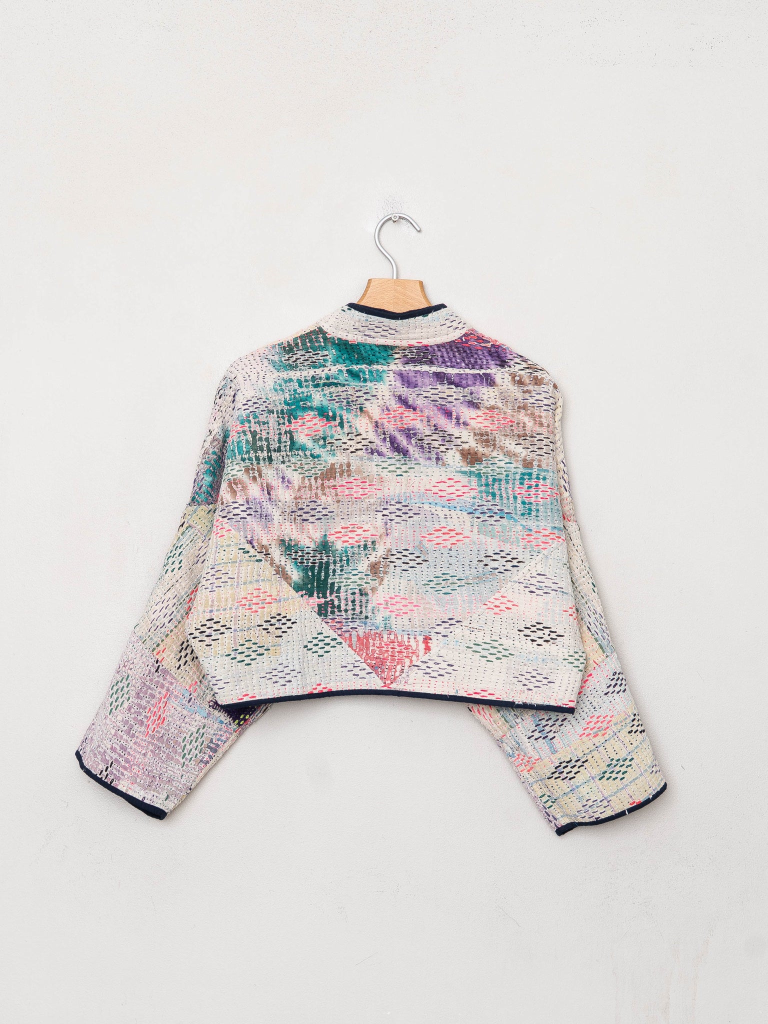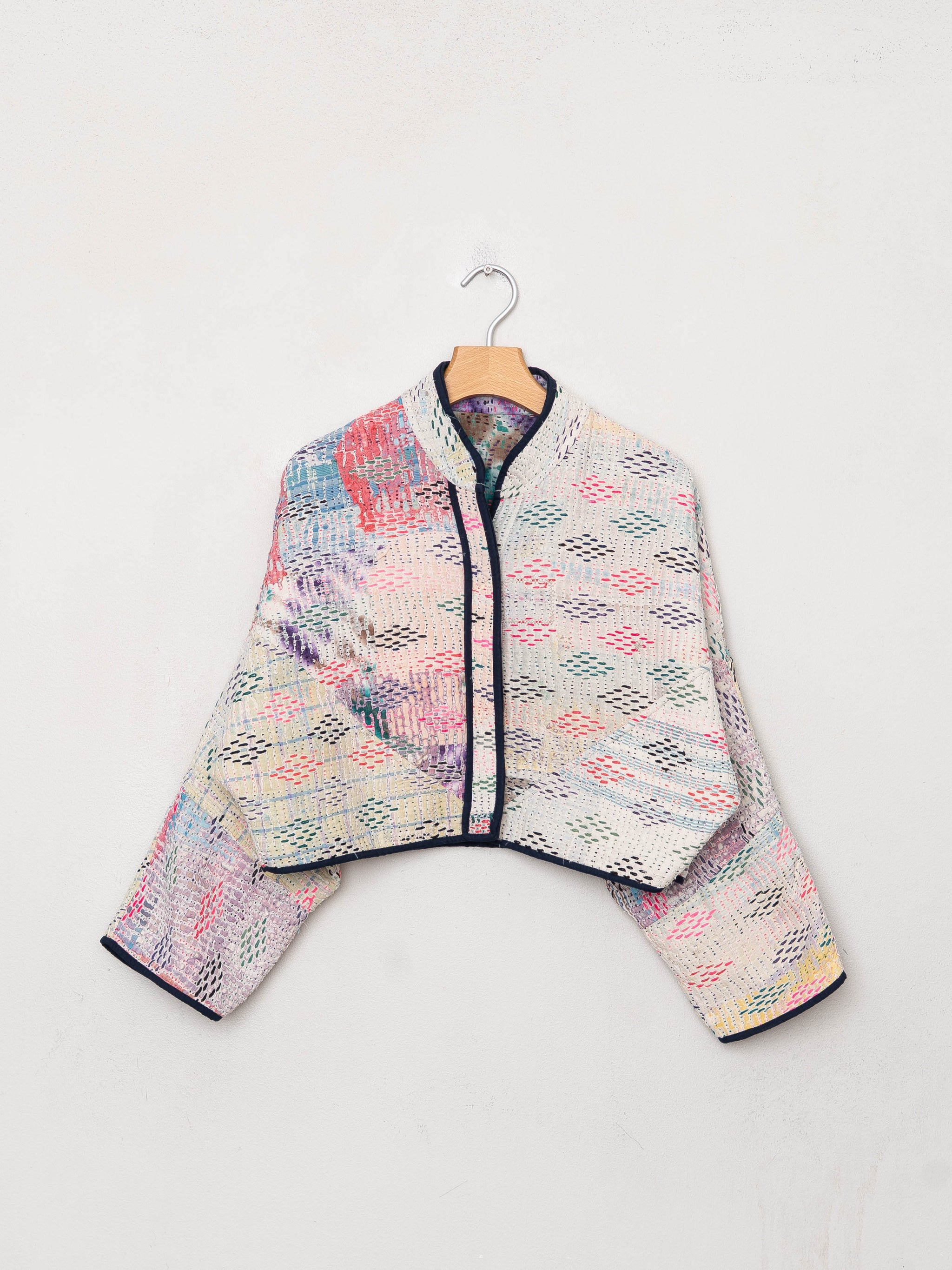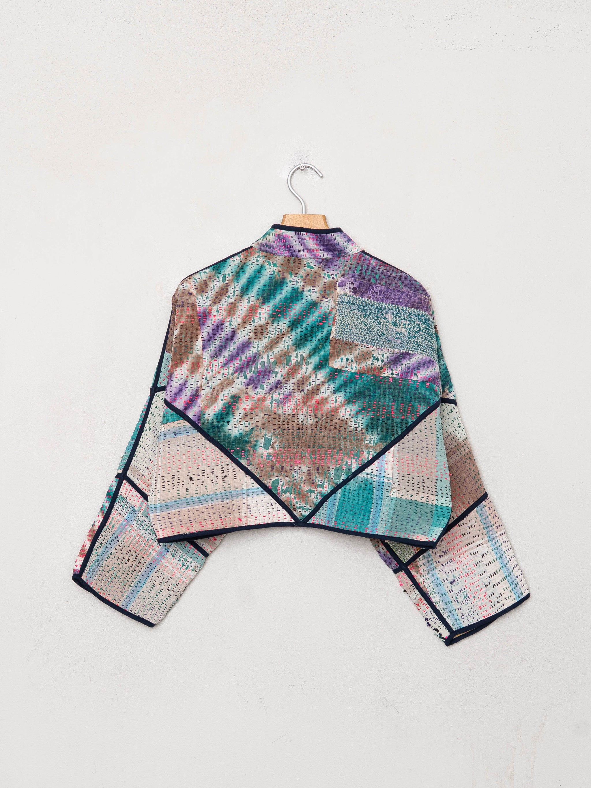 • The Kaira Jacket is a fully reversible cropped quilted jacket made from vintage Kantha quilts, each with its own stitching, layout, and patina (signs of age). Its boxy silhouette, mandarin collar, and rollable sleeves create a clean, modern shape that stands apart from mass-market cropped jacket styles.