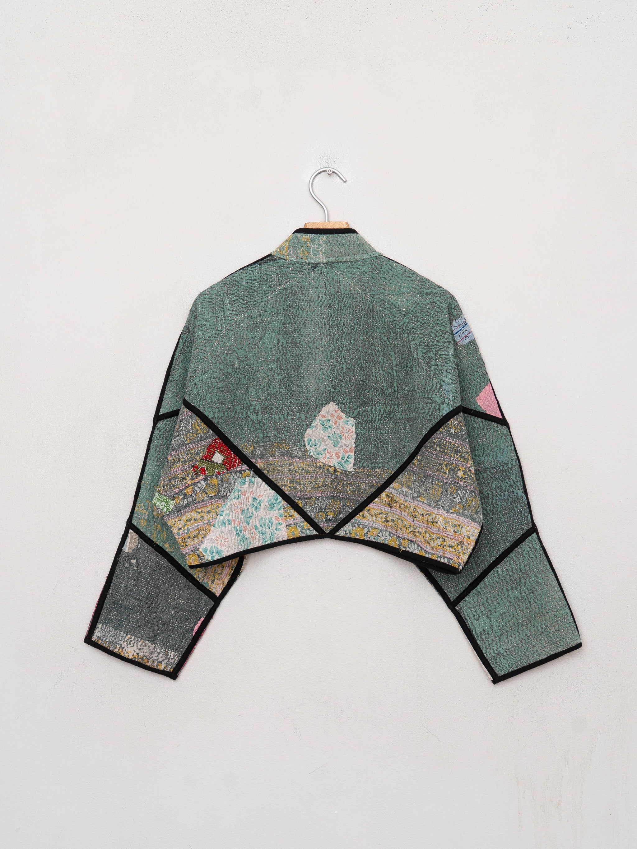 • The Kaira Jacket is a fully reversible cropped quilted jacket made from vintage Kantha quilts, each with its own stitching, layout, and patina (signs of age). Its boxy silhouette, mandarin collar, and rollable sleeves create a clean, modern shape that stands apart from mass-market cropped jacket styles.