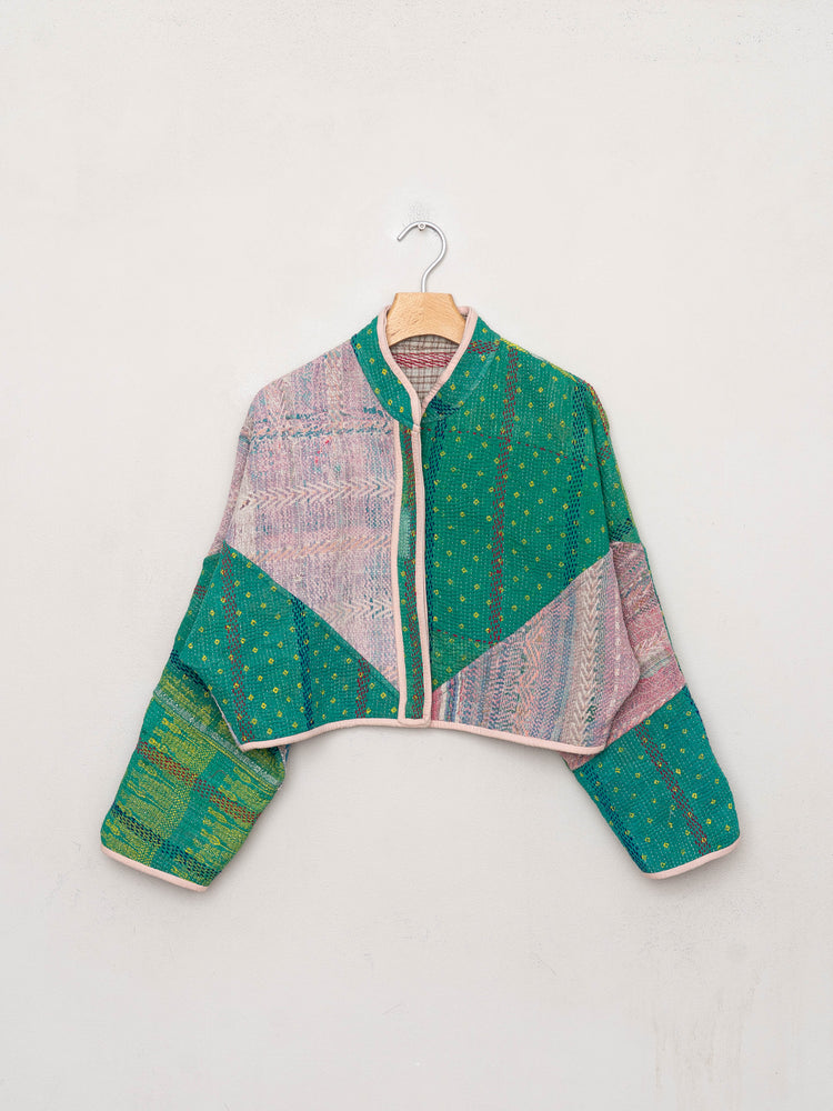• The Kaira Jacket is a fully reversible cropped quilted jacket made from vintage Kantha quilts, each with its own stitching, layout, and patina (signs of age). Its boxy silhouette, mandarin collar, and rollable sleeves create a clean, modern shape that stands apart from mass-market cropped jacket styles.