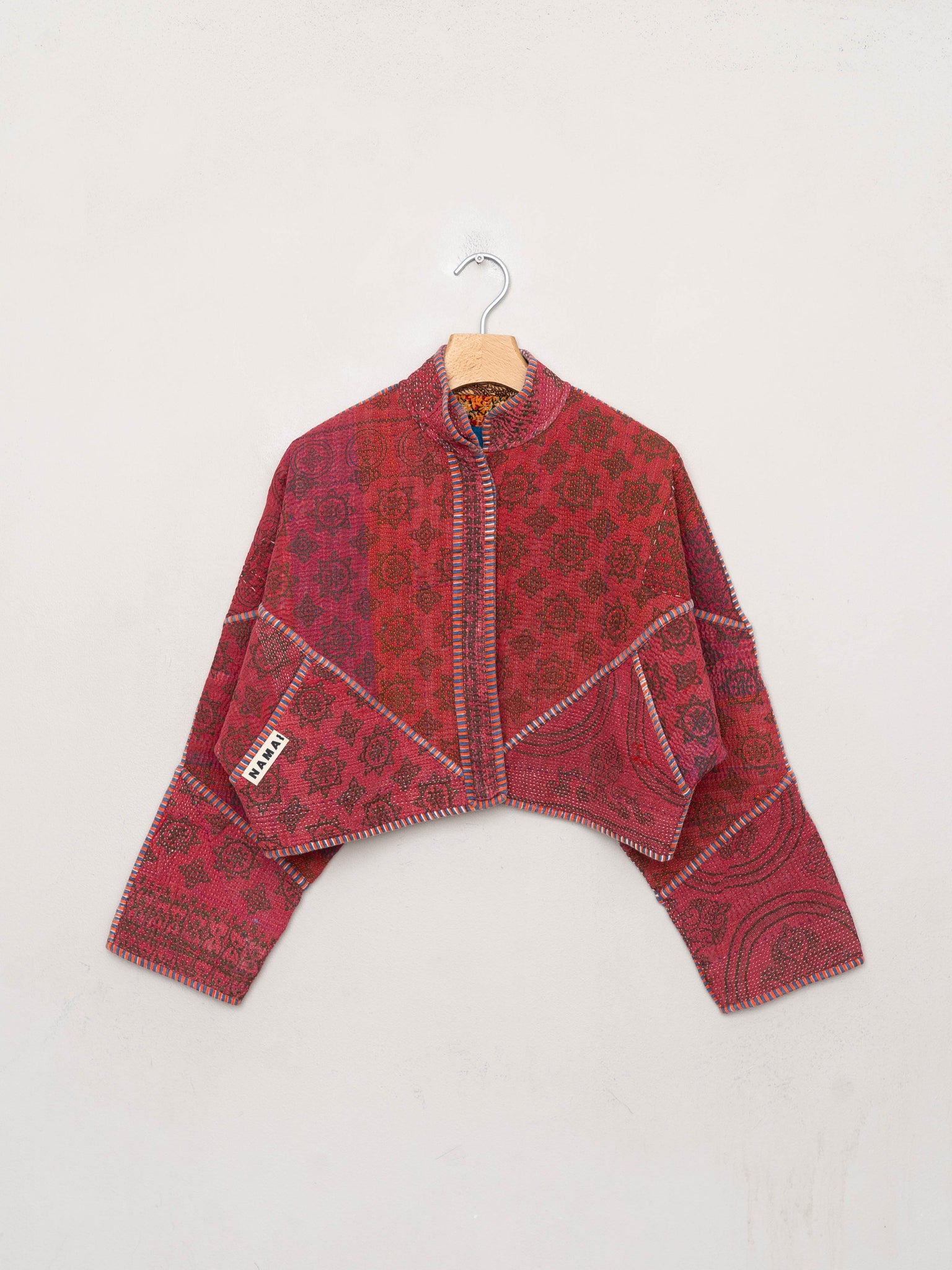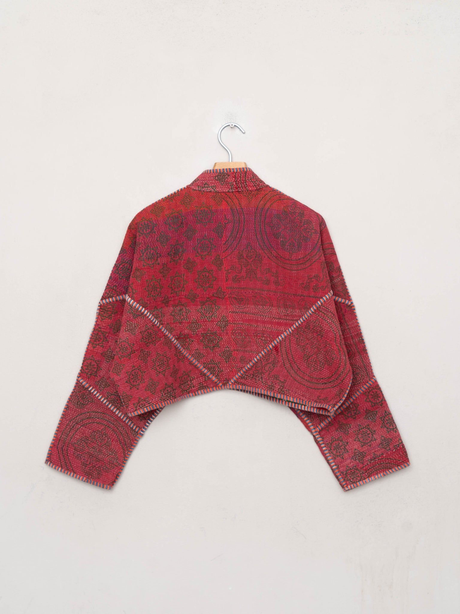 • The Kaira Jacket is a fully reversible cropped quilted jacket made from vintage Kantha quilts, each with its own stitching, layout, and patina (signs of age). Its boxy silhouette, mandarin collar, and rollable sleeves create a clean, modern shape that stands apart from mass-market cropped jacket styles.