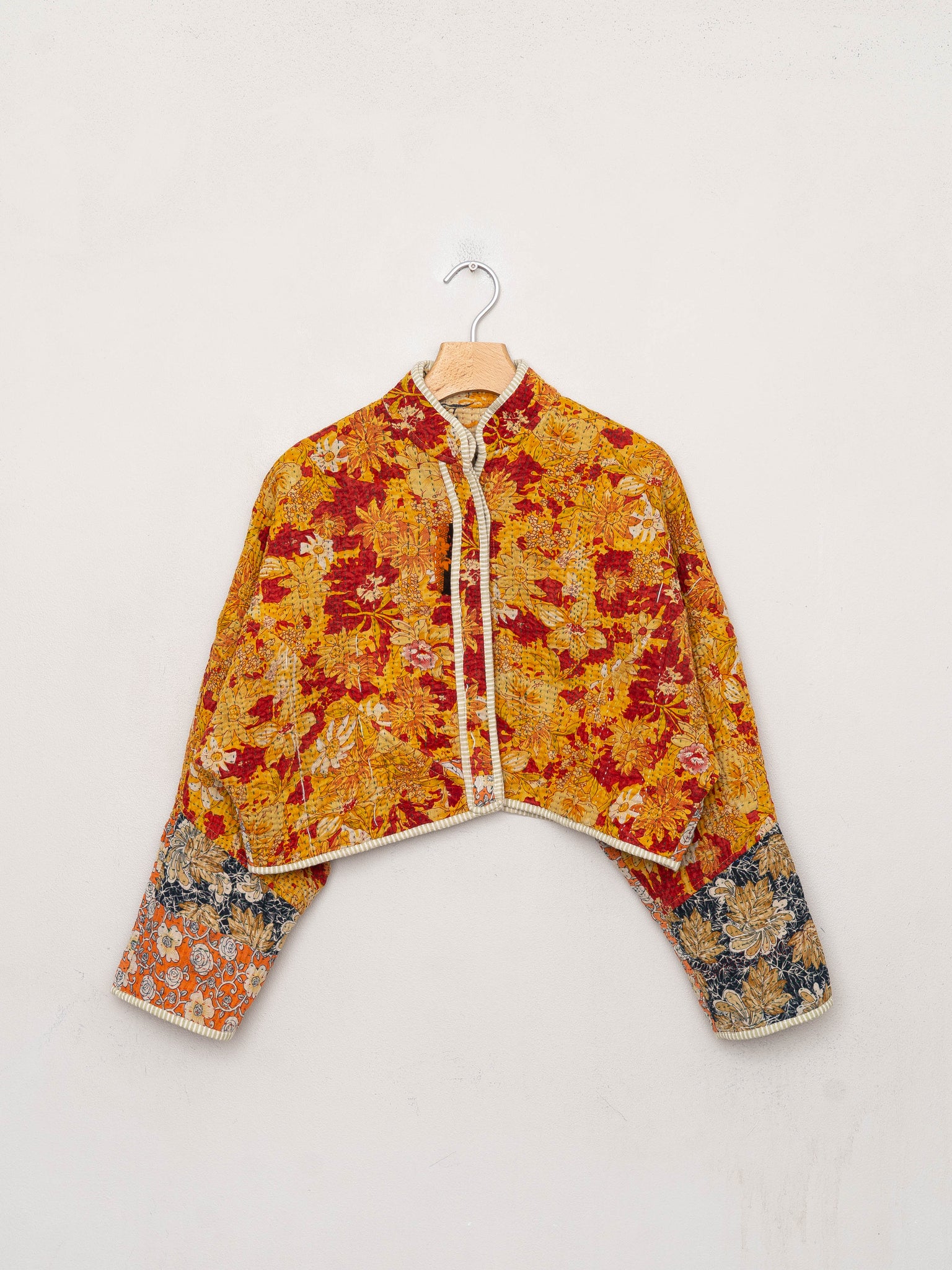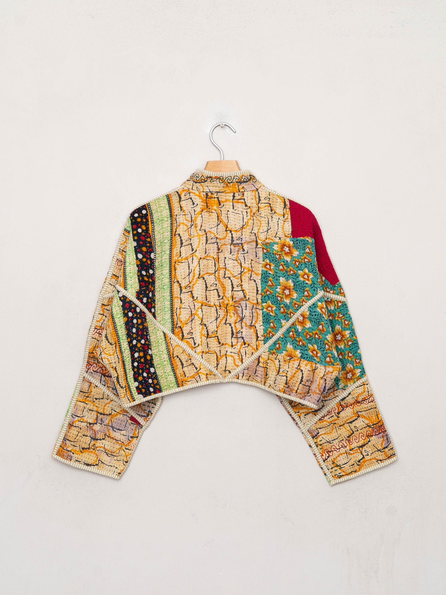 • The Kaira Jacket is a fully reversible cropped quilted jacket made from vintage Kantha quilts, each with its own stitching, layout, and patina (signs of age). Its boxy silhouette, mandarin collar, and rollable sleeves create a clean, modern shape that stands apart from mass-market cropped jacket styles.