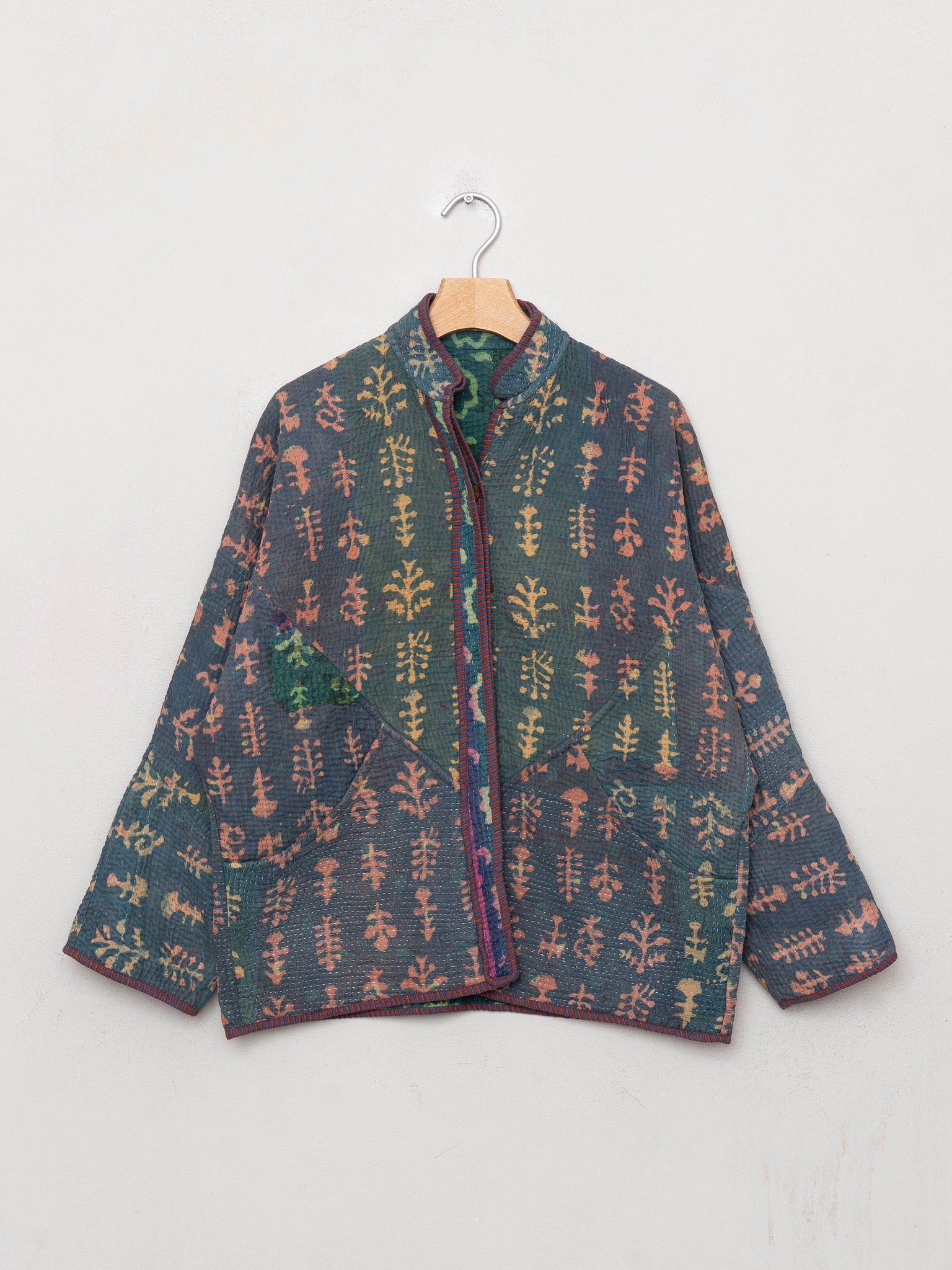 • The Ladhiya Jacket is fully reversible, with finished interiors and functional pockets on both sides — giving you two distinct jackets in one. Each piece is made from a vintage Kantha quilt hand-stitched decades ago, so no two jackets share the same layout, stitching, or color story.