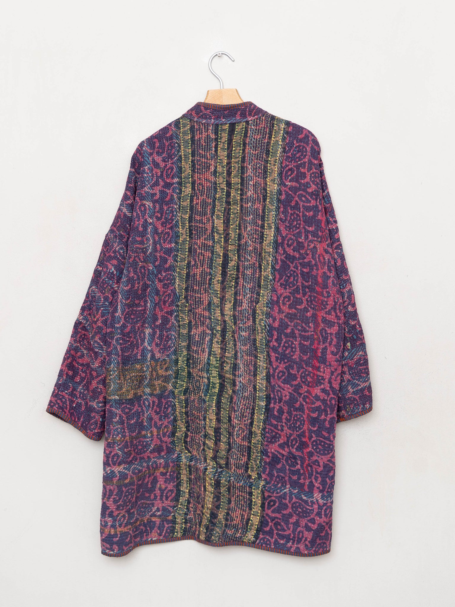 • The Sai Coat is a fully reversible long quilted jacket made from vintage Kantha quilts, finished with a double-sided collar stand, roomy pockets, and clean bias binding along the seams. Its longer silhouette offers a naturally expressive drape without feeling heavy.