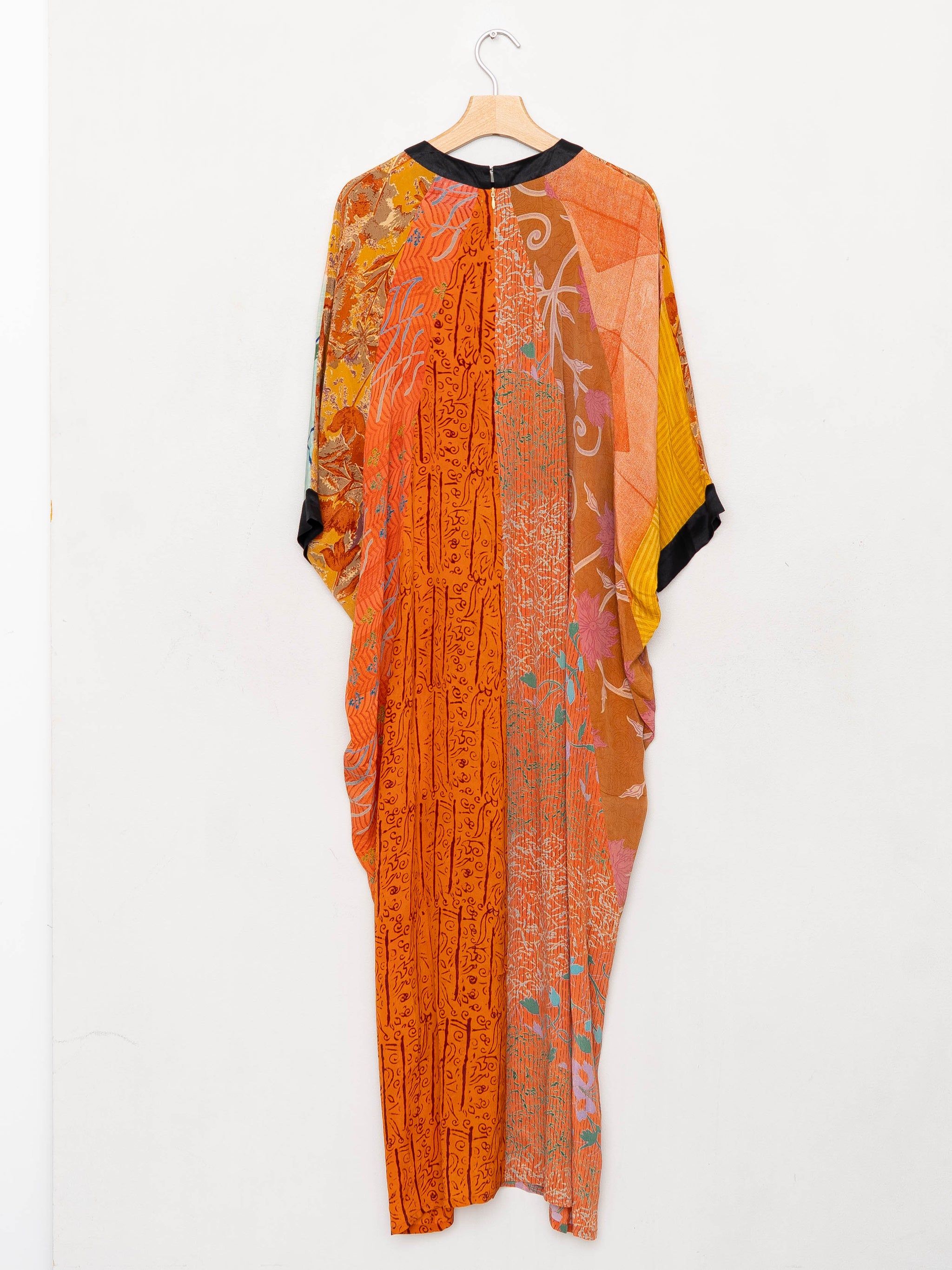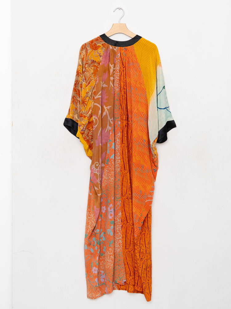 The Simmy Long Dress is crafted from recycled silk saris, each hand-selected and carefully washed before being combined with up to six others. Designed with an asymmetric gathered detail, each dress features a unique mix of prints—no two alike, and never repeated.