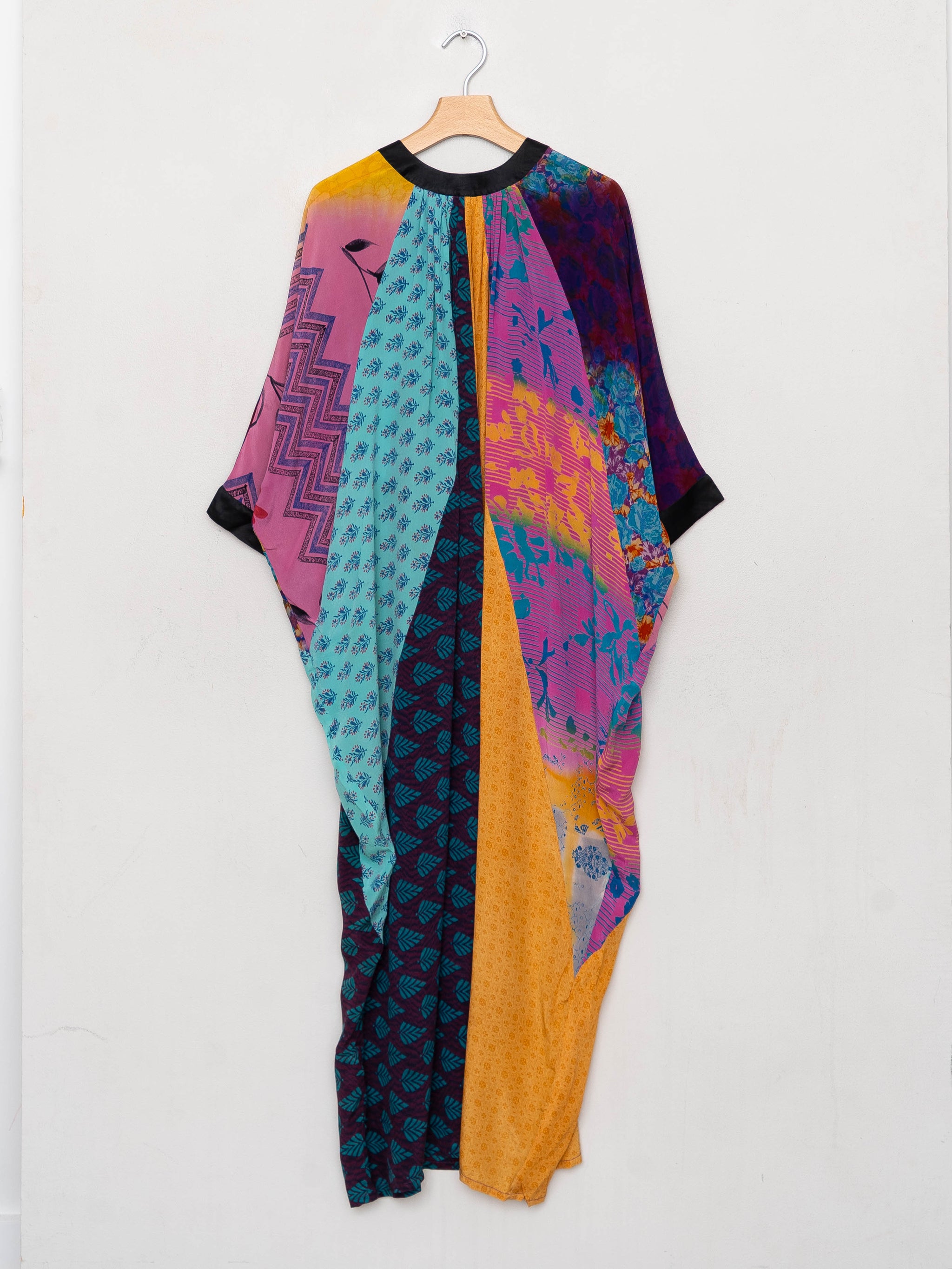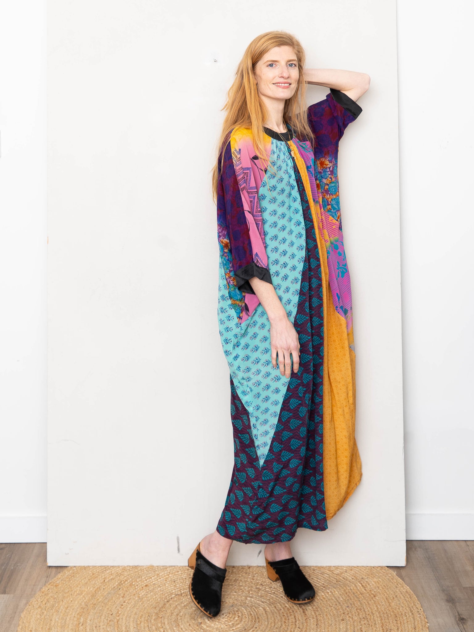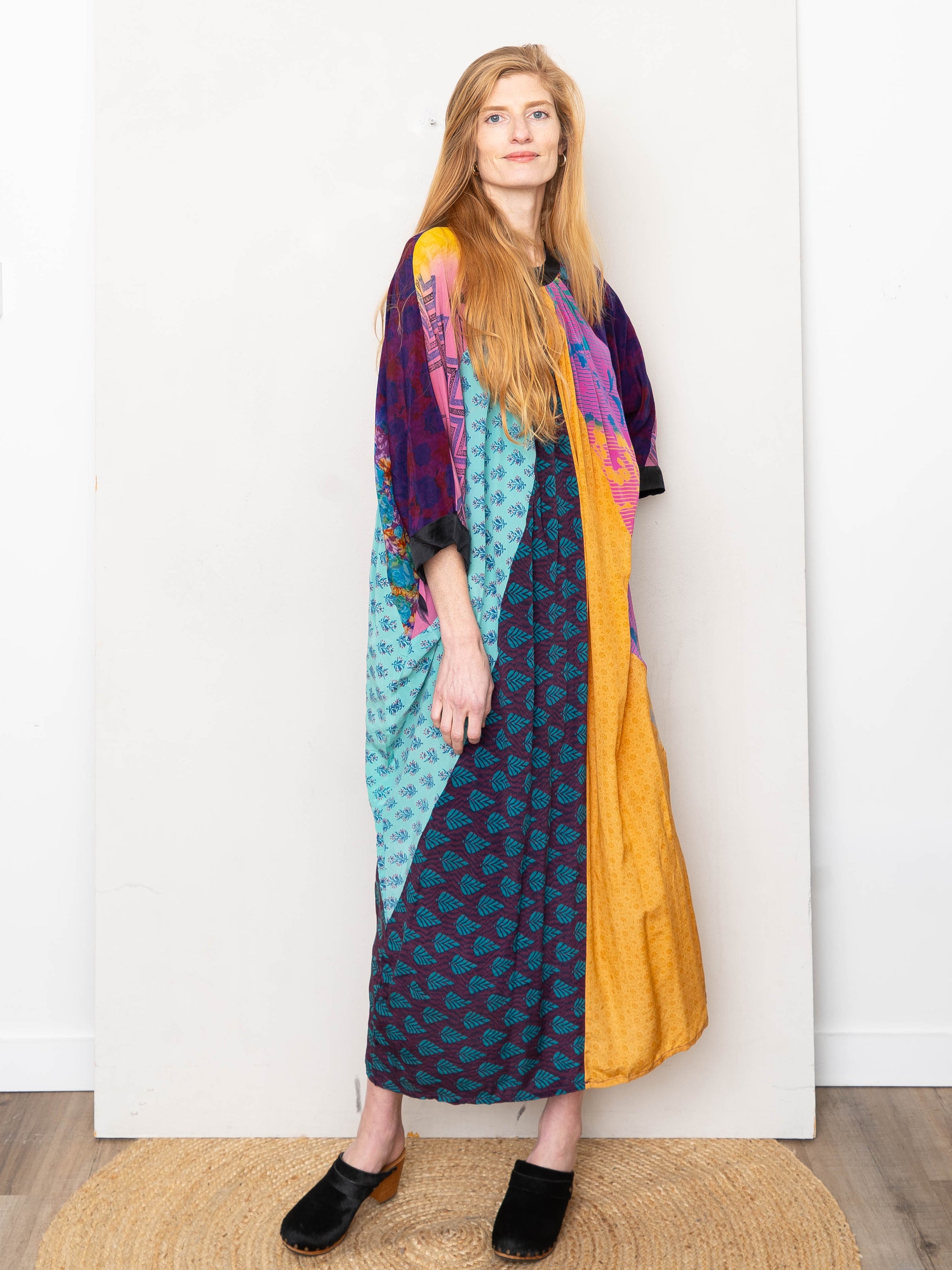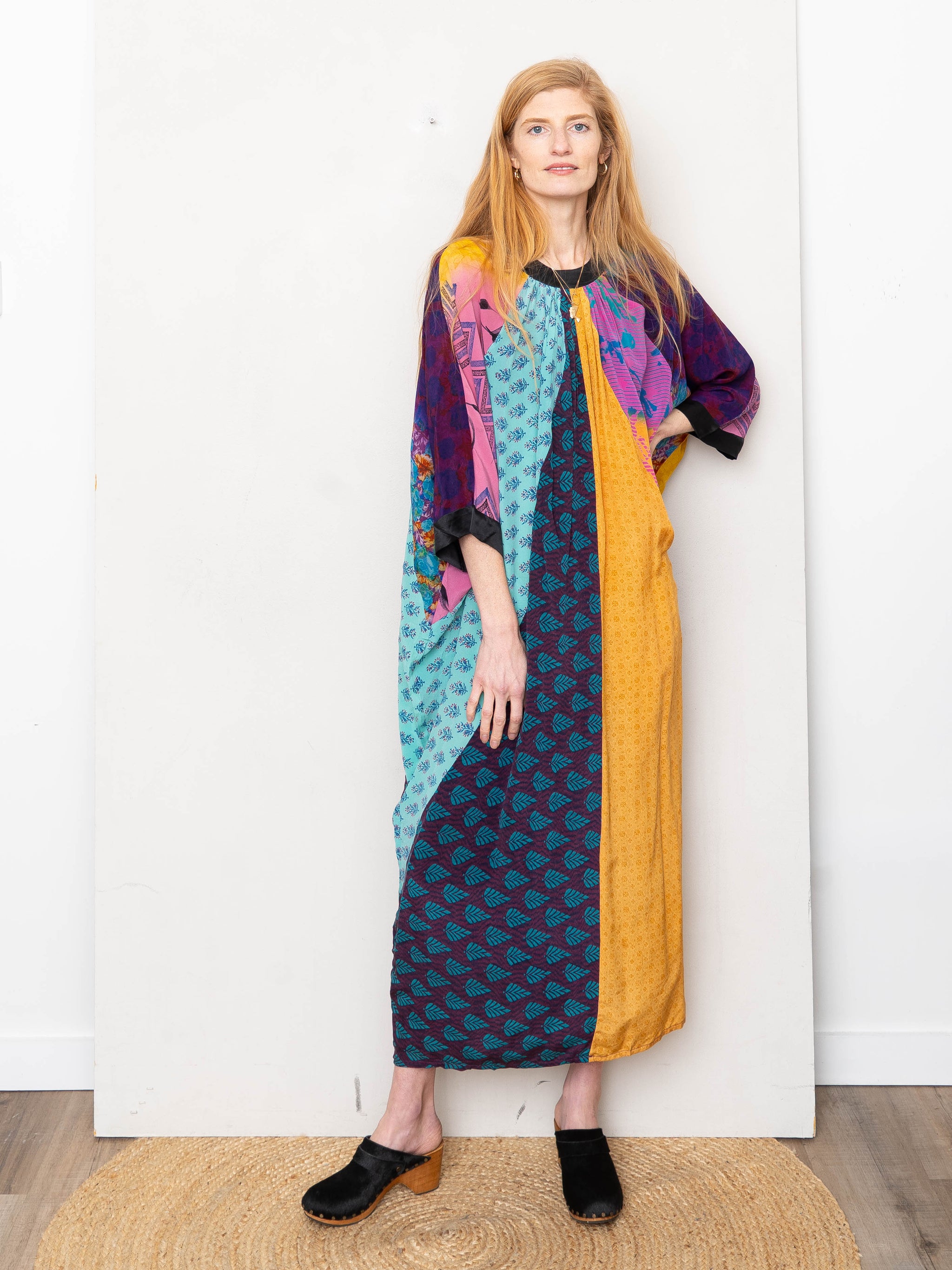 The Simmy Dress is a loose, flowy silhouette crafted from recycled silk saris—each hand-selected and thoughtfully pieced together from up to six different prints. Designed with an asymmetric gathered detail and invisible back zipper, every top is one-of-a-kind and never repeated. Easy to wear, easy to tailor, and made to celebrate pattern and play.