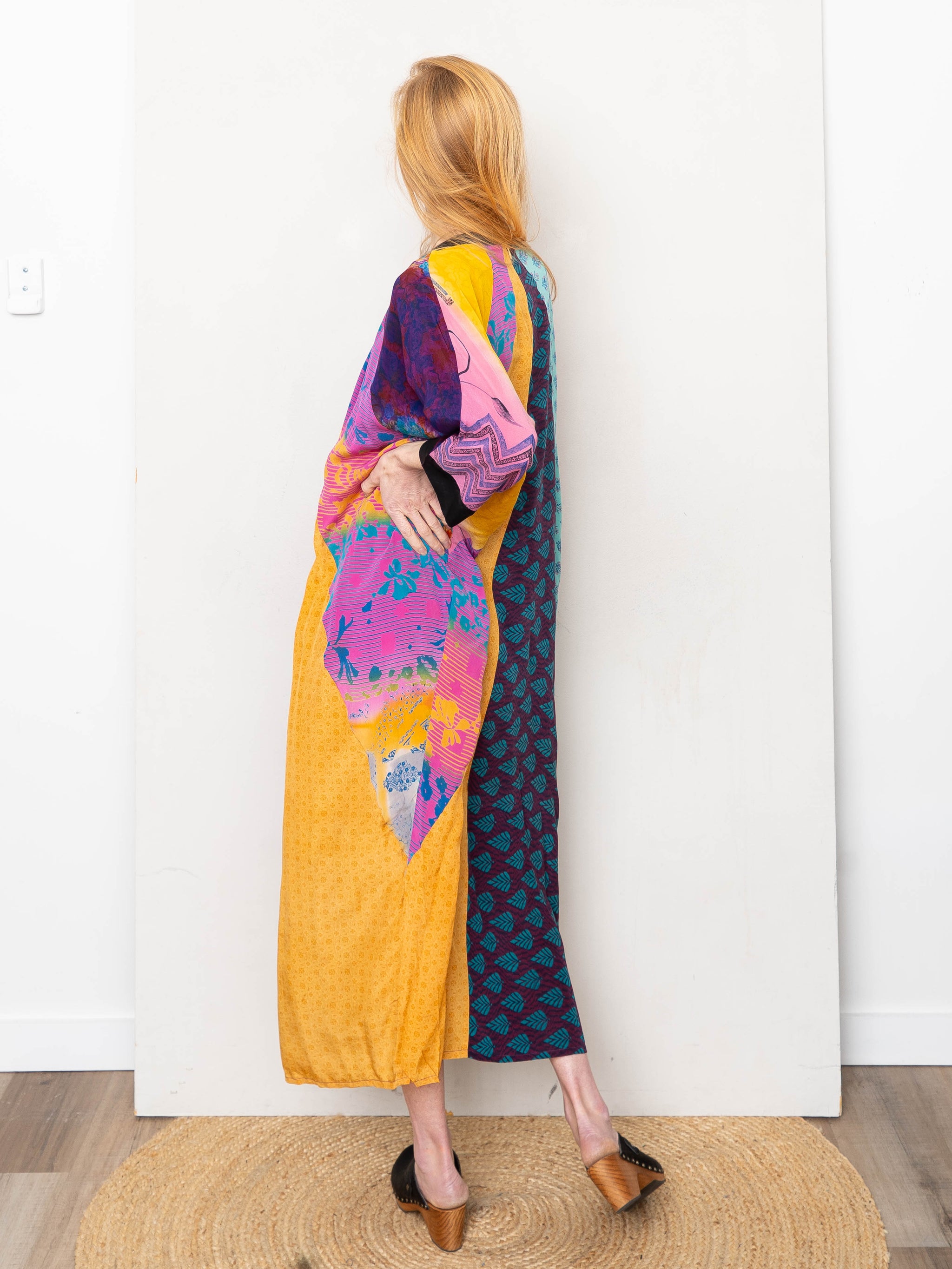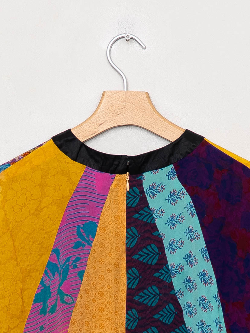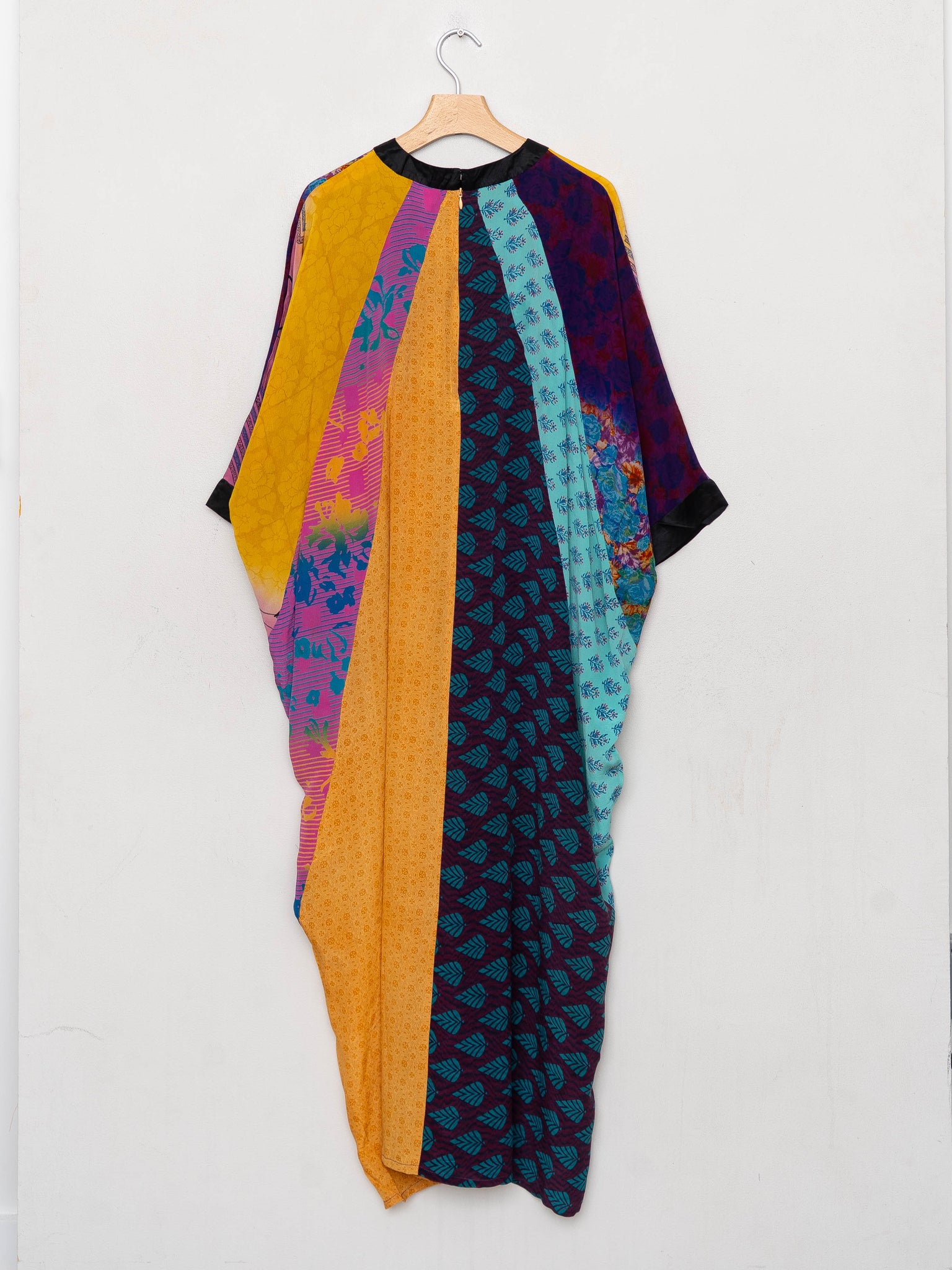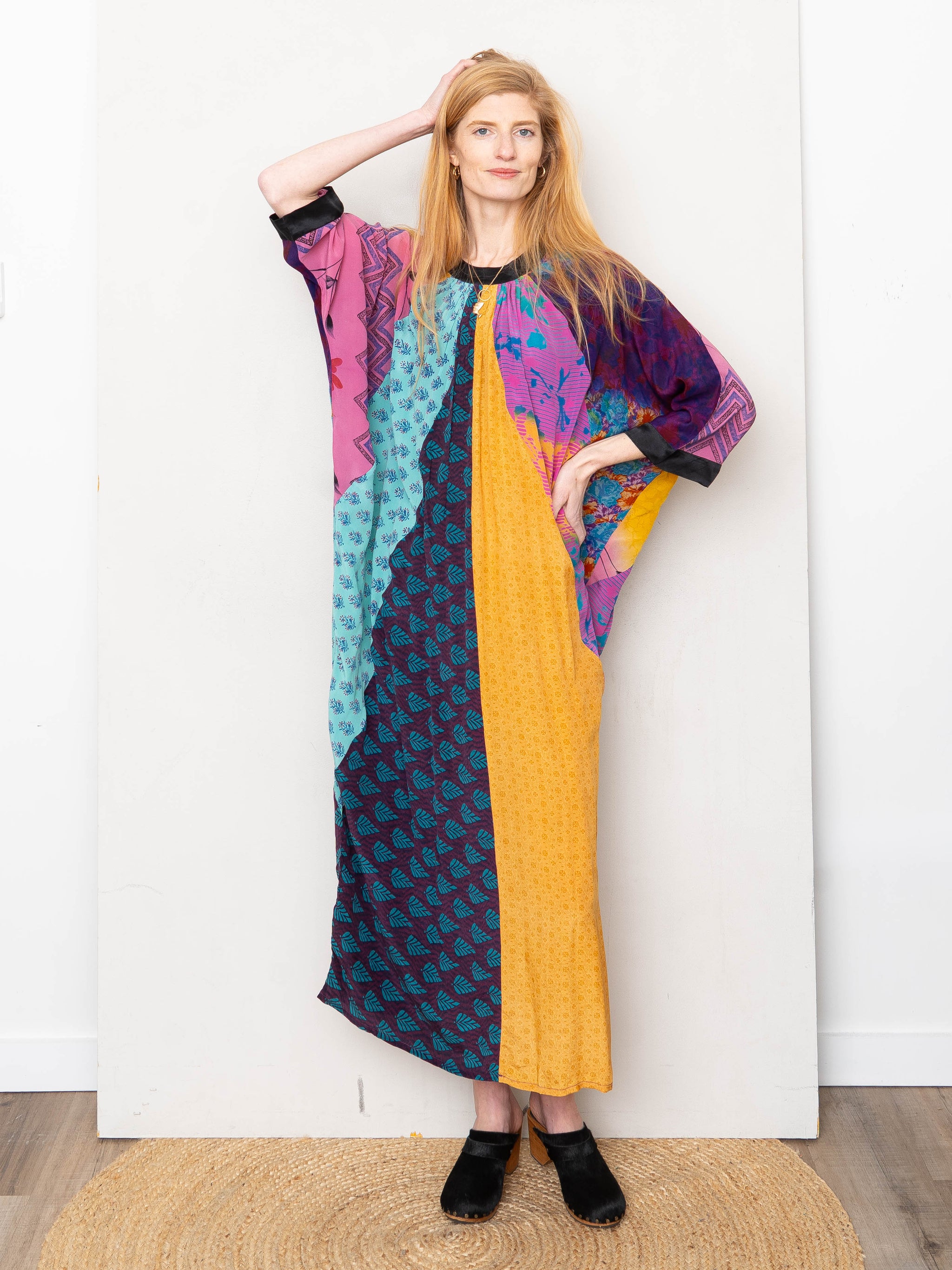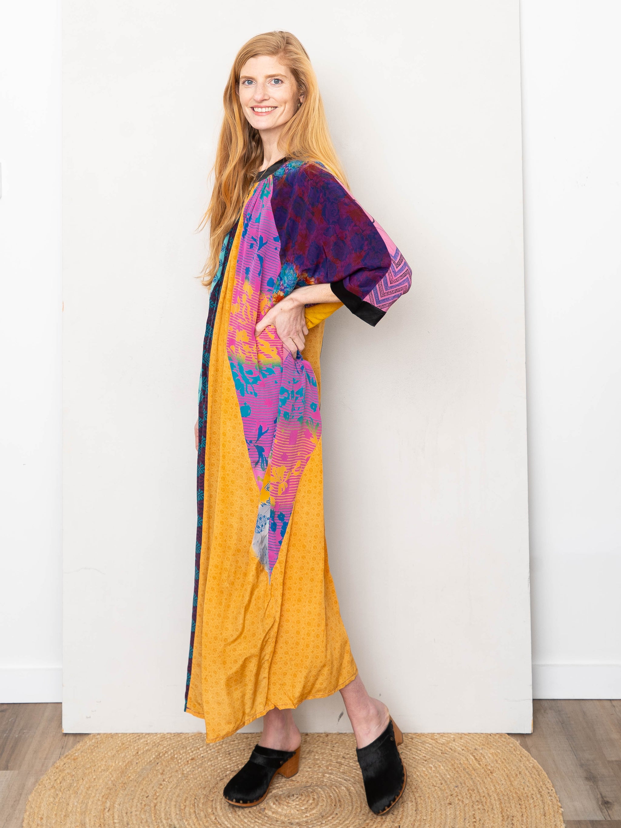 The Simmy Dress is a loose, flowy silhouette crafted from recycled silk saris—each hand-selected and thoughtfully pieced together from up to six different prints. Designed with an asymmetric gathered detail and invisible back zipper, every top is one-of-a-kind and never repeated. Easy to wear, easy to tailor, and made to celebrate pattern and play.