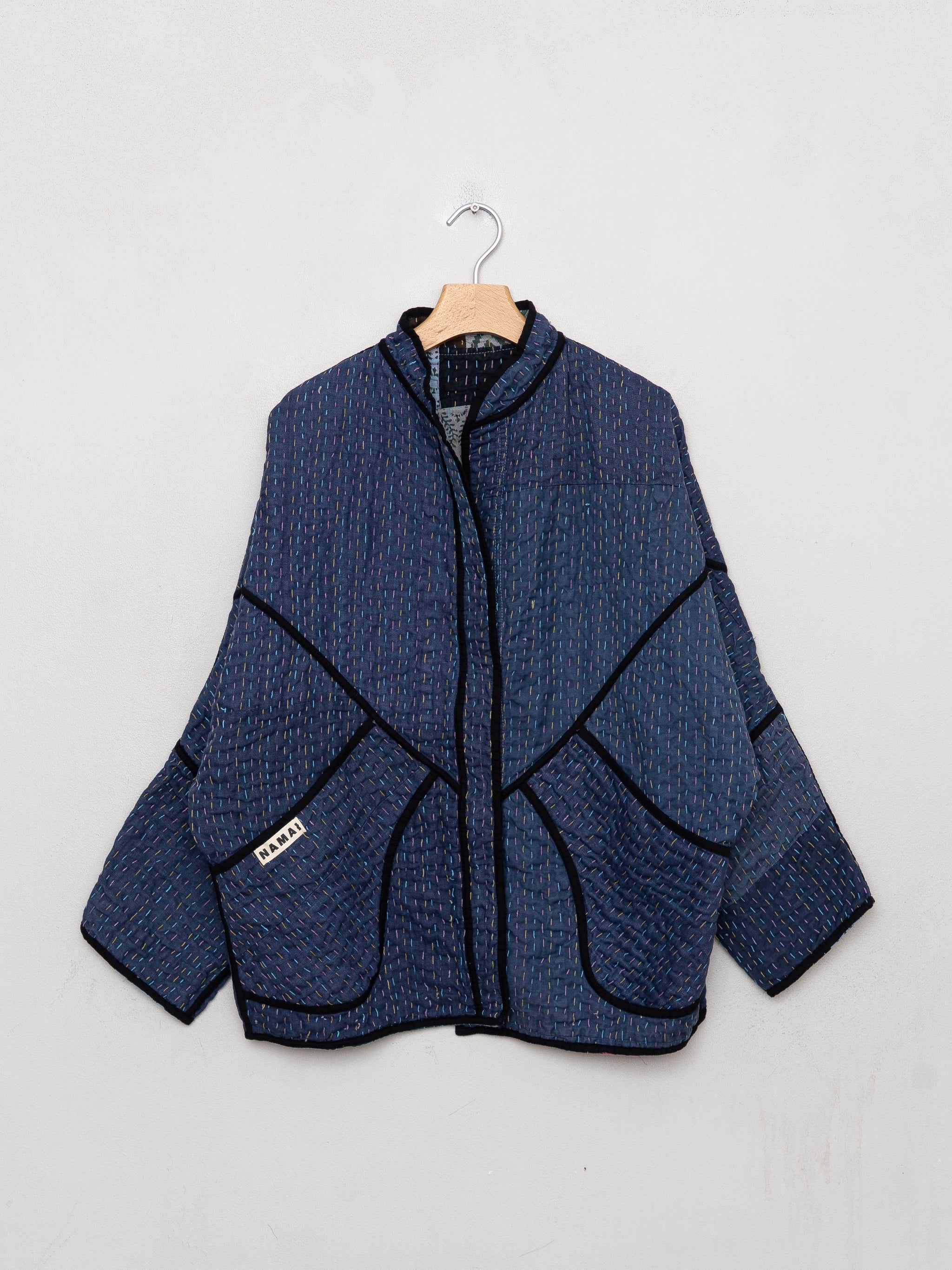 The Ishani Jacket is an easy, oversized style that falls just below the hip with a relaxed, open and buttonless front. Made from vintage Kantha quilts and fully reversible with roomy pockets on both sides, each piece is completely one of a kind. Thoughtfully finished with rollable sleeves, a mandarin collar, and cotton bias binding that highlights the jacket’s unique seamwork.