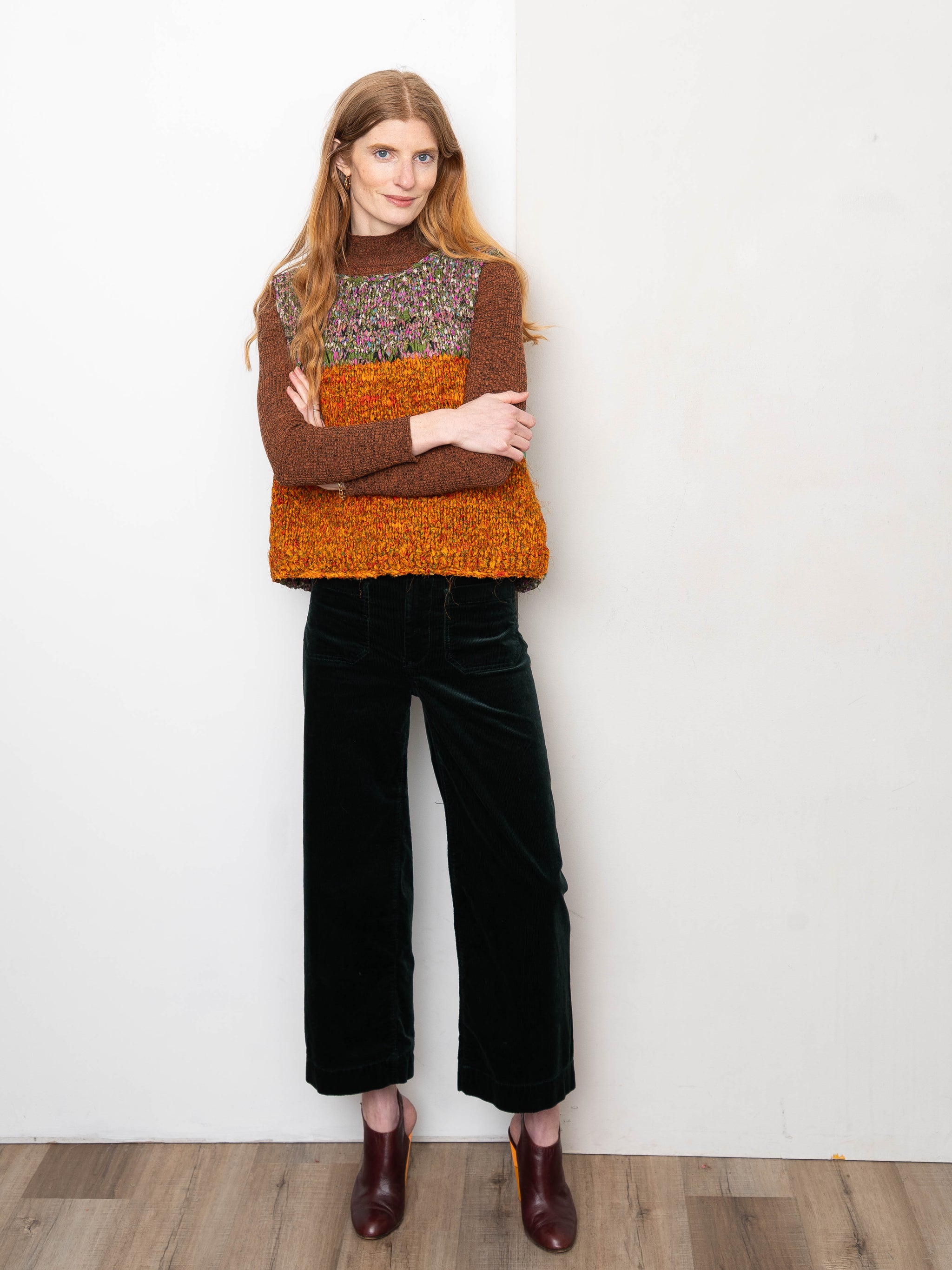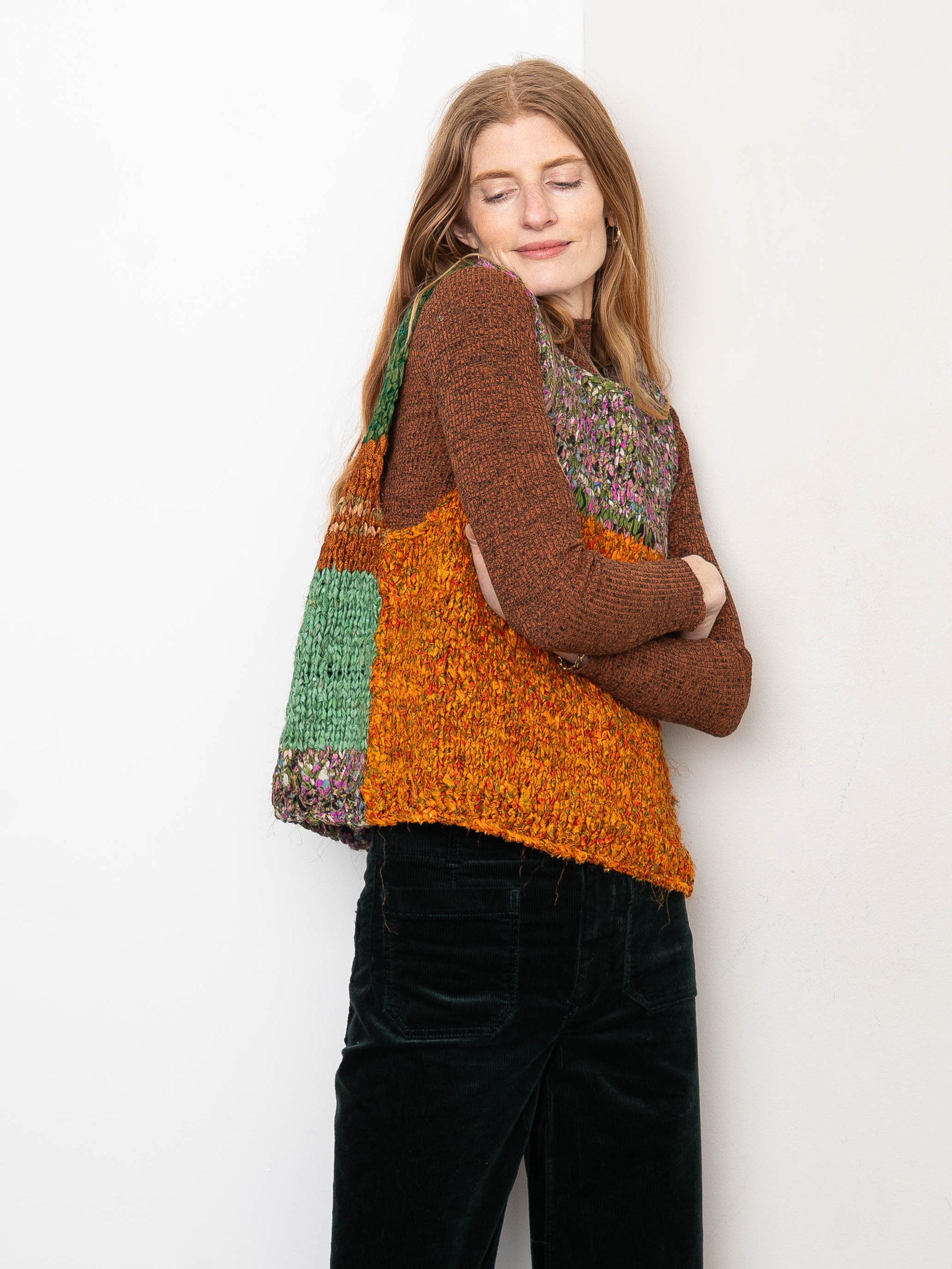 The Vishnu Vest is a crew neck style, chunky knit made out of strips of recycled sari silk. The recycled silk is torn into strips and hand knitted. Each one is completely handcrafted and no two are alike.