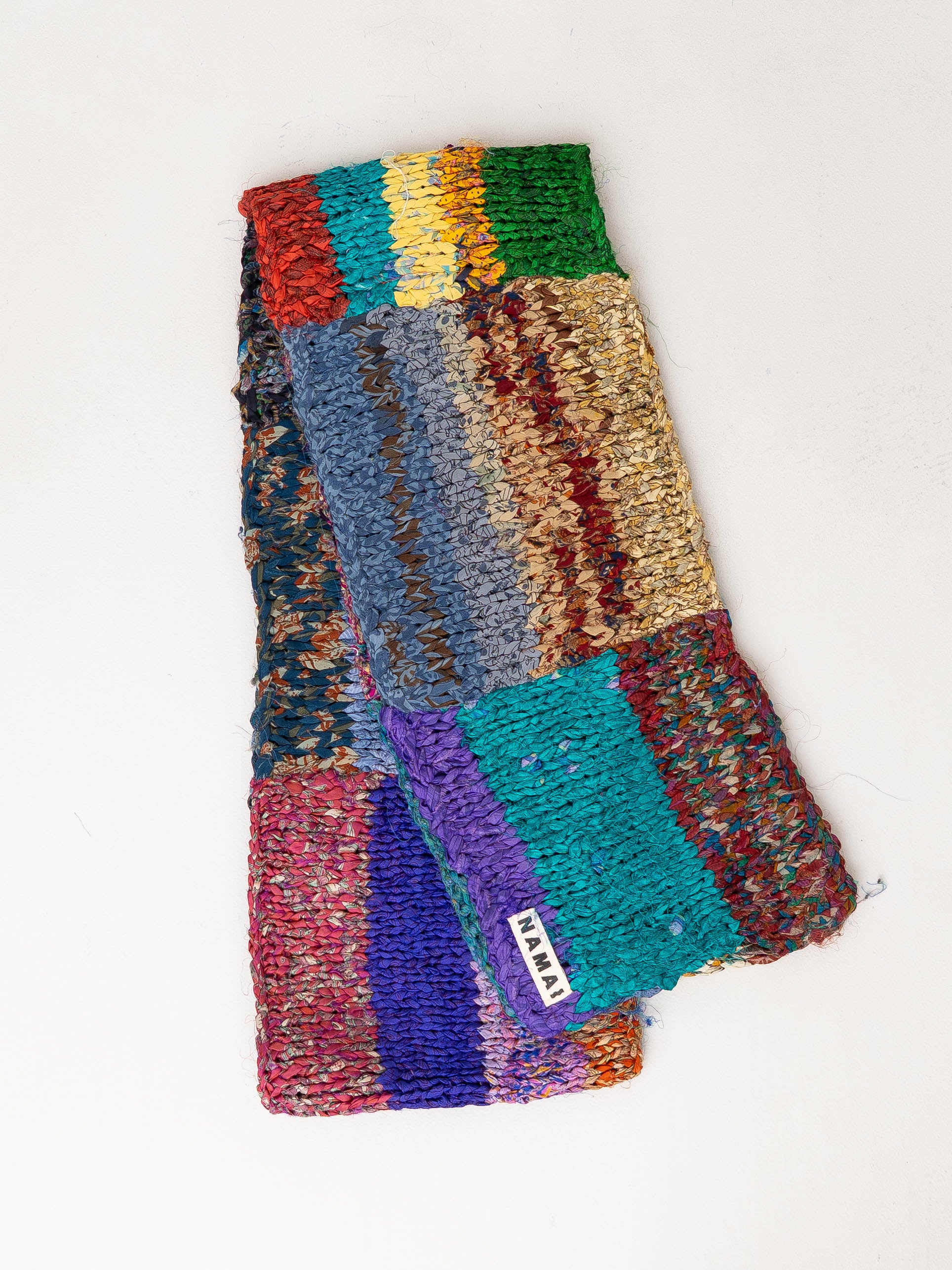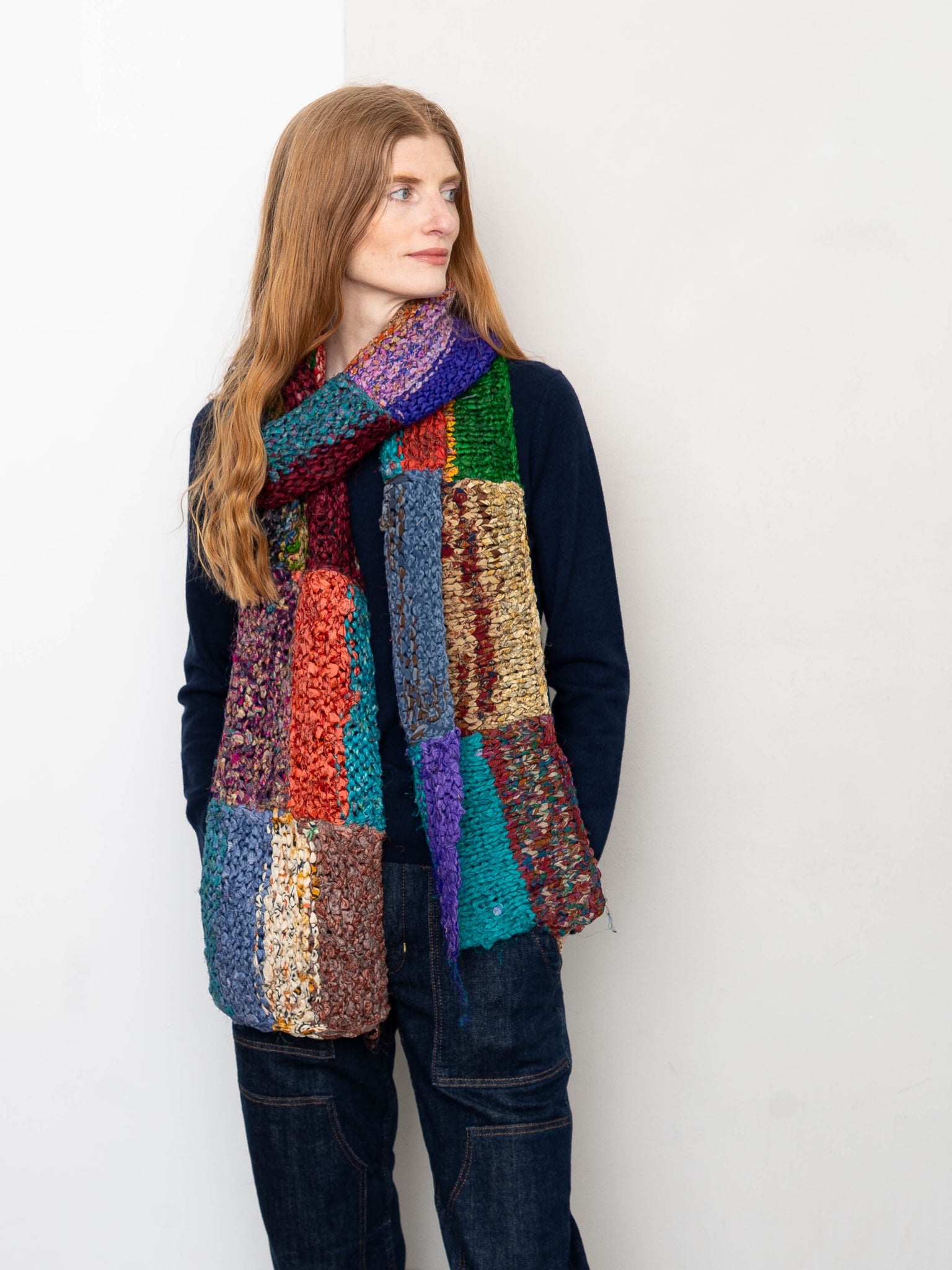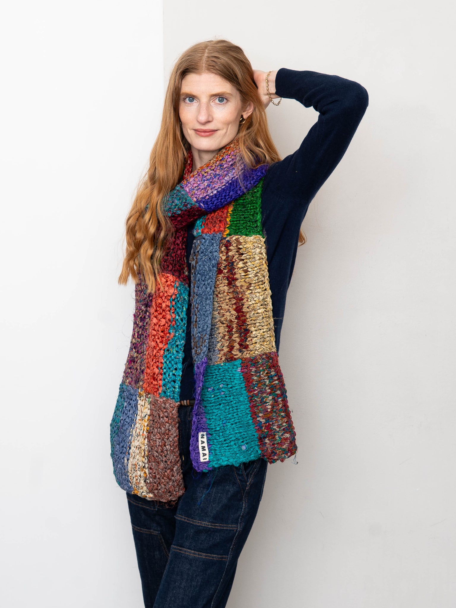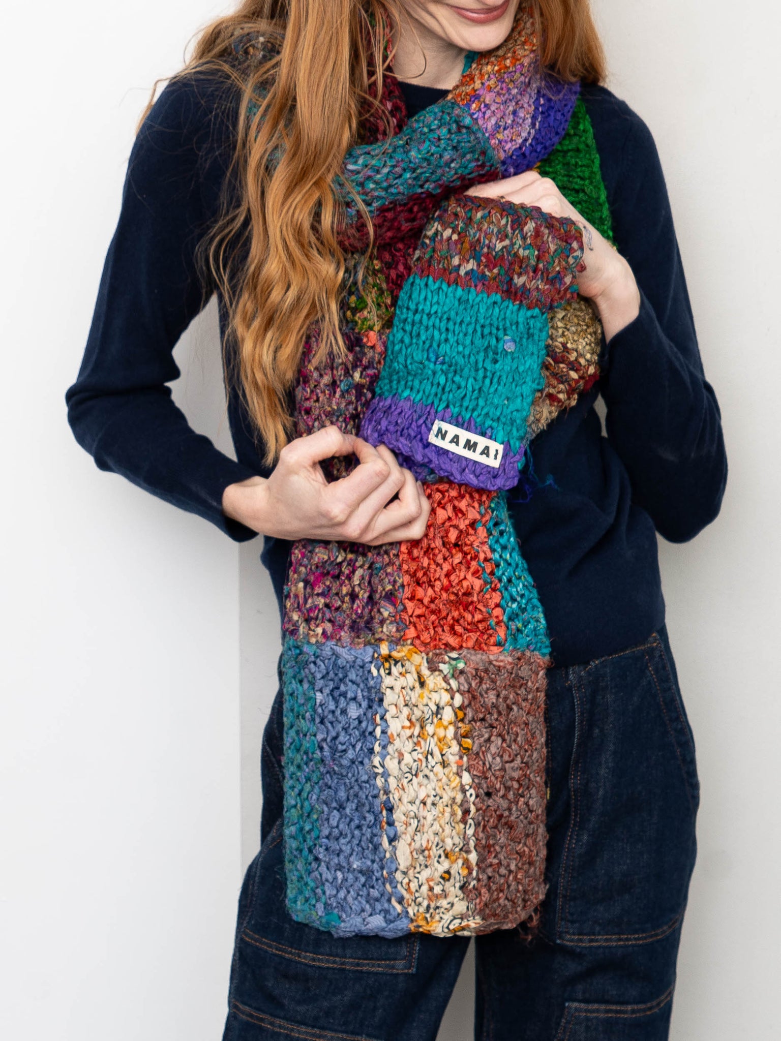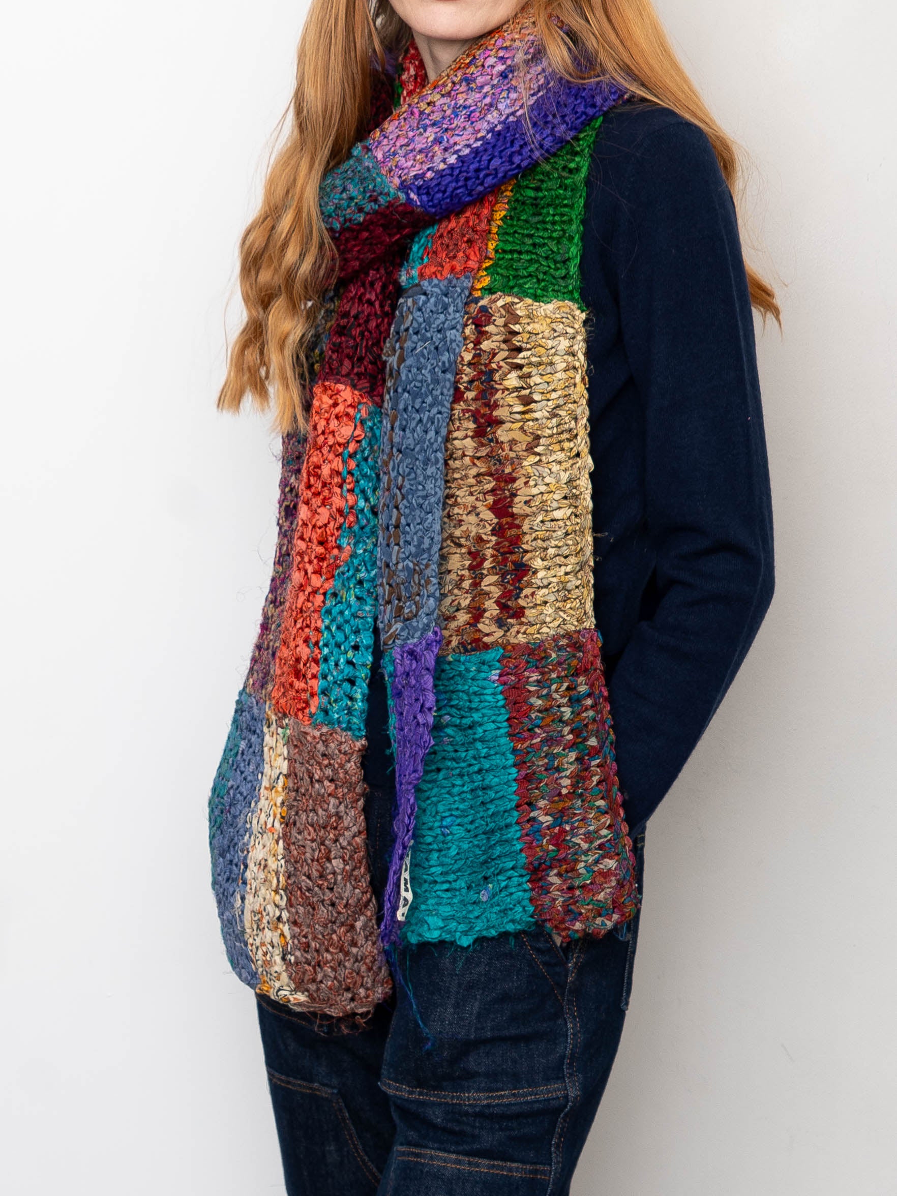 The Vishnu Scarf is a chunky knit made out of strips of recycled sari silk. The recycled silk is torn into strips and hand knitted. Each one is completely handcrafted and no two are alike.