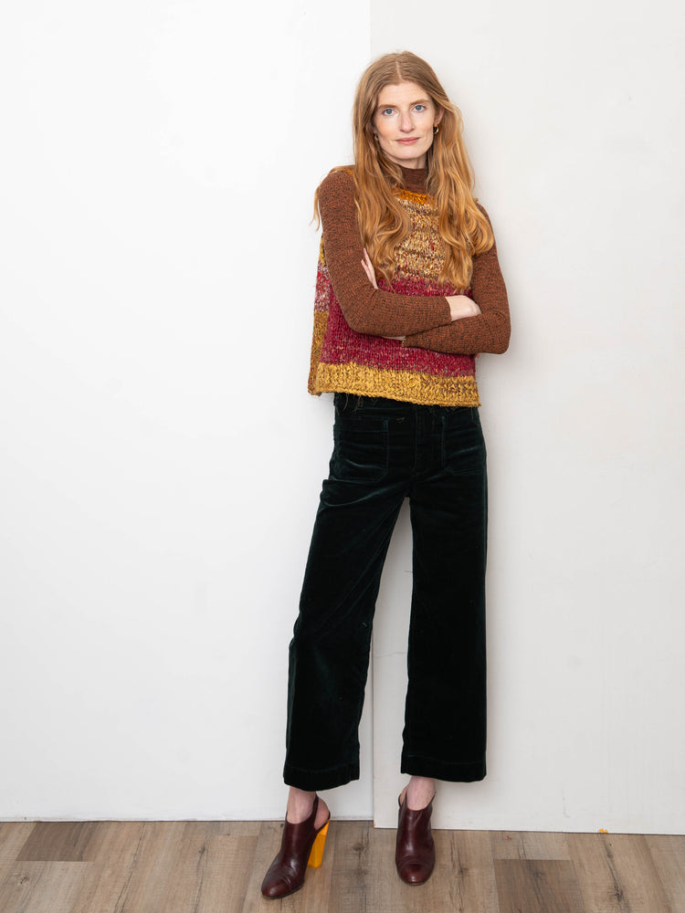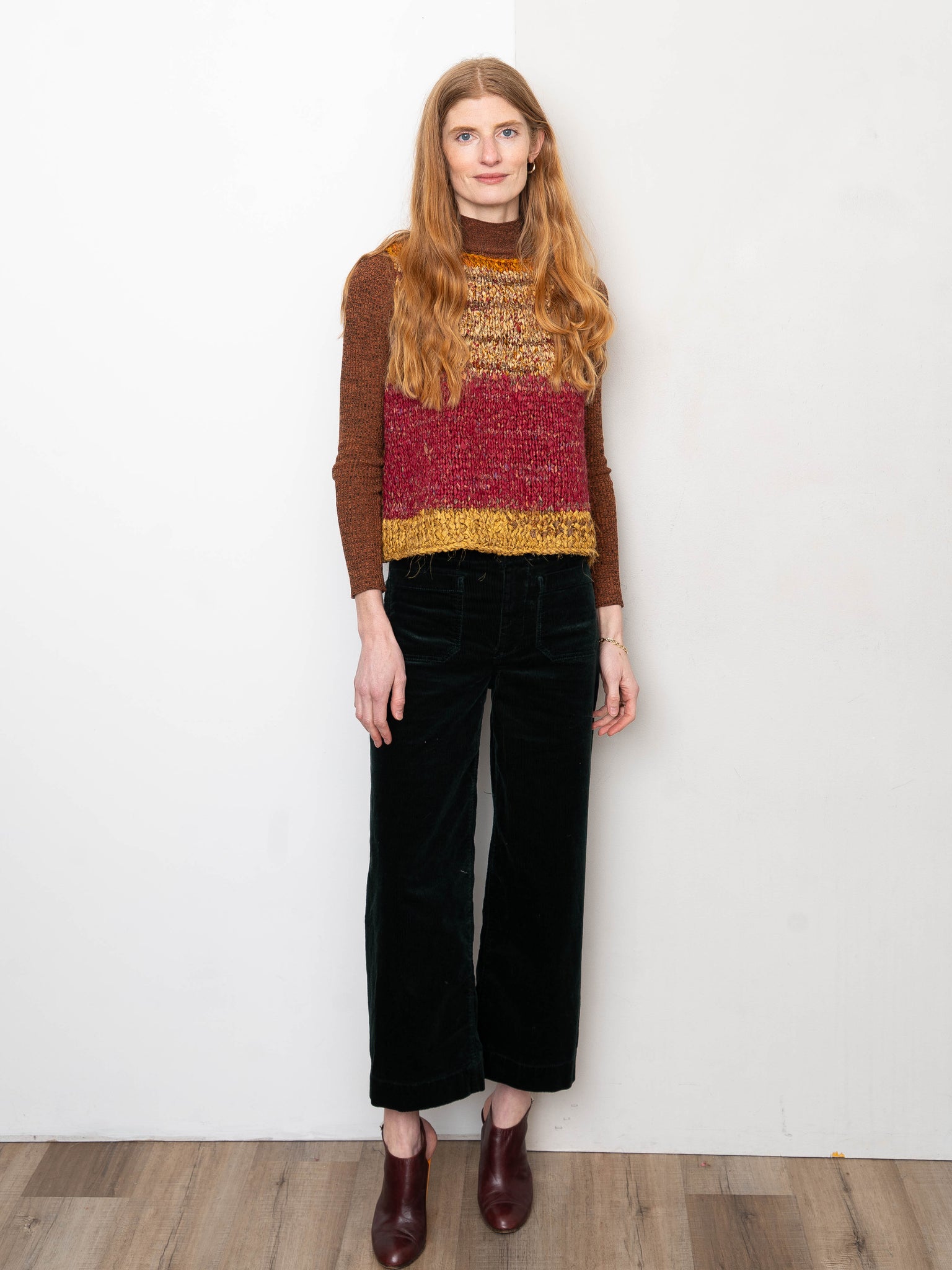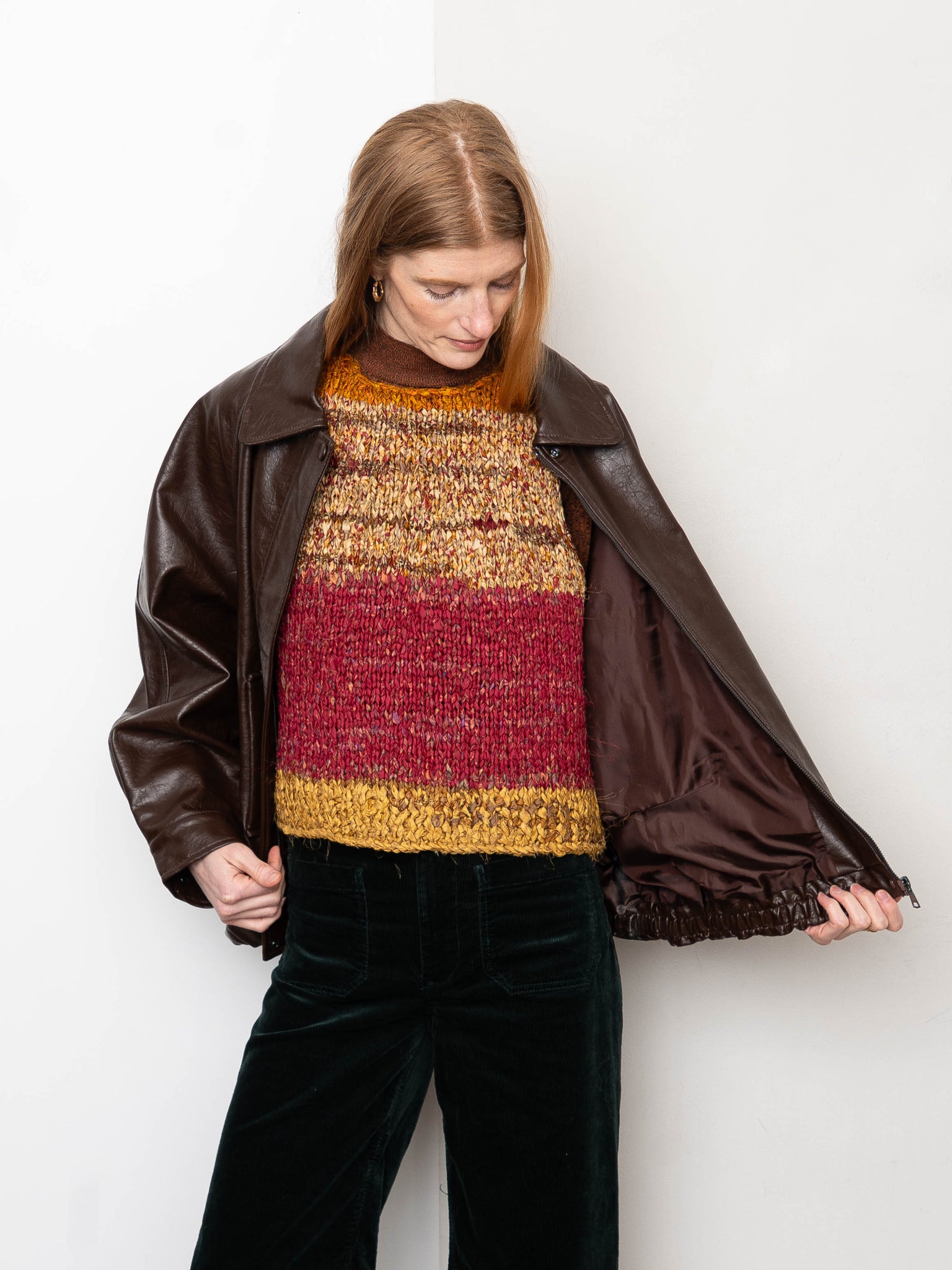 The Vishnu Vest is a crew neck style, chunky knit made out of strips of recycled sari silk. The recycled silk is torn into strips and hand knitted. Each one is completely handcrafted and no two are alike.