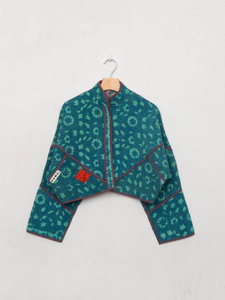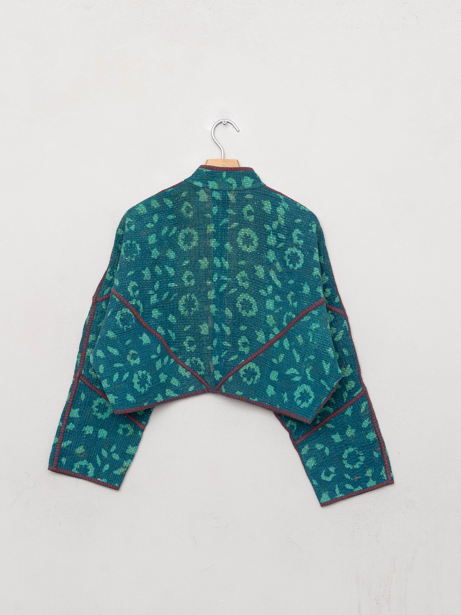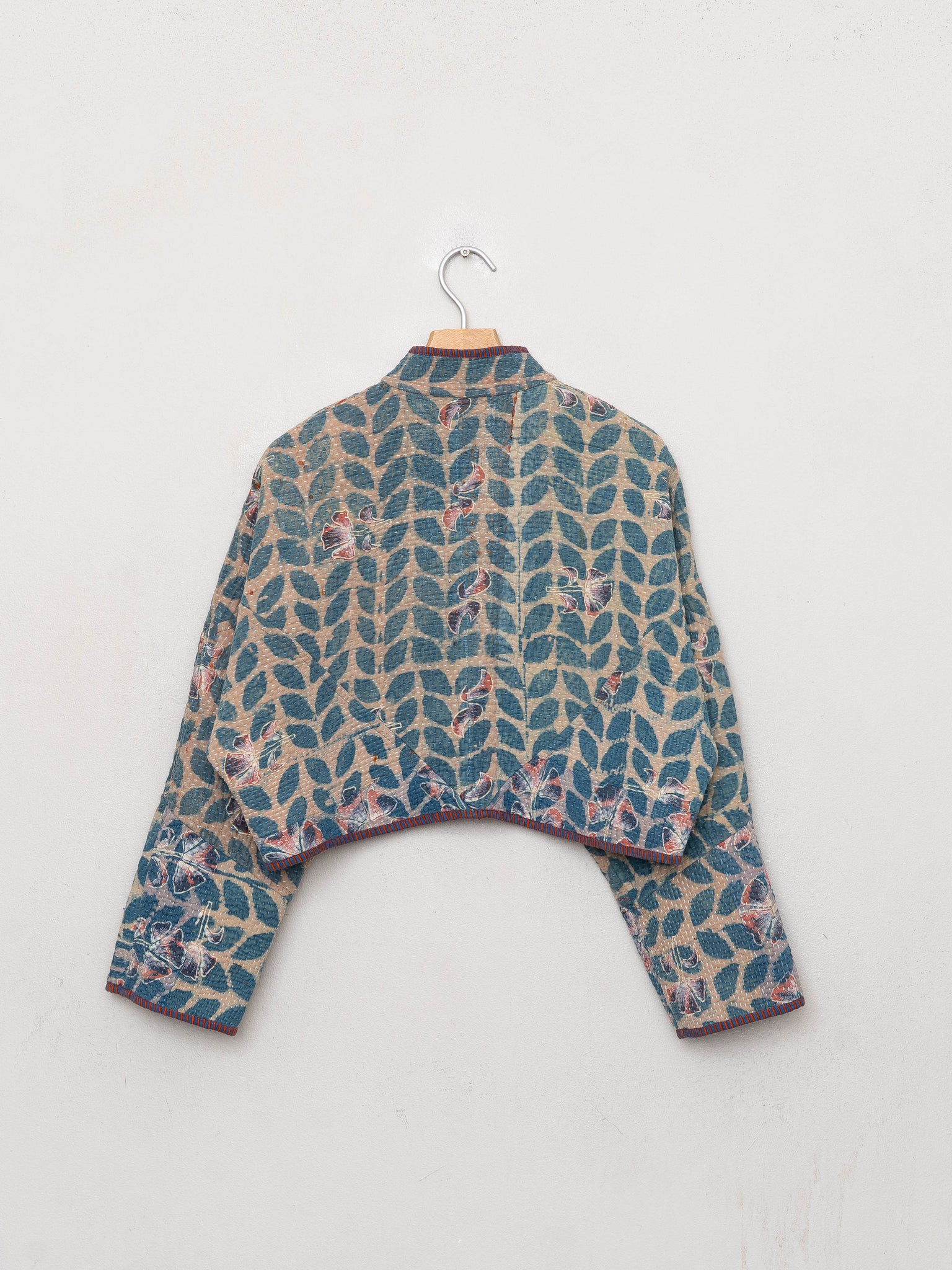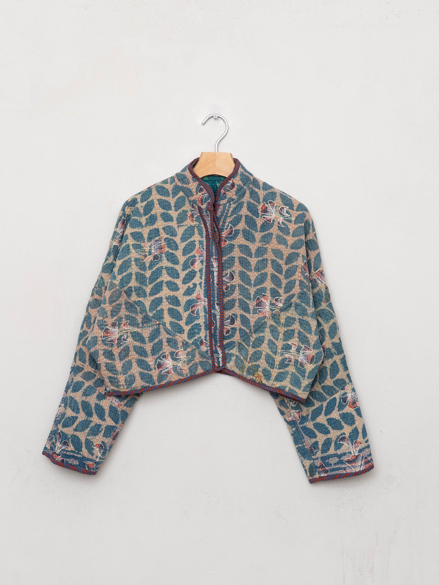 • The Kaira Jacket is a fully reversible cropped quilted jacket made from vintage Kantha quilts, each with its own stitching, layout, and patina (signs of age). Its boxy silhouette, mandarin collar, and rollable sleeves create a clean, modern shape that stands apart from mass-market cropped jacket styles.
