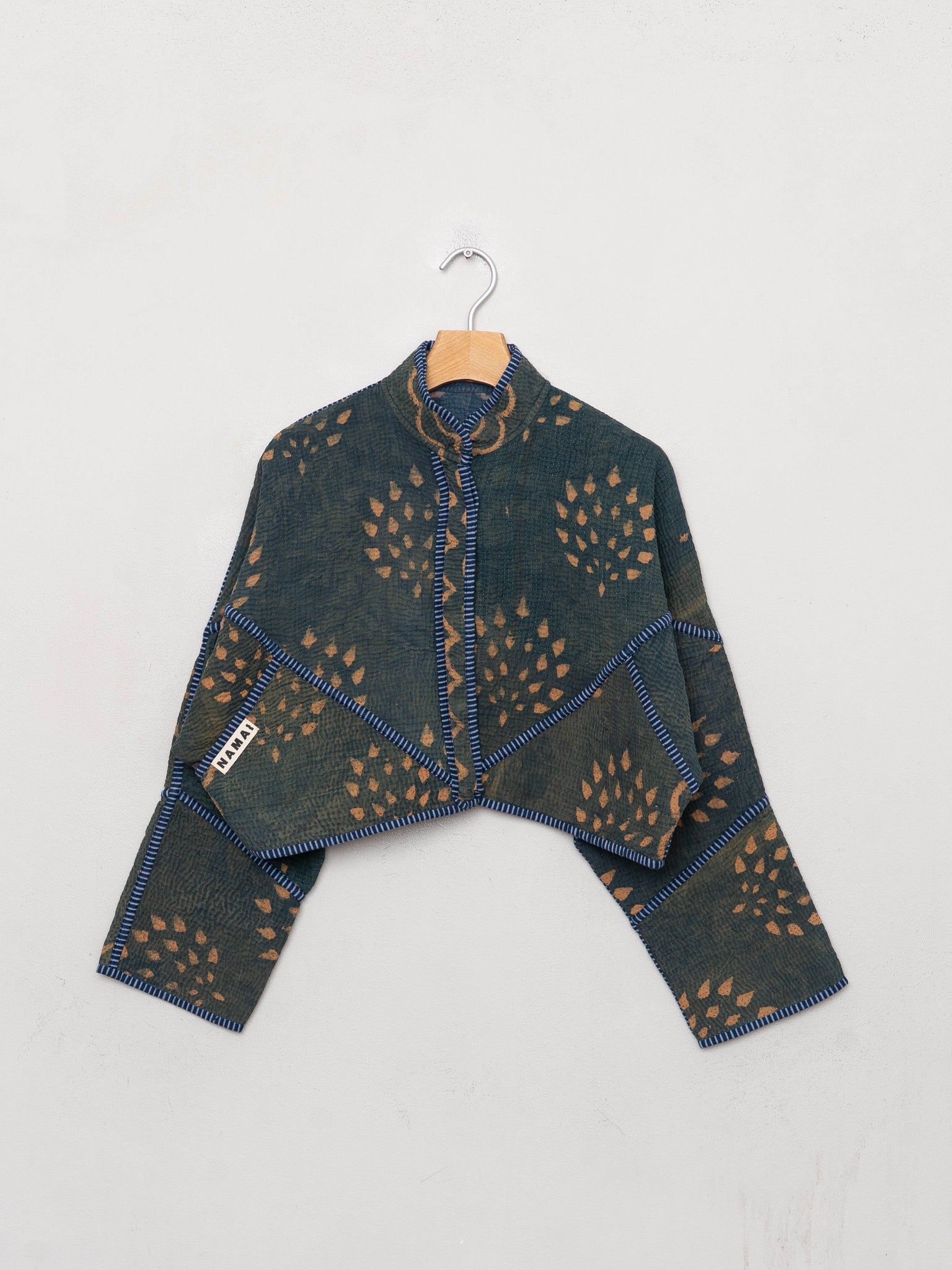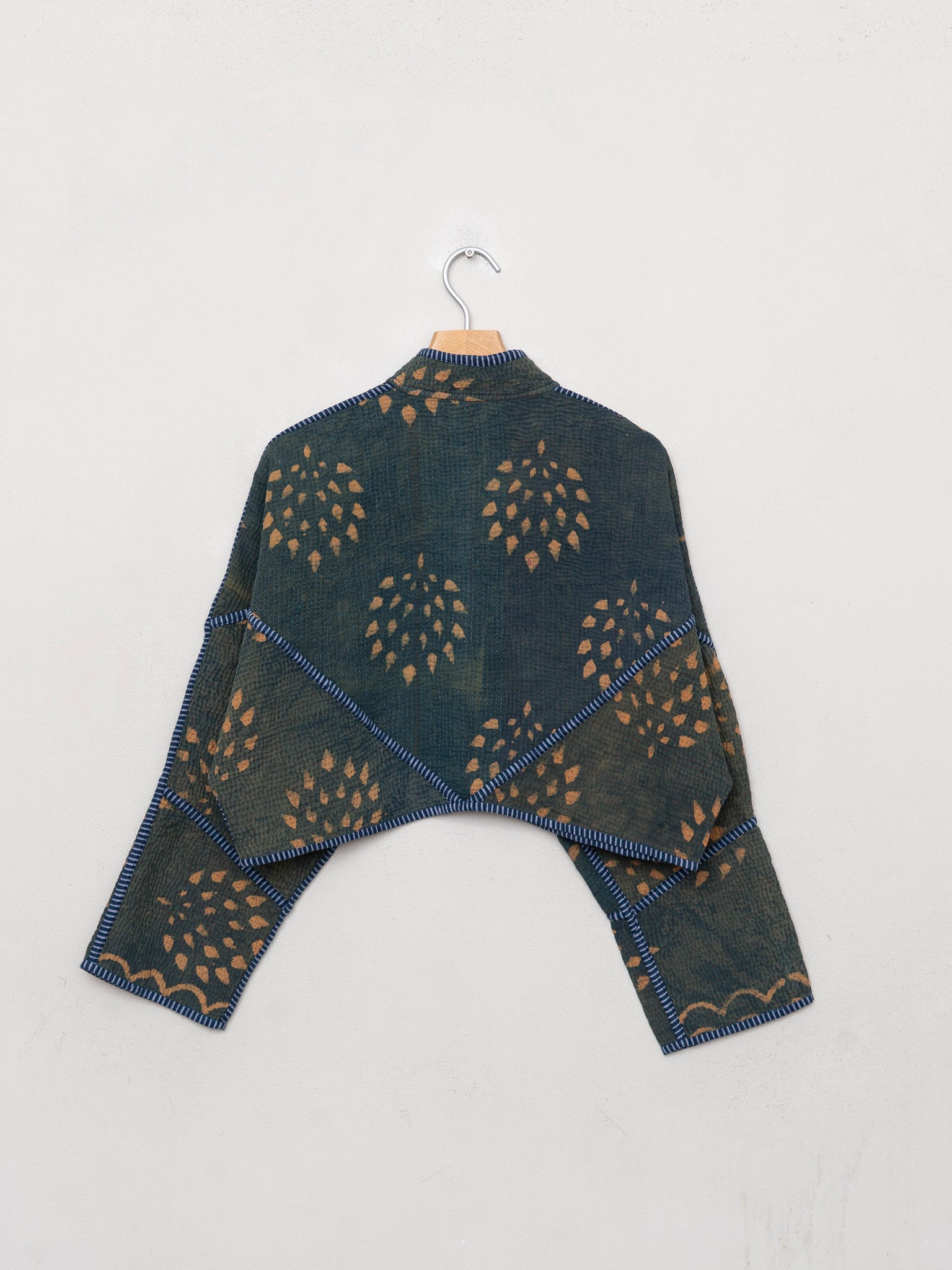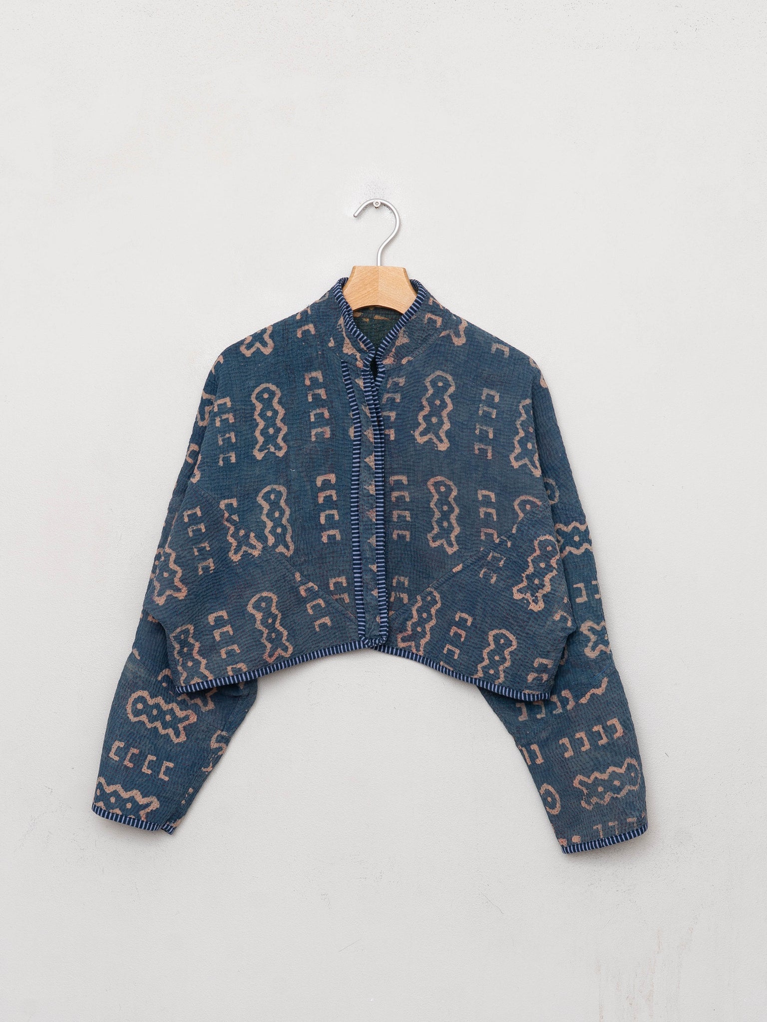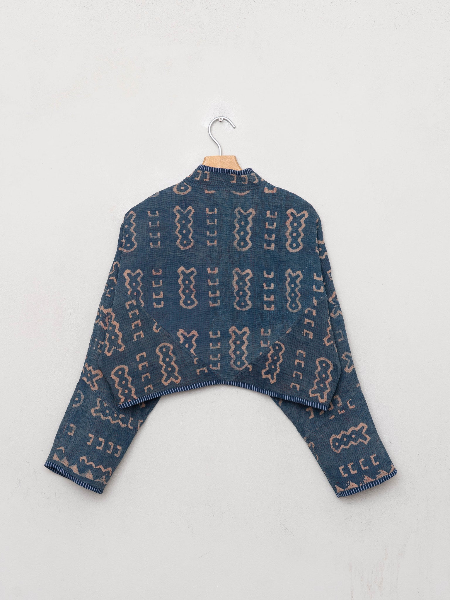 • The Kaira Jacket is a fully reversible cropped quilted jacket made from vintage Kantha quilts, each with its own stitching, layout, and patina (signs of age). Its boxy silhouette, mandarin collar, and rollable sleeves create a clean, modern shape that stands apart from mass-market cropped jacket styles.