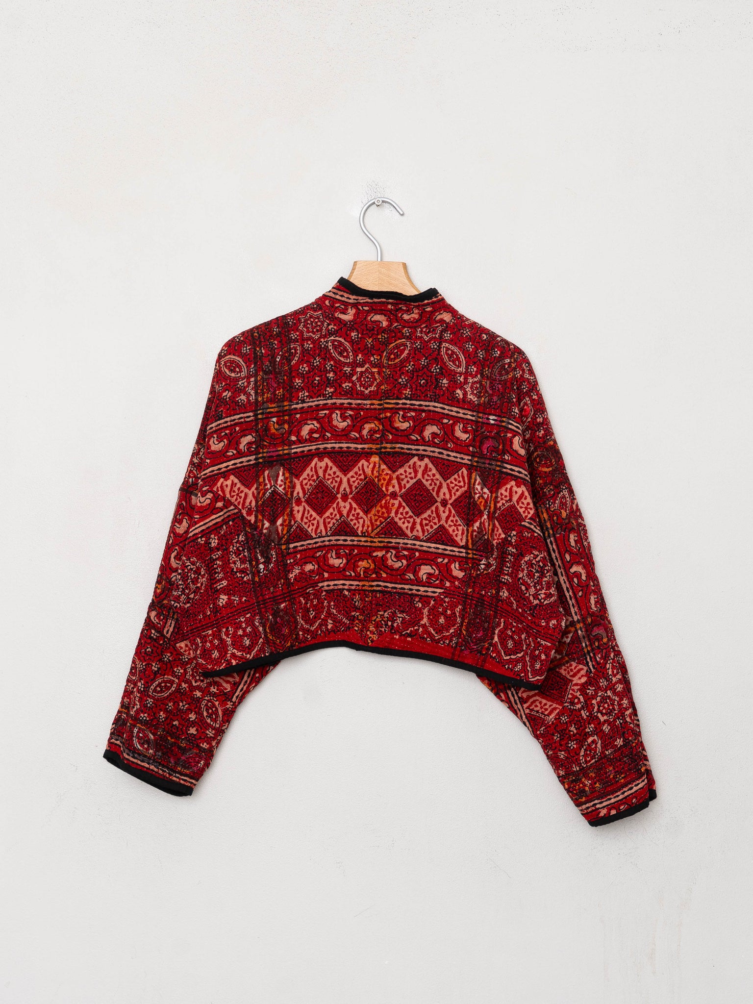 The Kaira Cropped Jacket is a relaxed, cropped jacket with a boxy silhouette and easy, oversized fit. Fully reversible and made from vintage Kantha quilts, each piece is completely one of a kind—no two are alike. Designed with thoughtful details like coconut shell buttons on both sides, a mandarin collar, and rollable sleeves to reveal the contrast interior.