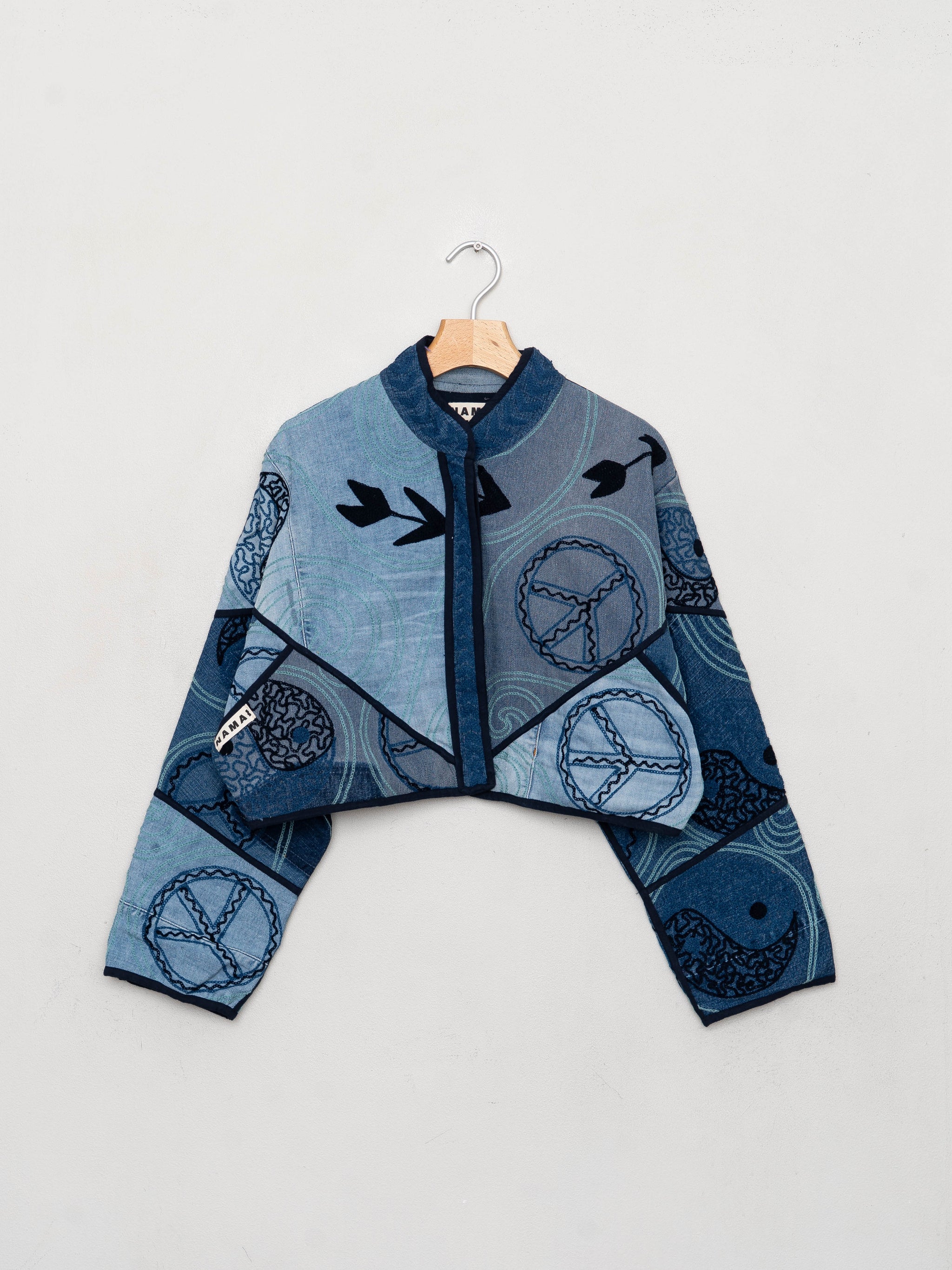 • The Kaira Jacket is a fully reversible cropped quilted jacket made from vintage Kantha quilts, each with its own stitching, layout, and patina (signs of age). Its boxy silhouette, mandarin collar, and rollable sleeves create a clean, modern shape that stands apart from mass-market cropped jacket styles.