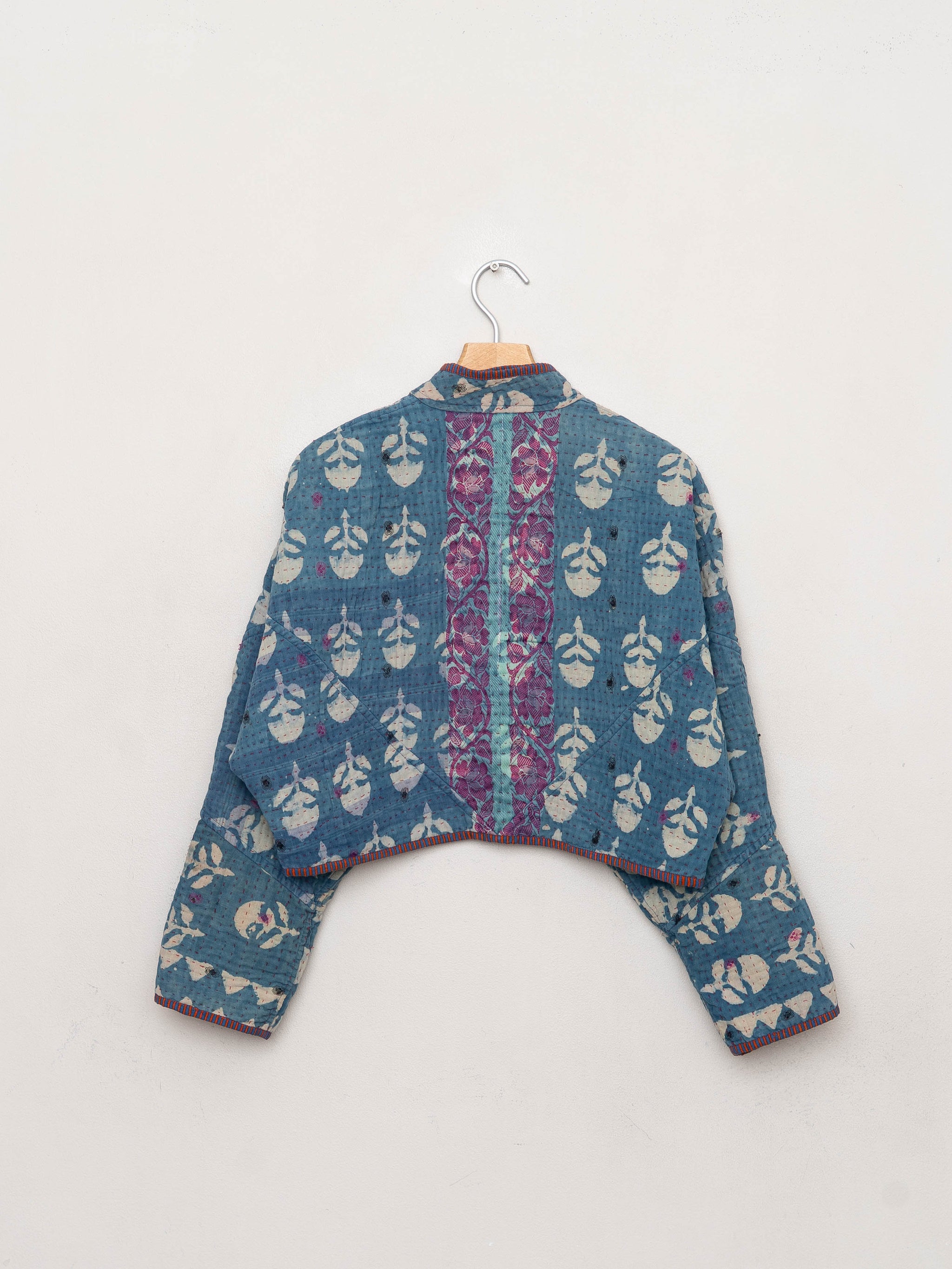 • The Kaira Jacket is a fully reversible cropped quilted jacket made from vintage Kantha quilts, each with its own stitching, layout, and patina (signs of age). Its boxy silhouette, mandarin collar, and rollable sleeves create a clean, modern shape that stands apart from mass-market cropped jacket styles.