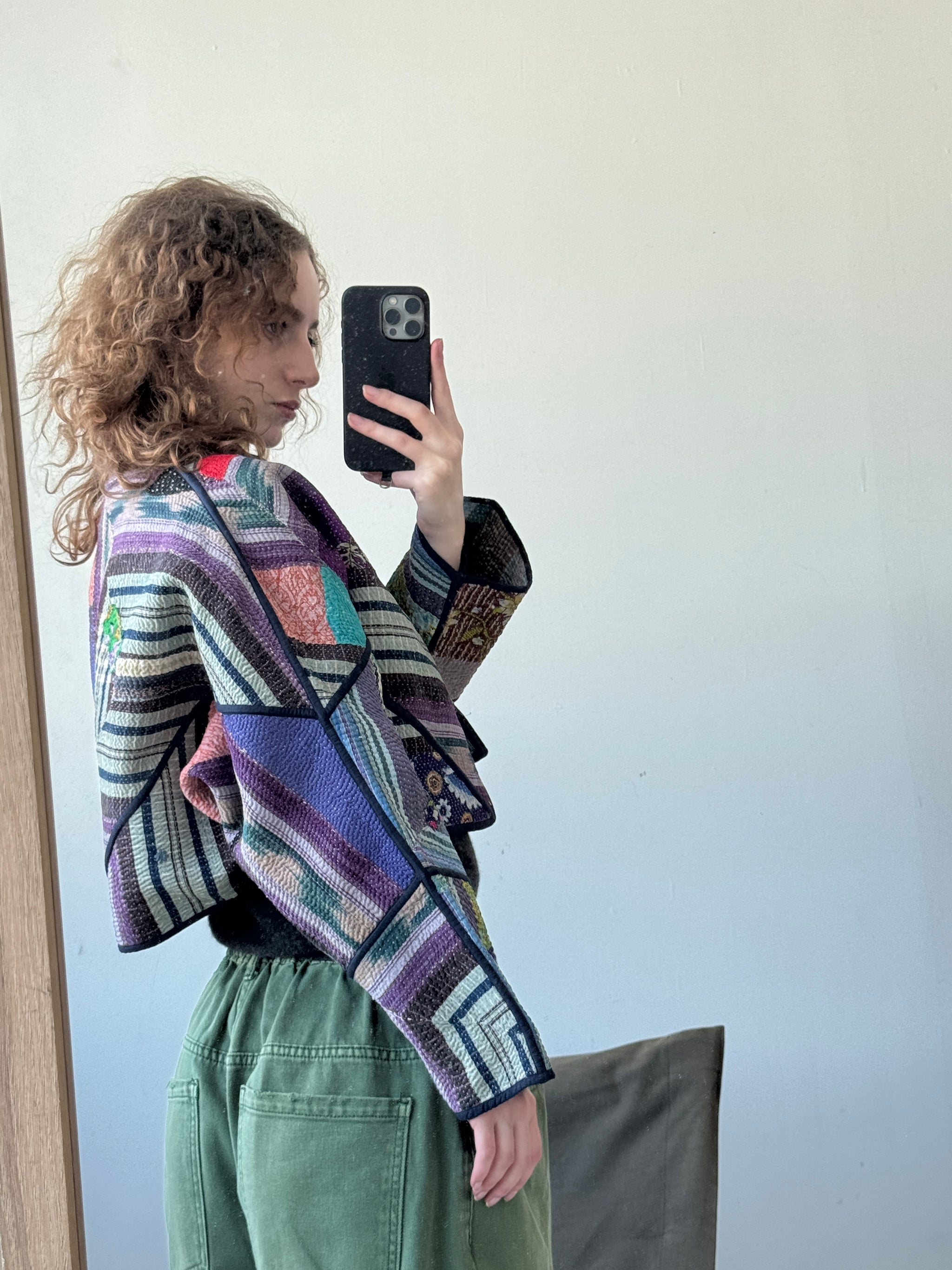 • The Kaira Jacket is a fully reversible cropped quilted jacket made from vintage Kantha quilts, each with its own stitching, layout, and patina (signs of age). Its boxy silhouette, mandarin collar, and rollable sleeves create a clean, modern shape that stands apart from mass-market cropped jacket styles.