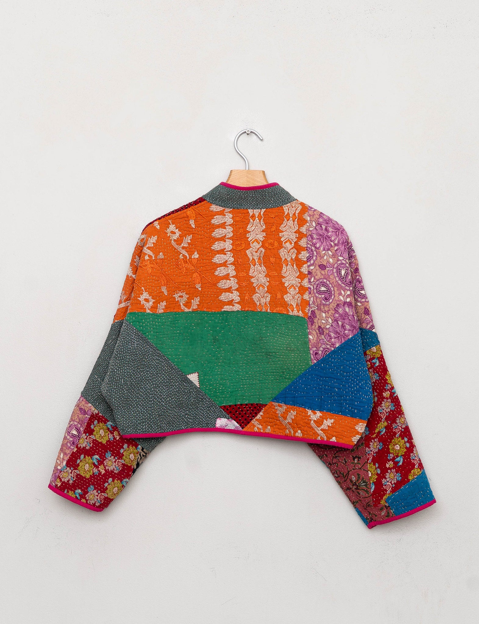 • The Kaira Jacket is a fully reversible cropped quilted jacket made from vintage Kantha quilts, each with its own stitching, layout, and patina (signs of age). Its boxy silhouette, mandarin collar, and rollable sleeves create a clean, modern shape that stands apart from mass-market cropped jacket styles.