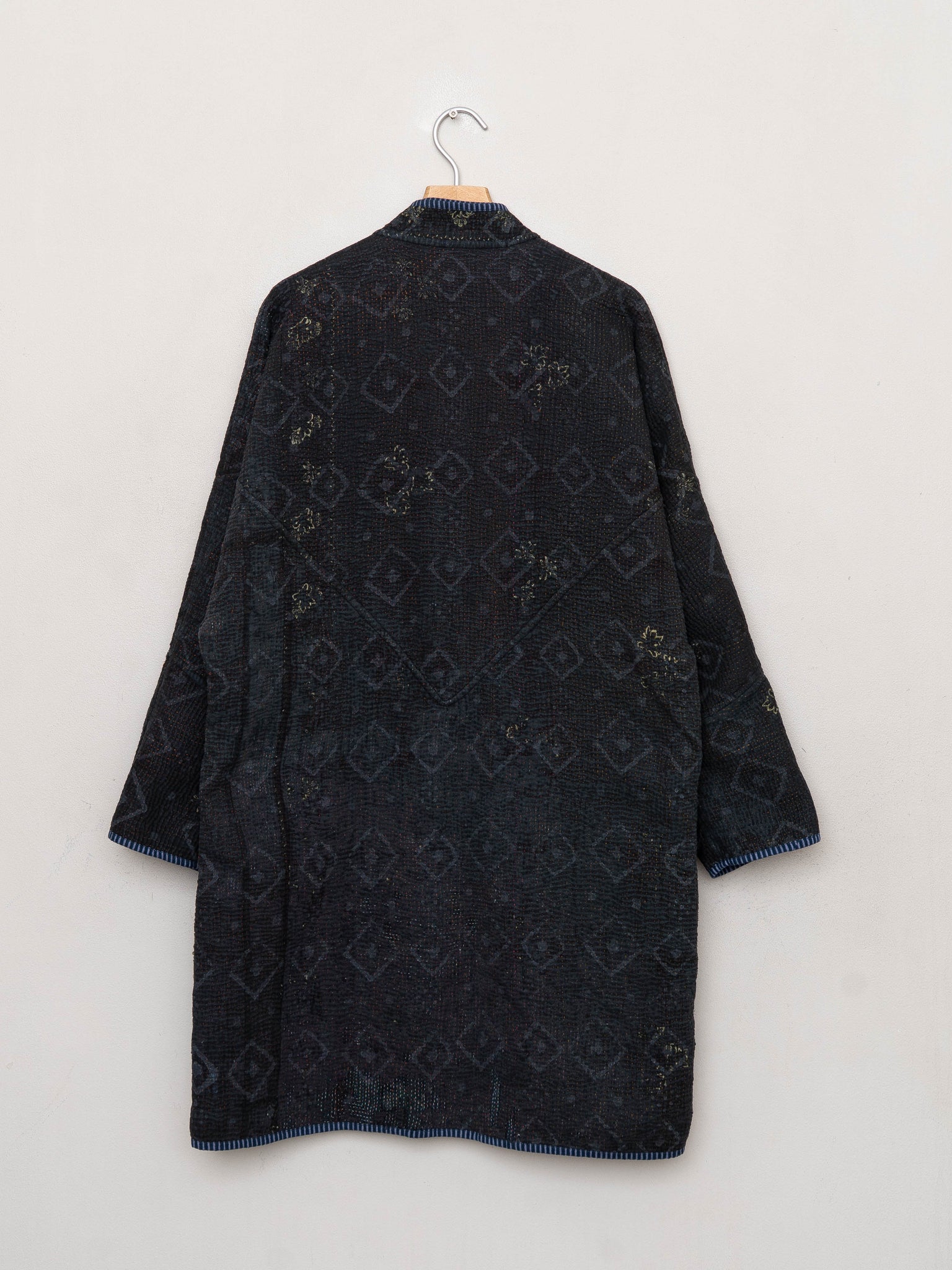 • The Sai Coat is a fully reversible long quilted jacket made from vintage Kantha quilts, finished with a double-sided collar stand, roomy pockets, and clean bias binding along the seams. Its longer silhouette offers a naturally expressive drape without feeling heavy.