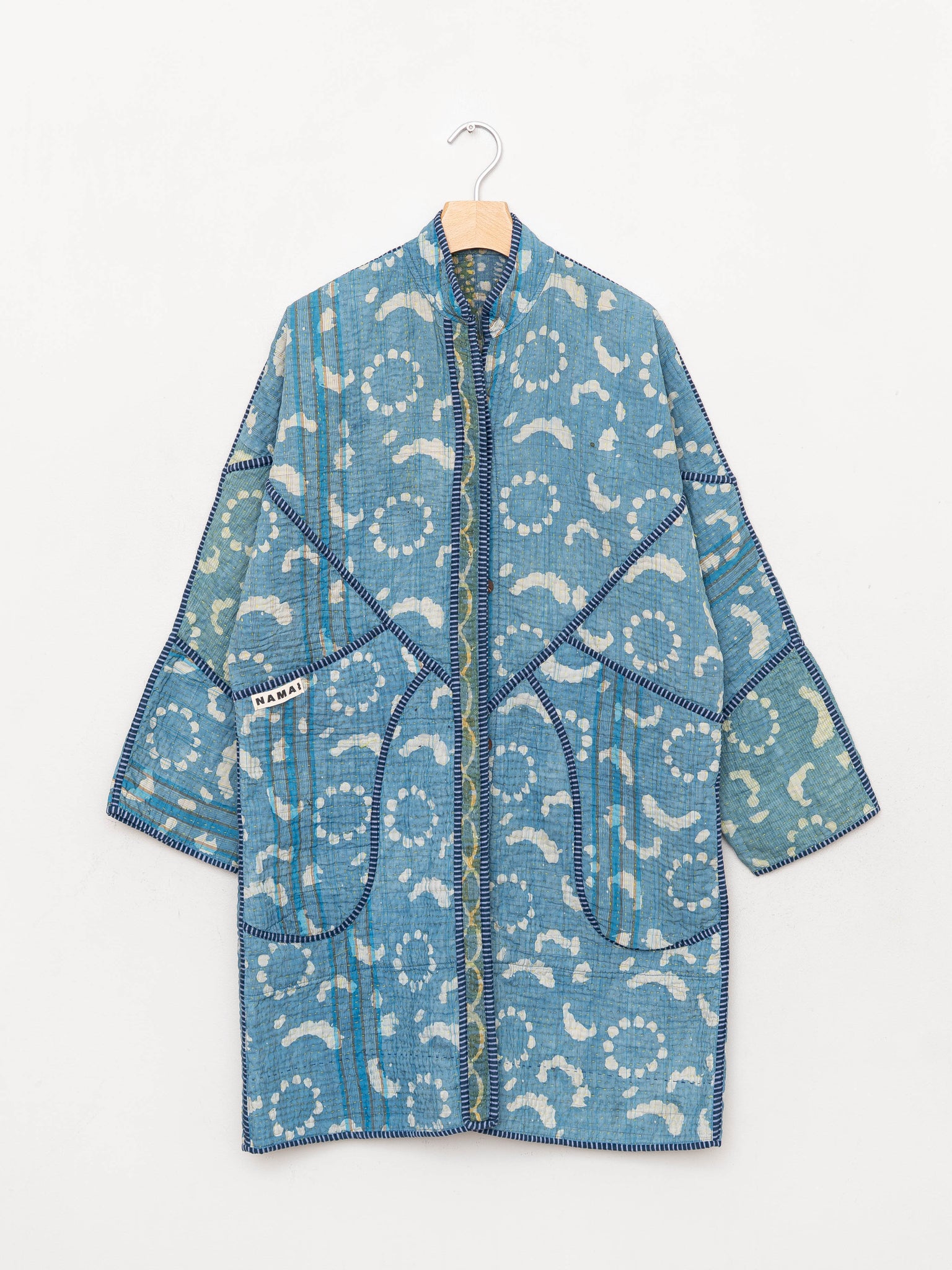• Spot clean when possible, andmachine wash on a delicate cycle and hang dry. (Lay flat to dry.) Natural fading or small frays are part of the quilt’s story and not considered flaws. Namai offers lifetime repairs, supporting artisan microbusinesses and helping your coat stay in rotation for years.