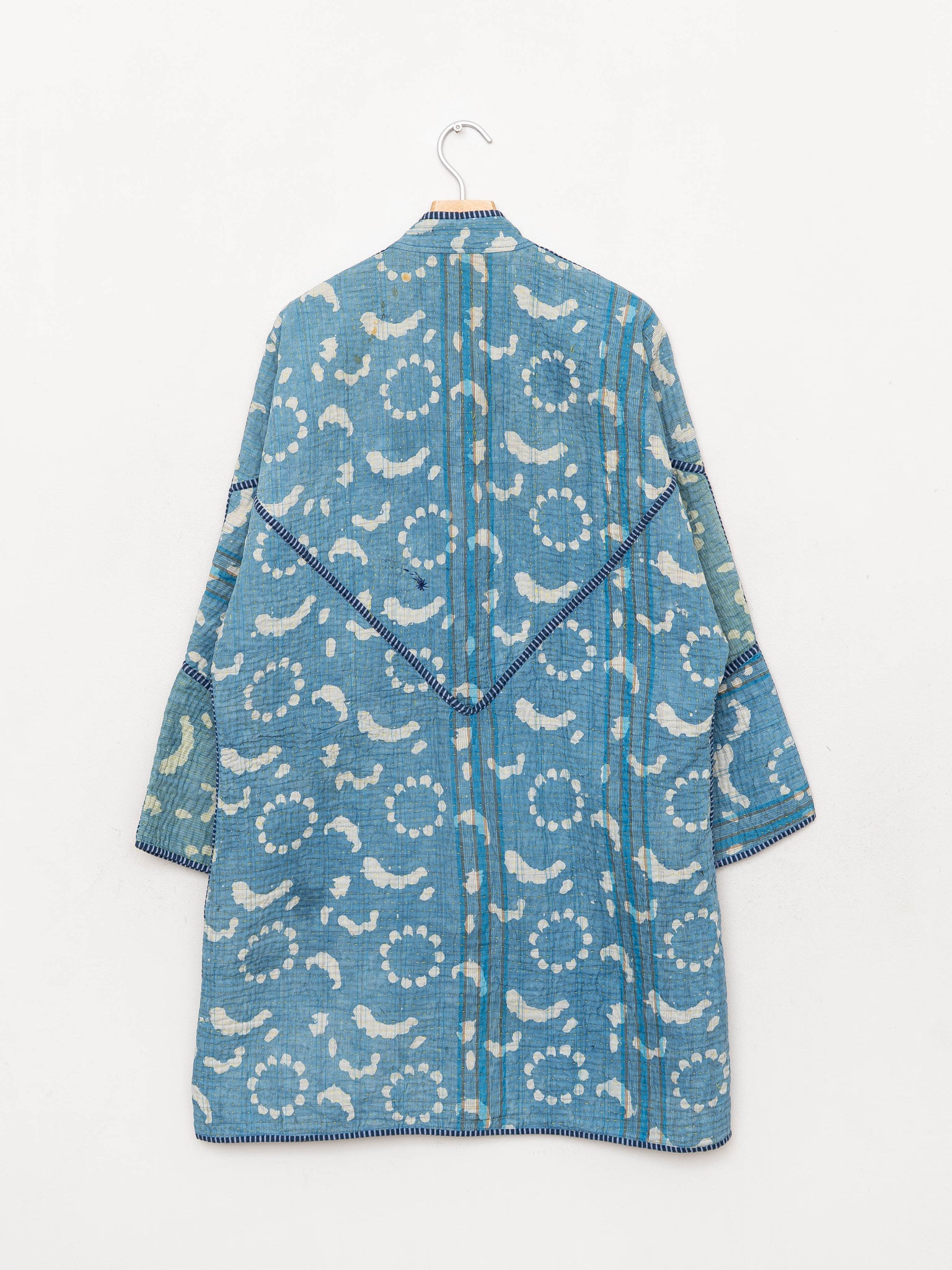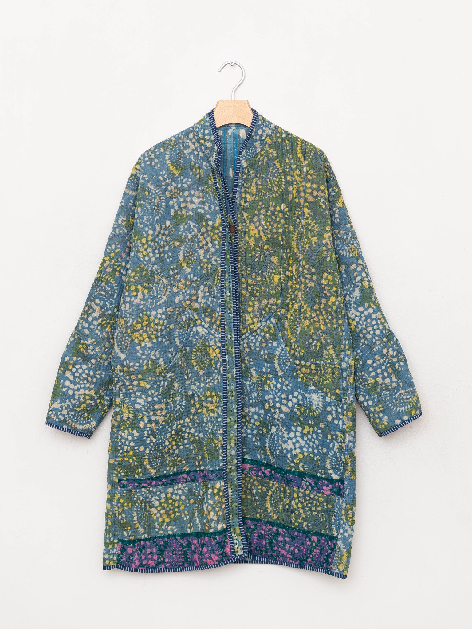 • The Sai Coat is a fully reversible long quilted jacket made from vintage Kantha quilts, finished with a double-sided collar stand, roomy pockets, and clean bias binding along the seams. Its longer silhouette offers a naturally expressive drape without feeling heavy.