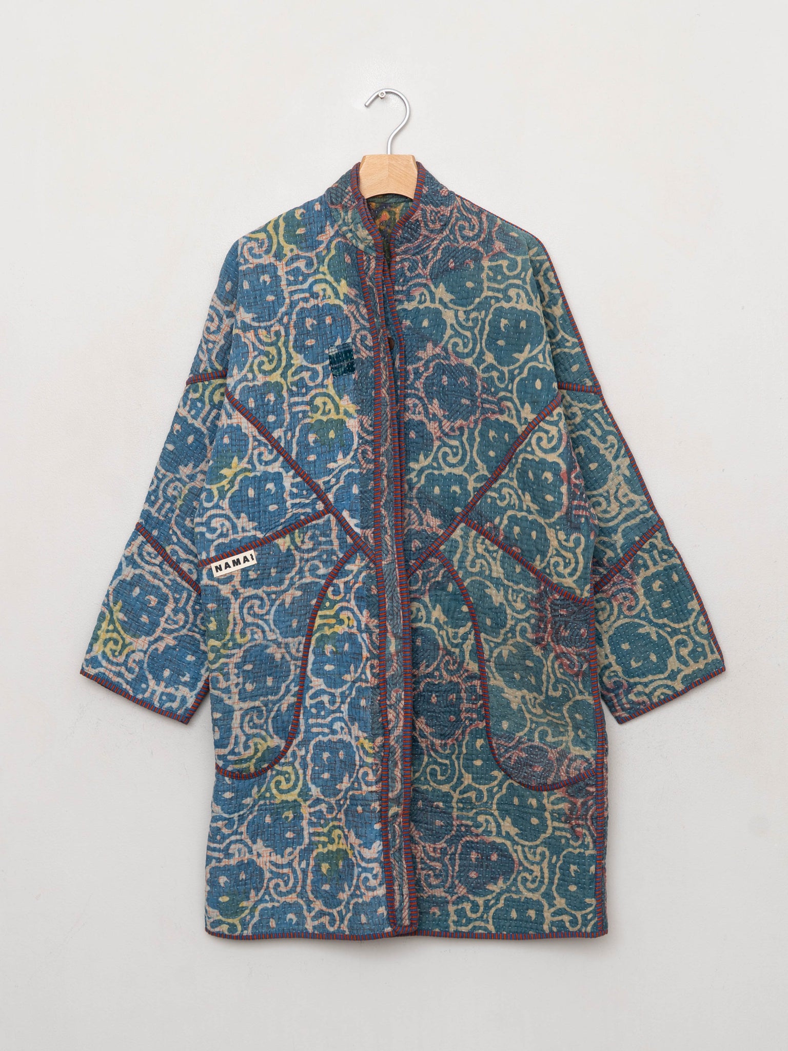 • Spot clean when possible, andmachine wash on a delicate cycle and hang dry. (Lay flat to dry.) Natural fading or small frays are part of the quilt’s story and not considered flaws. Namai offers lifetime repairs, supporting artisan microbusinesses and helping your coat stay in rotation for years.