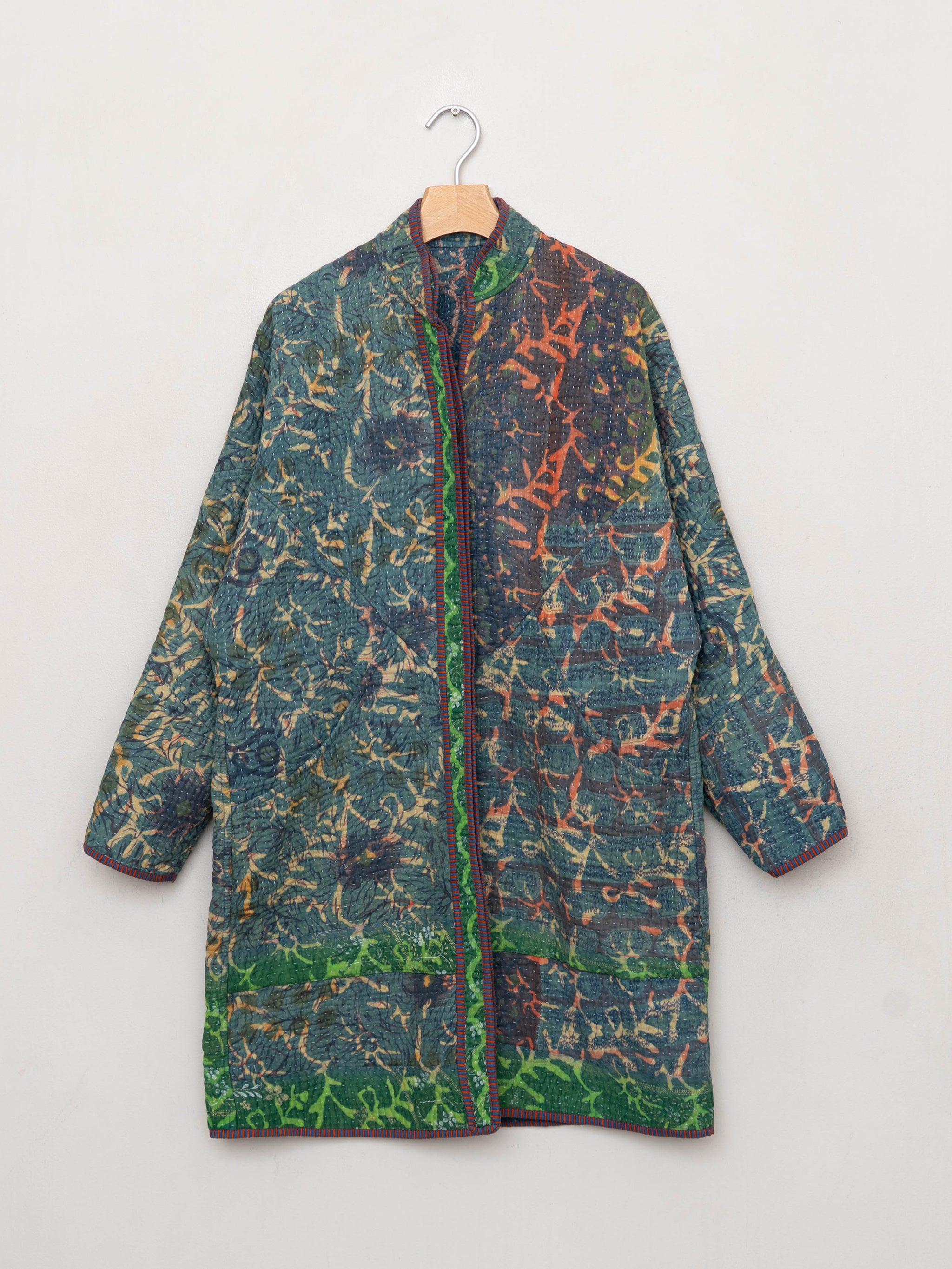 • The Sai Coat is a fully reversible long quilted jacket made from vintage Kantha quilts, finished with a double-sided collar stand, roomy pockets, and clean bias binding along the seams. Its longer silhouette offers a naturally expressive drape without feeling heavy.