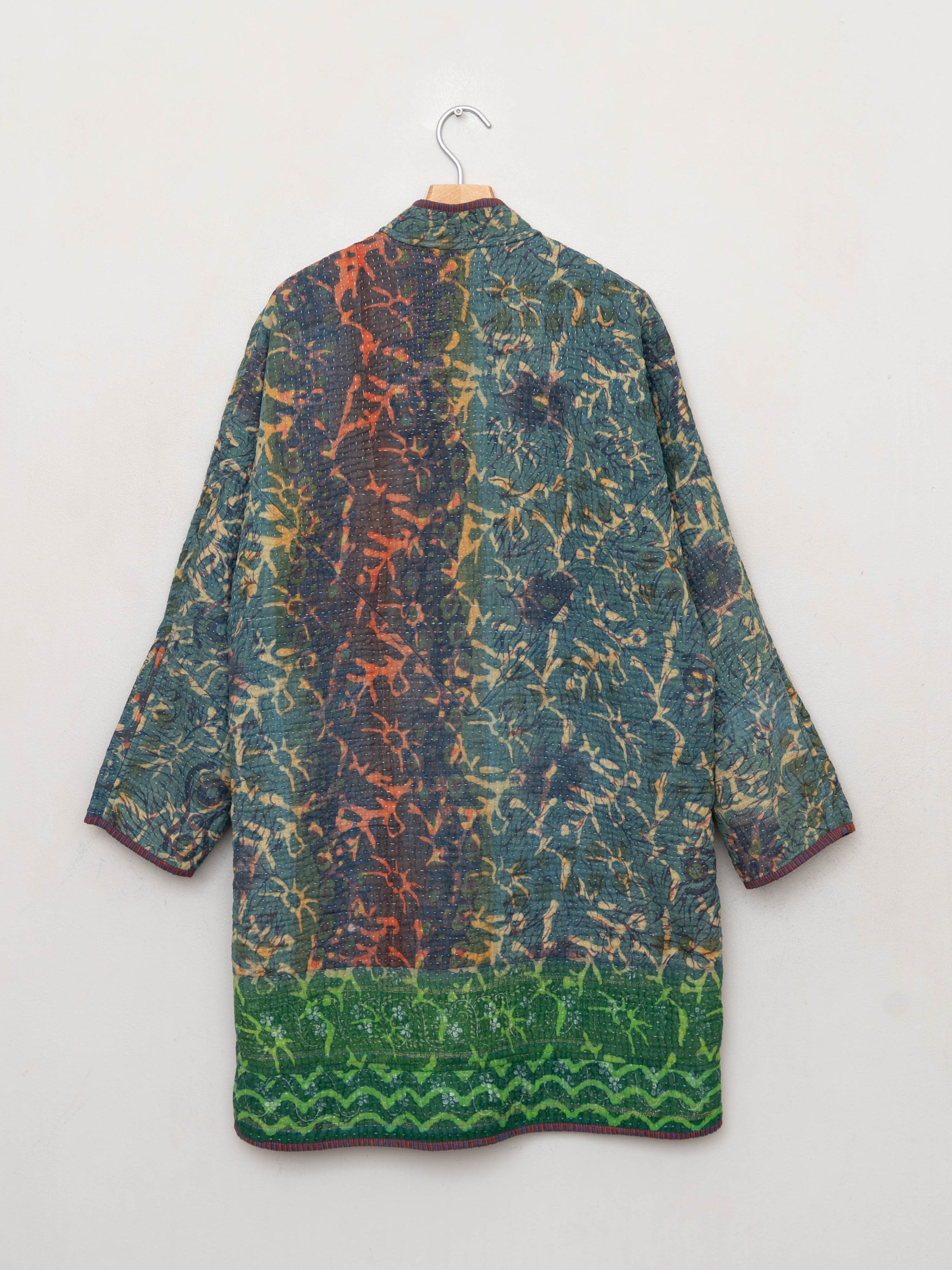 • Most sustainable clothing relies on repeated designs or large-batch production. The Sai Coat is created from antique quilts with real provenance, hand-stitched by artisan teams using heritage Kantha methods.