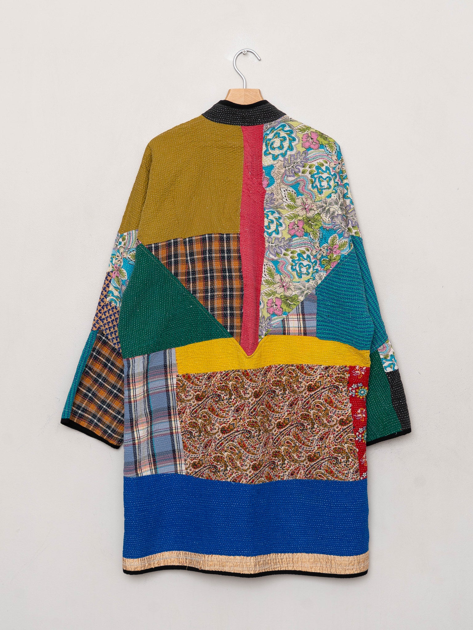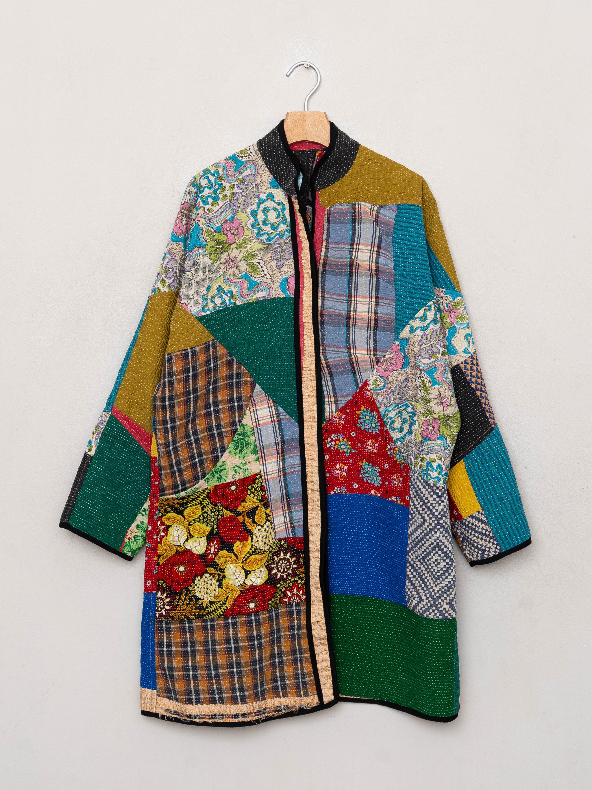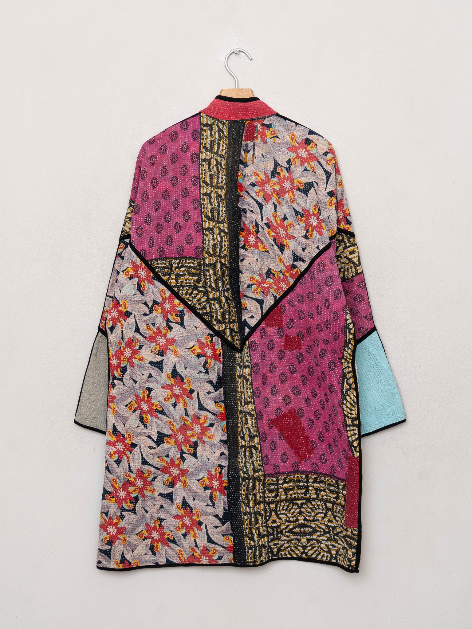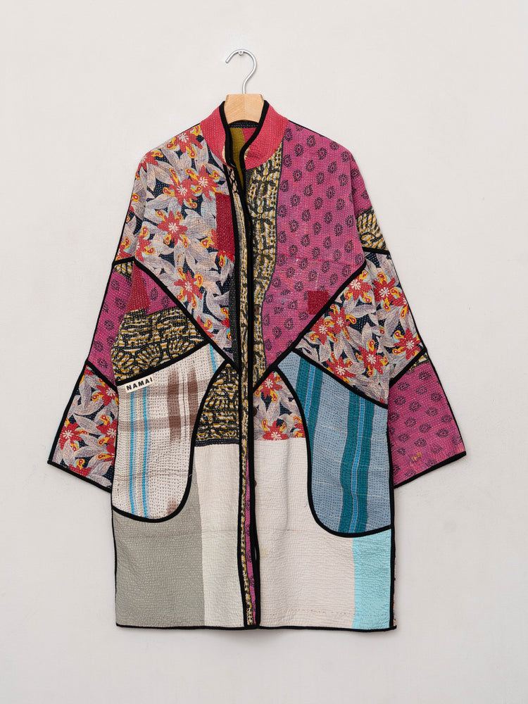 • The Sai Coat is a fully reversible long quilted jacket made from vintage Kantha quilts, finished with a double-sided collar stand, roomy pockets, and clean bias binding along the seams. Its longer silhouette offers a naturally expressive drape without feeling heavy.