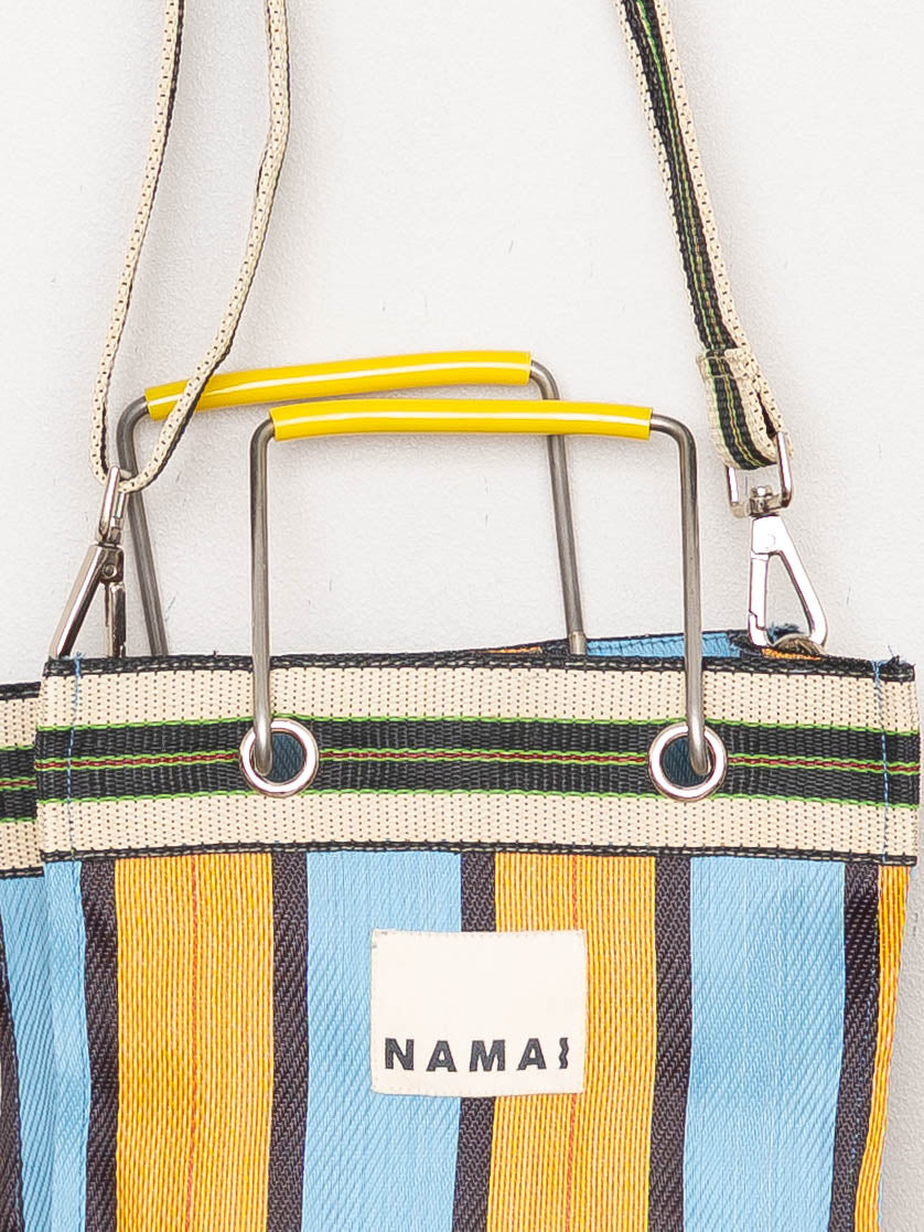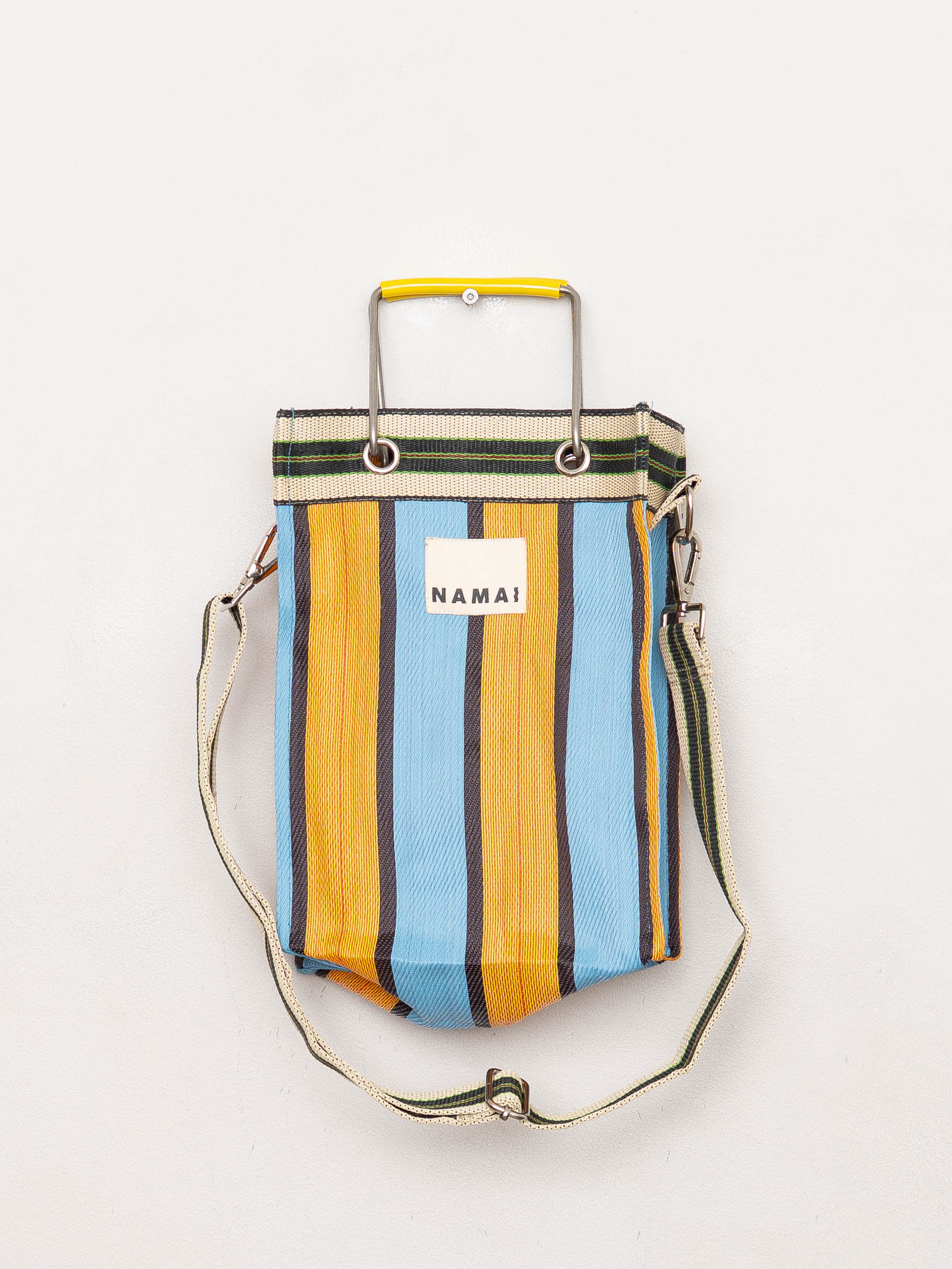 A versatile mini market bag designed to be worn crossbody, featuring a removable strap and classic metal shopping handles. Sturdy hardware and playful color combinations balance everyday utility with effortless style. Perfect for carrying everyday essentials.
