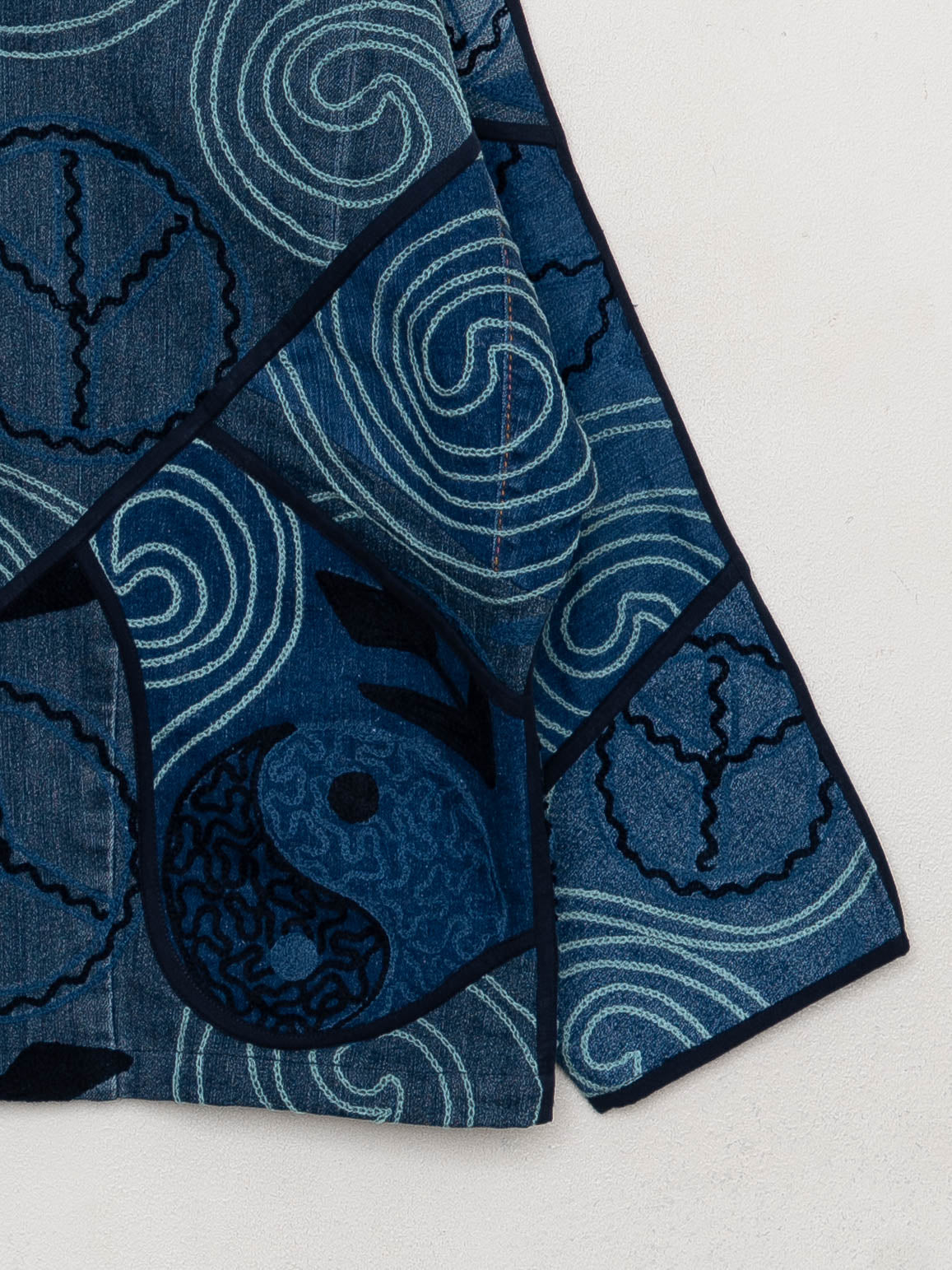 The Ladhiya Denim Jacket has a relaxed fit with a hem that sits just below the hip. It’s available in three sizes and fully lined in soft cotton. Made from upcycled denim jeans with suzani embroidery design over the top. Each piece is completely one of a kind—no two are alike. Designed with thoughtful details like rollable sleeves, a mandarin collar, and coconut shell buttons for effortless wear.
