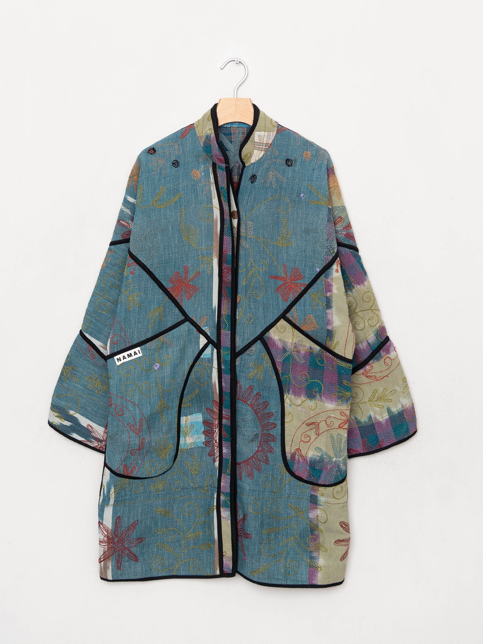 • Spot clean when possible, andmachine wash on a delicate cycle and hang dry. (Lay flat to dry.) Natural fading or small frays are part of the quilt’s story and not considered flaws. Namai offers lifetime repairs, supporting artisan microbusinesses and helping your coat stay in rotation for years.