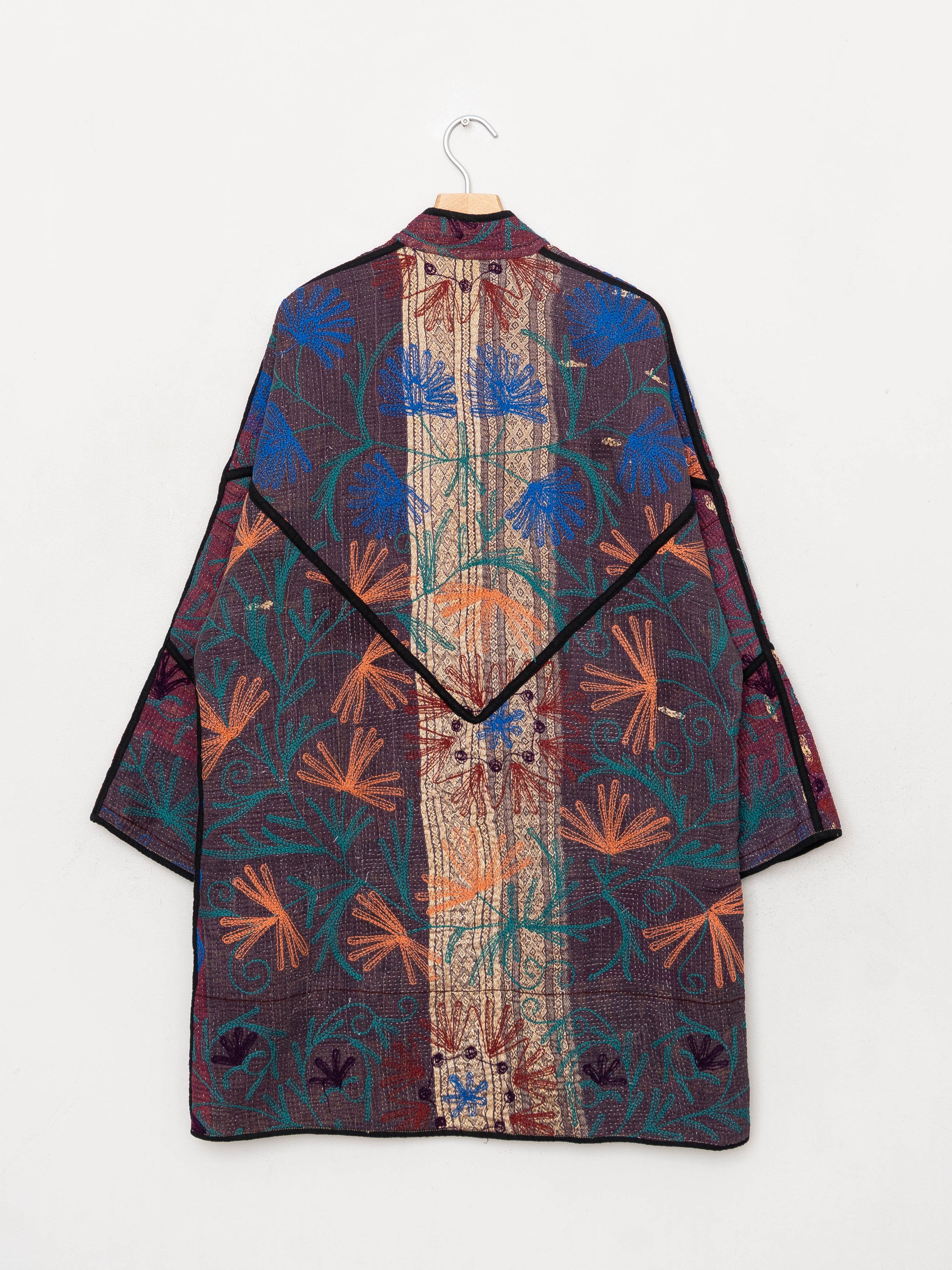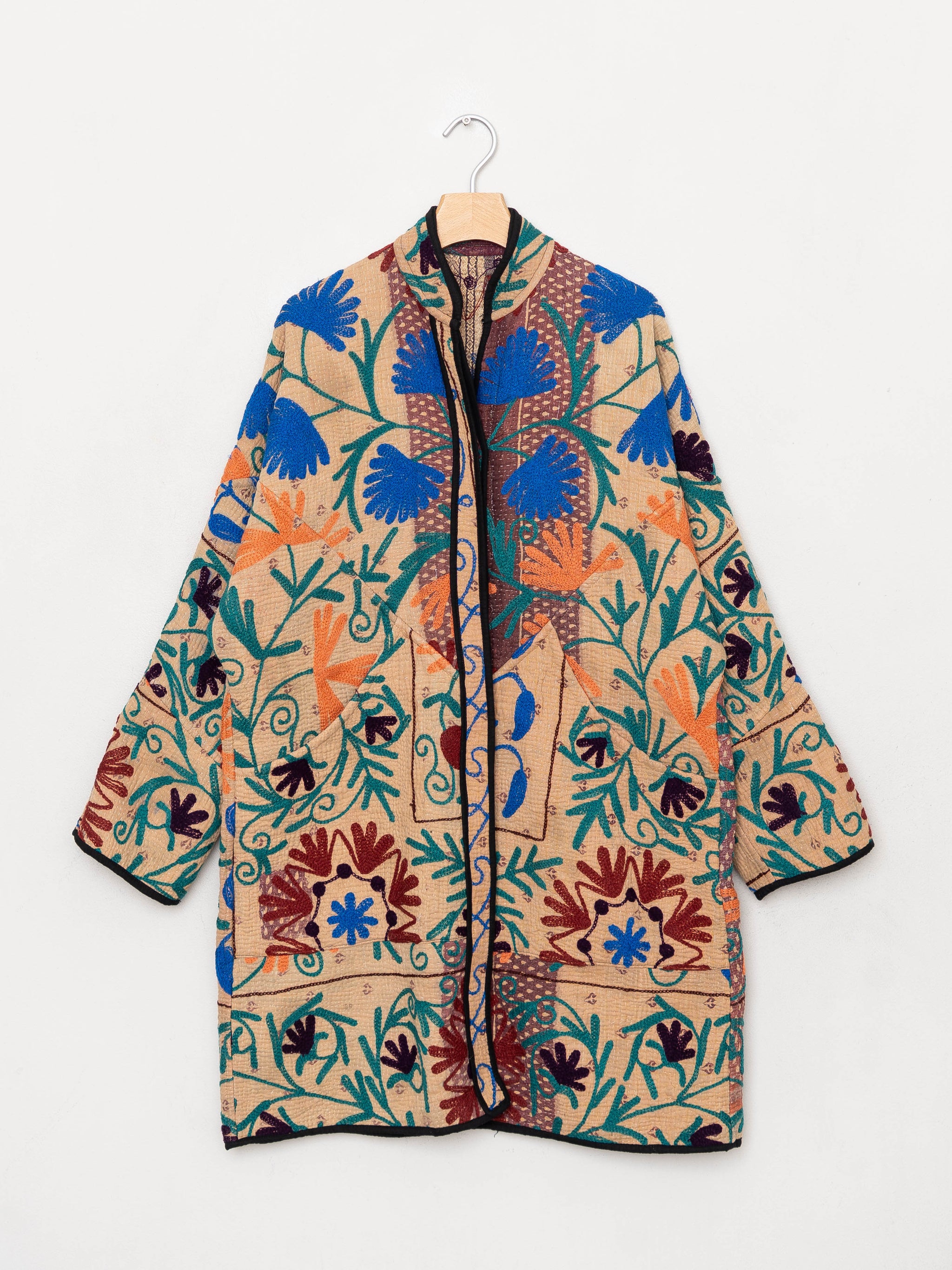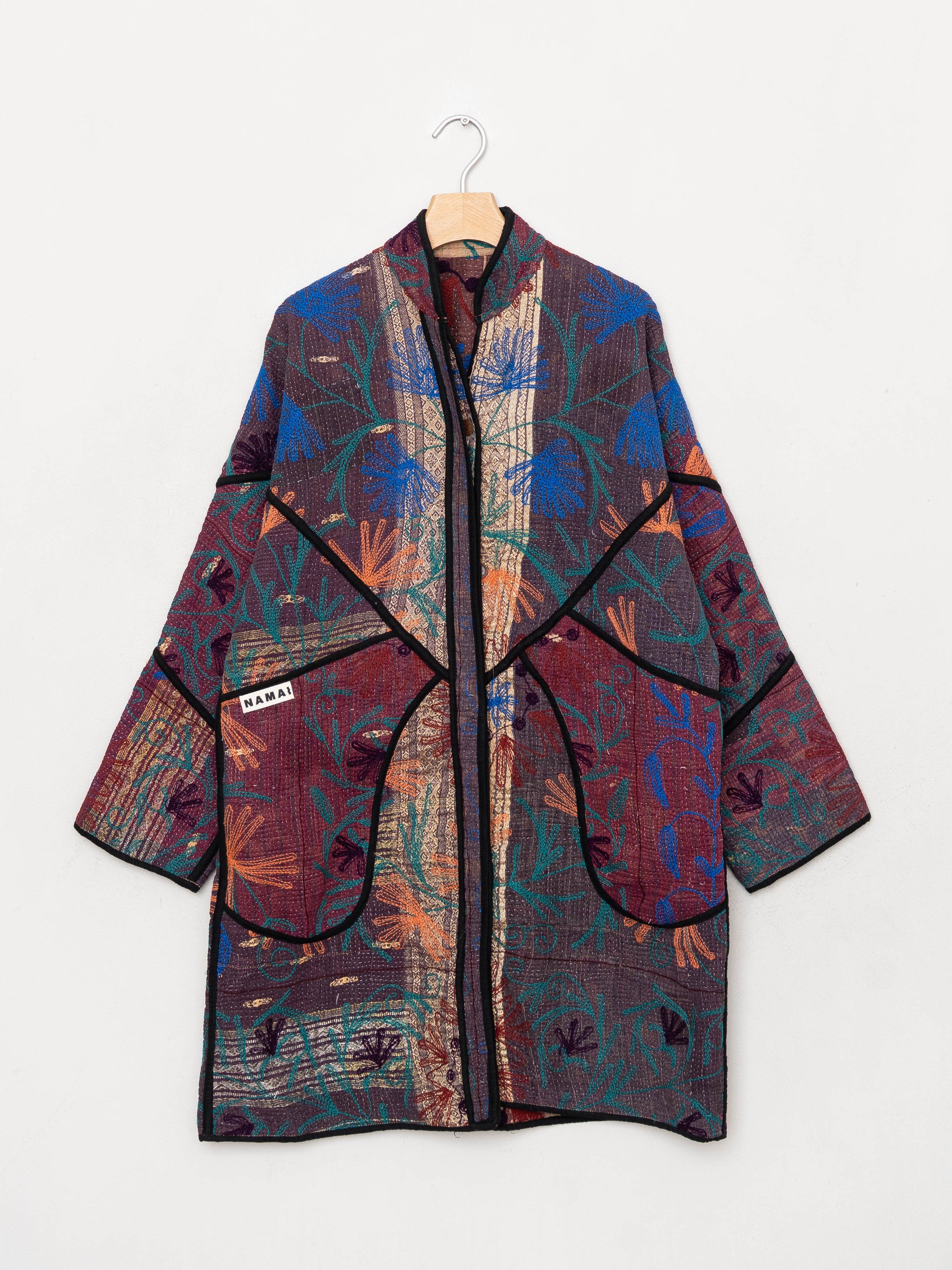 • The Sai Coat is a fully reversible long quilted jacket made from vintage Kantha quilts, finished with a double-sided collar stand, roomy pockets, and clean bias binding along the seams. Its longer silhouette offers a naturally expressive drape without feeling heavy.