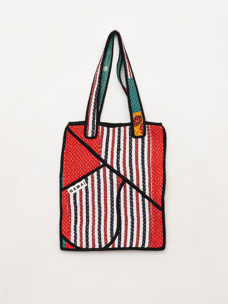 The Tarun Bag s a fully reversible, one-of-a-kind carryall made from vintage Kantha quilts. Compact yet functional, it features top handles and our signature NAMAI pocket - perfect for keeping your essentials close at hand. Each piece is zero-waste and entirely unique, crafted with care in Jaipur from heirloom textiles.