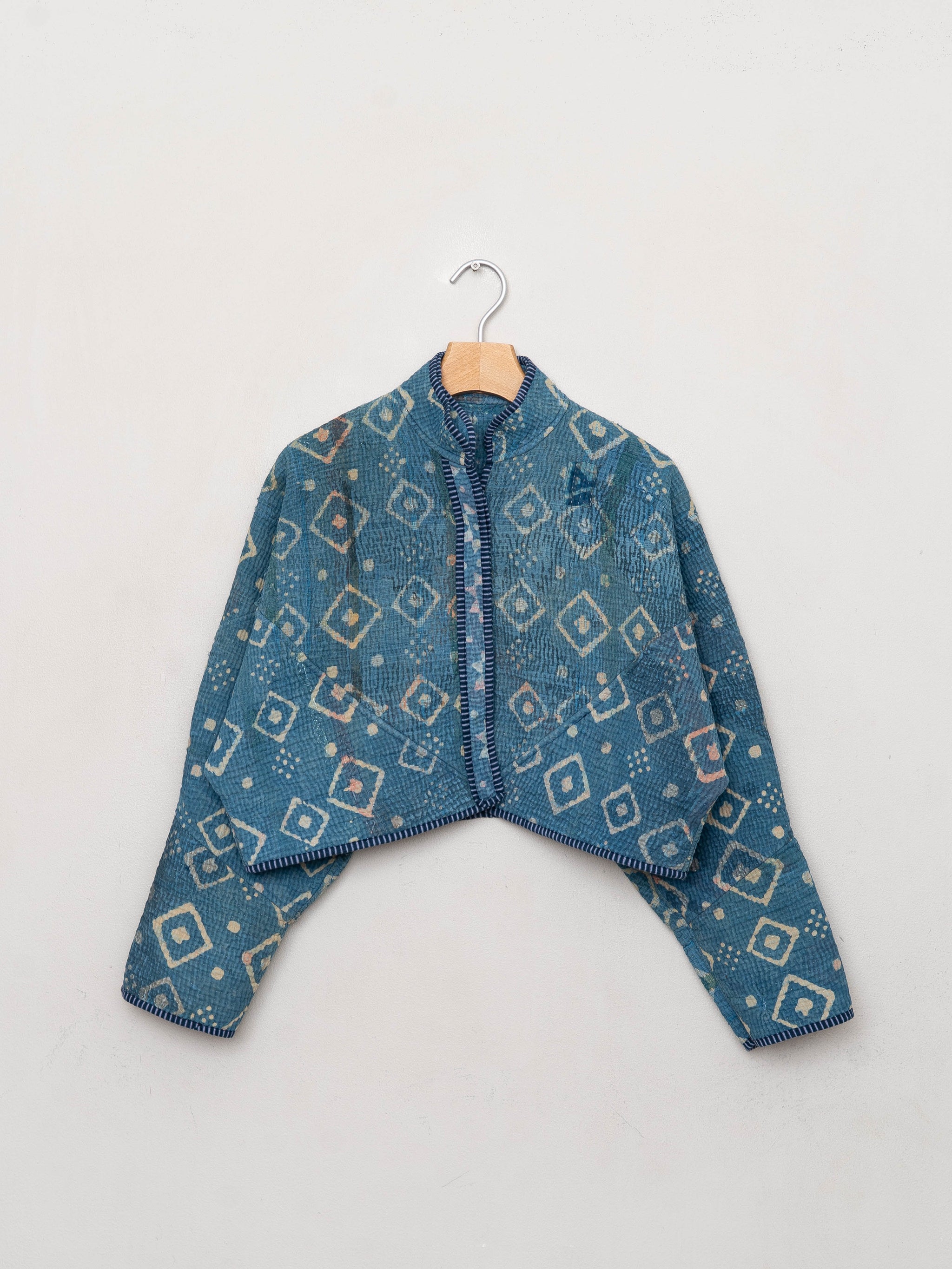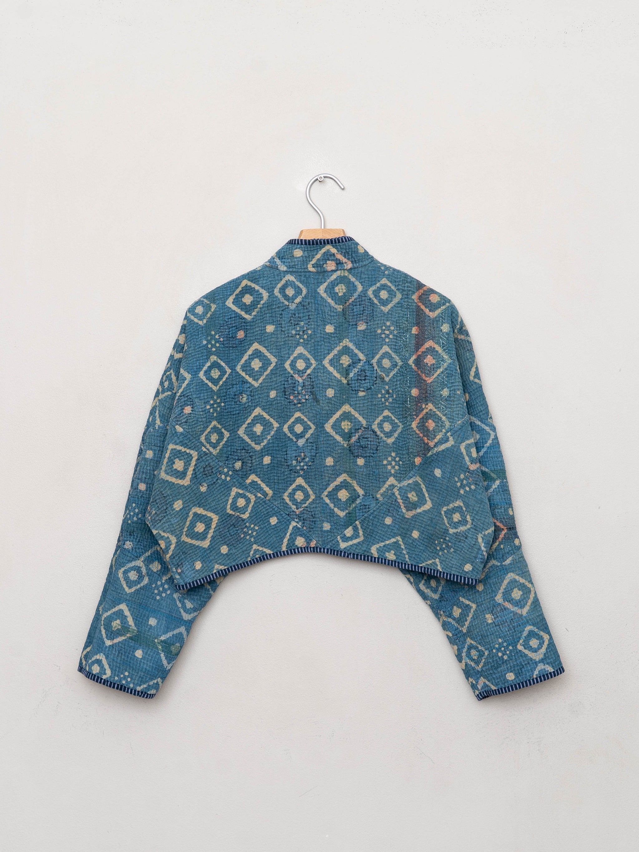 • The Kaira Jacket is a fully reversible cropped quilted jacket made from vintage Kantha quilts, each with its own stitching, layout, and patina (signs of age). Its boxy silhouette, mandarin collar, and rollable sleeves create a clean, modern shape that stands apart from mass-market cropped jacket styles.