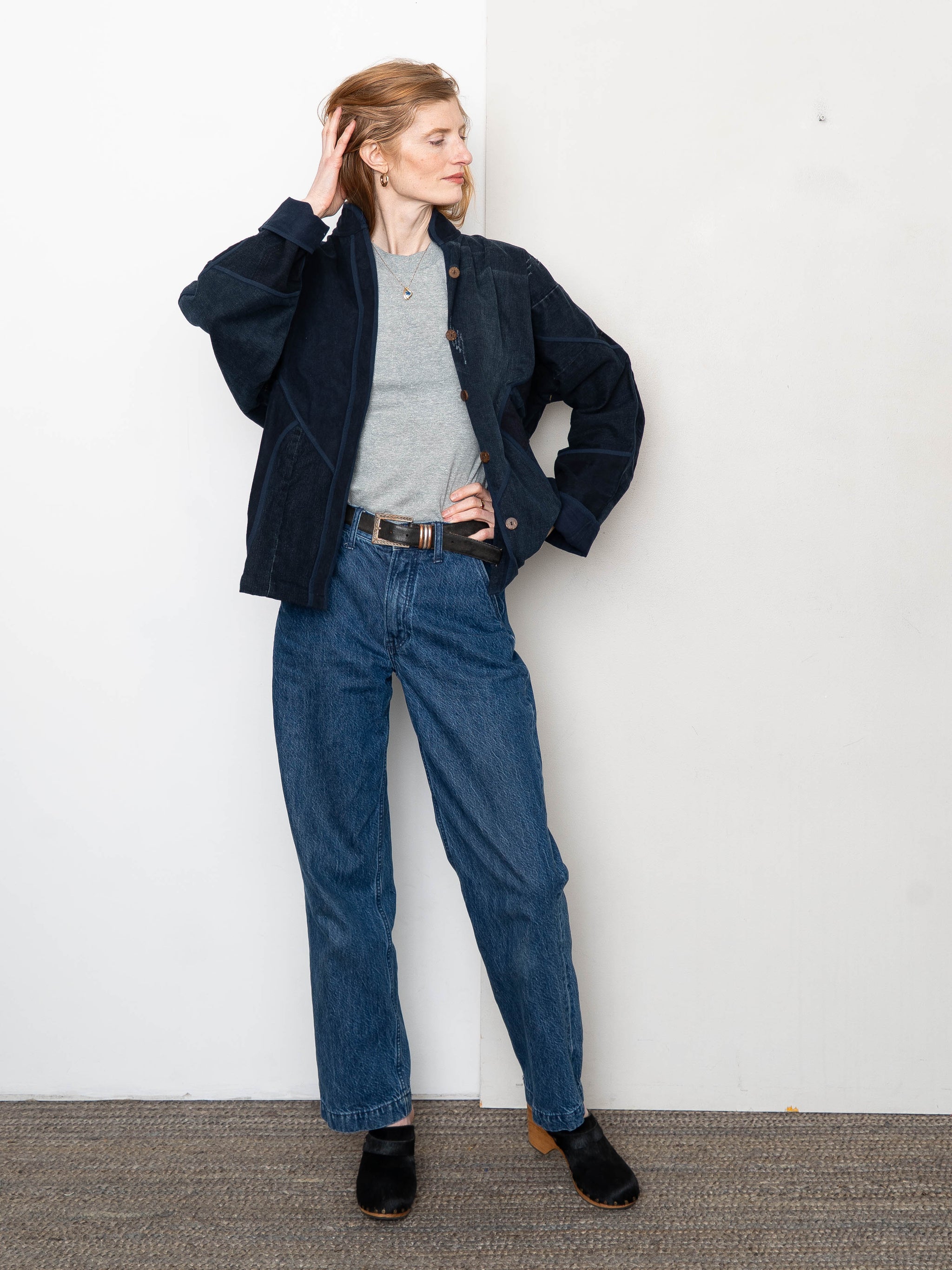The Ladhiya Denim Jacket has a relaxed fit with a hem that sits just below the hip. It’s available in three sizes and fully lined in soft cotton. Made from upcycled denim jeans, each piece is completely one of a kind—no two are alike. Designed with thoughtful details like rollable sleeves, a mandarin collar, and coconut shell buttons for effortless wear.