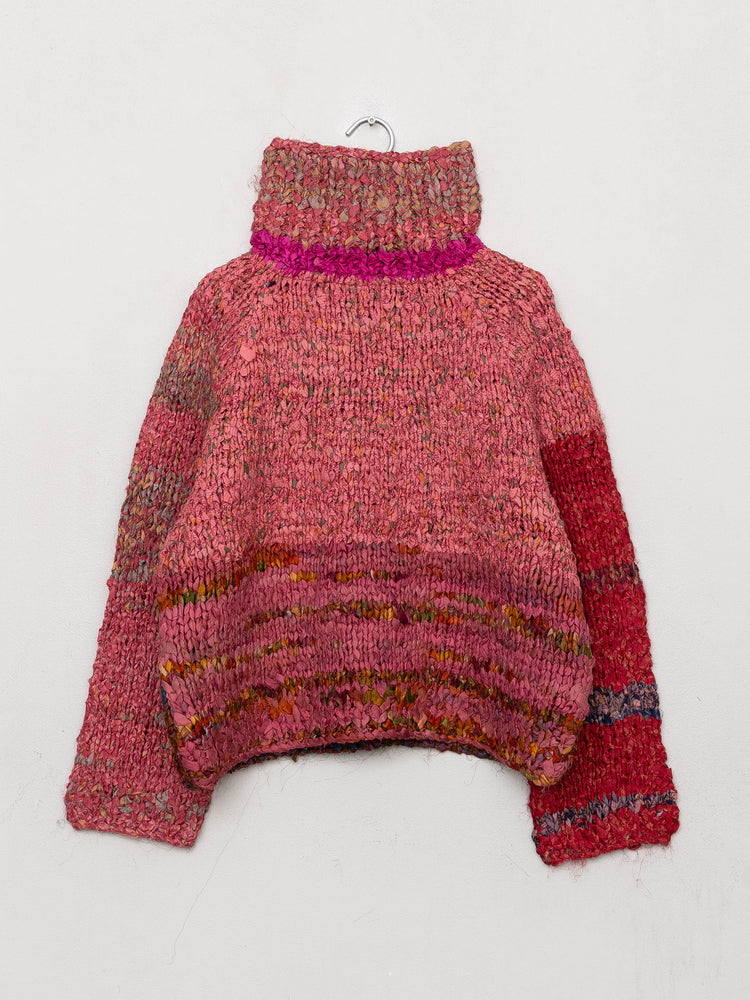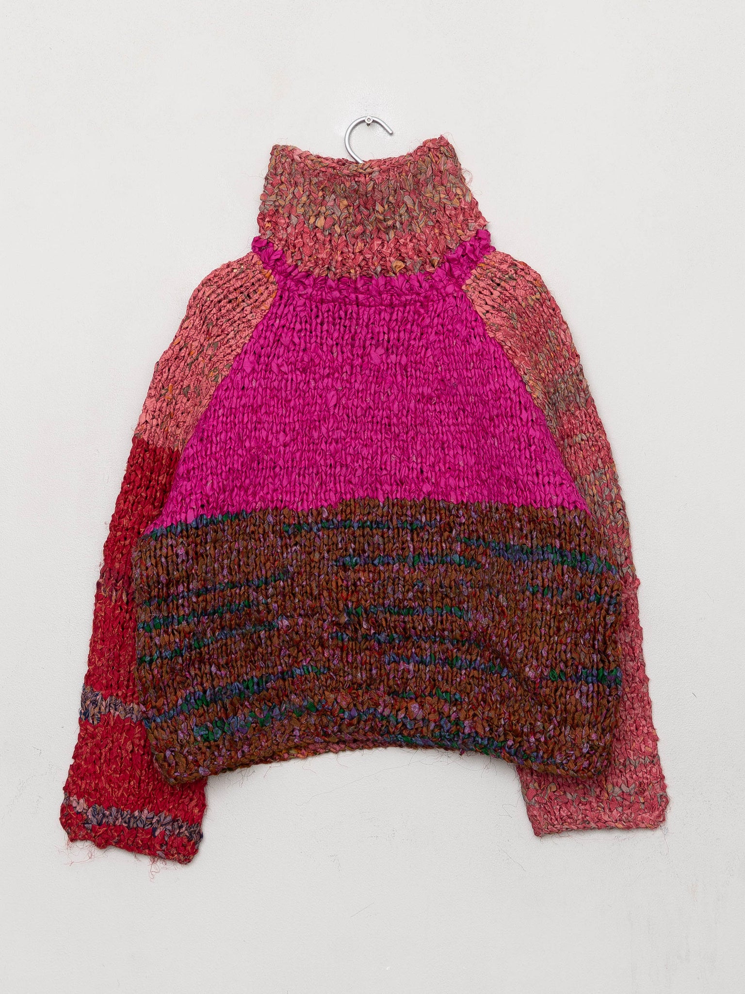 The Vishnu Sweater is a chunky knit made out of strips of recycled sari silk. It takes six sarees to make up one sweater. The recycled silk is torn into strips and hand knitted. Each one is completely handcrafted and no two are alike.