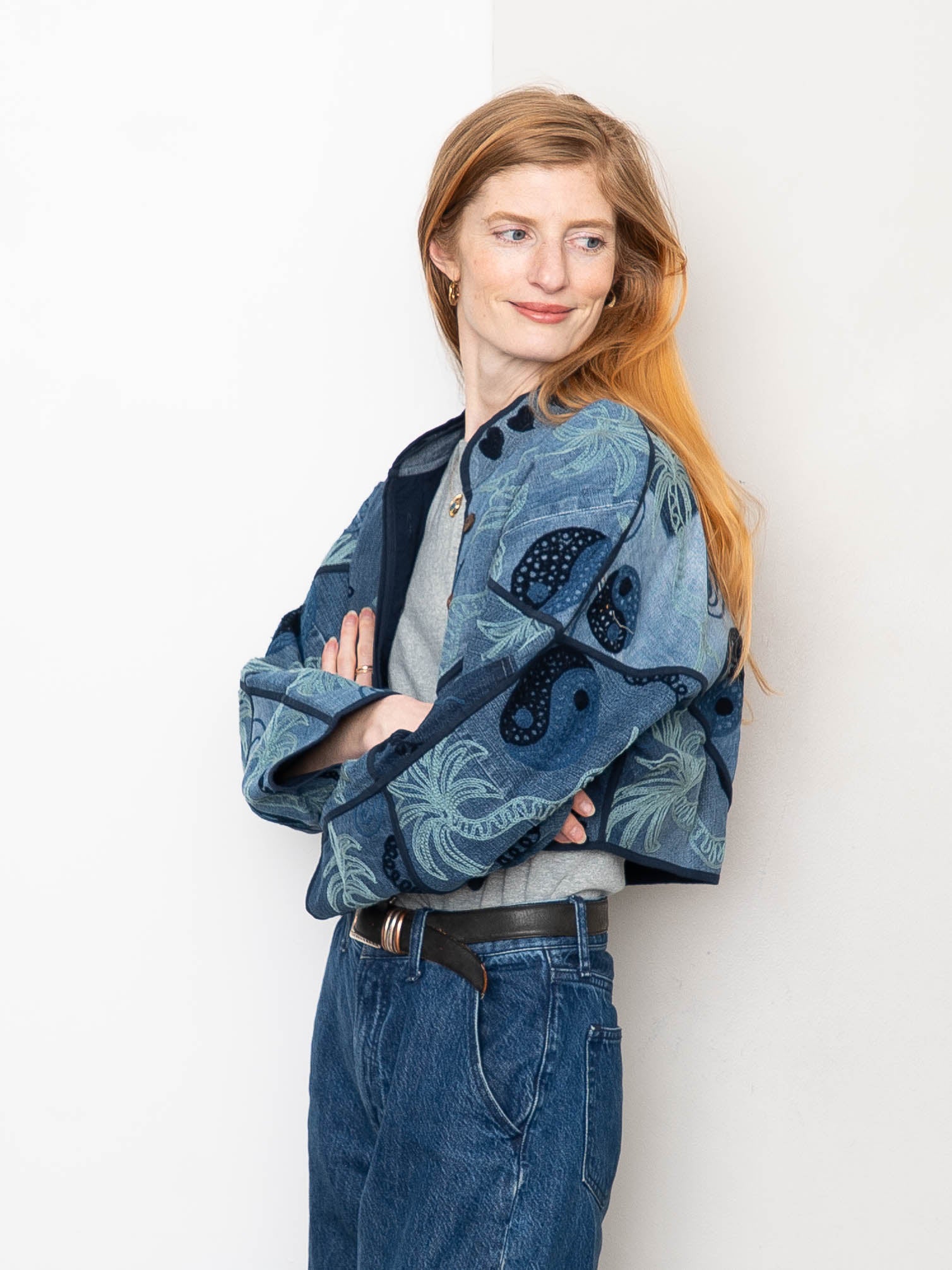 The Kaira Cropped Denim Suzani Jacket - Medium
