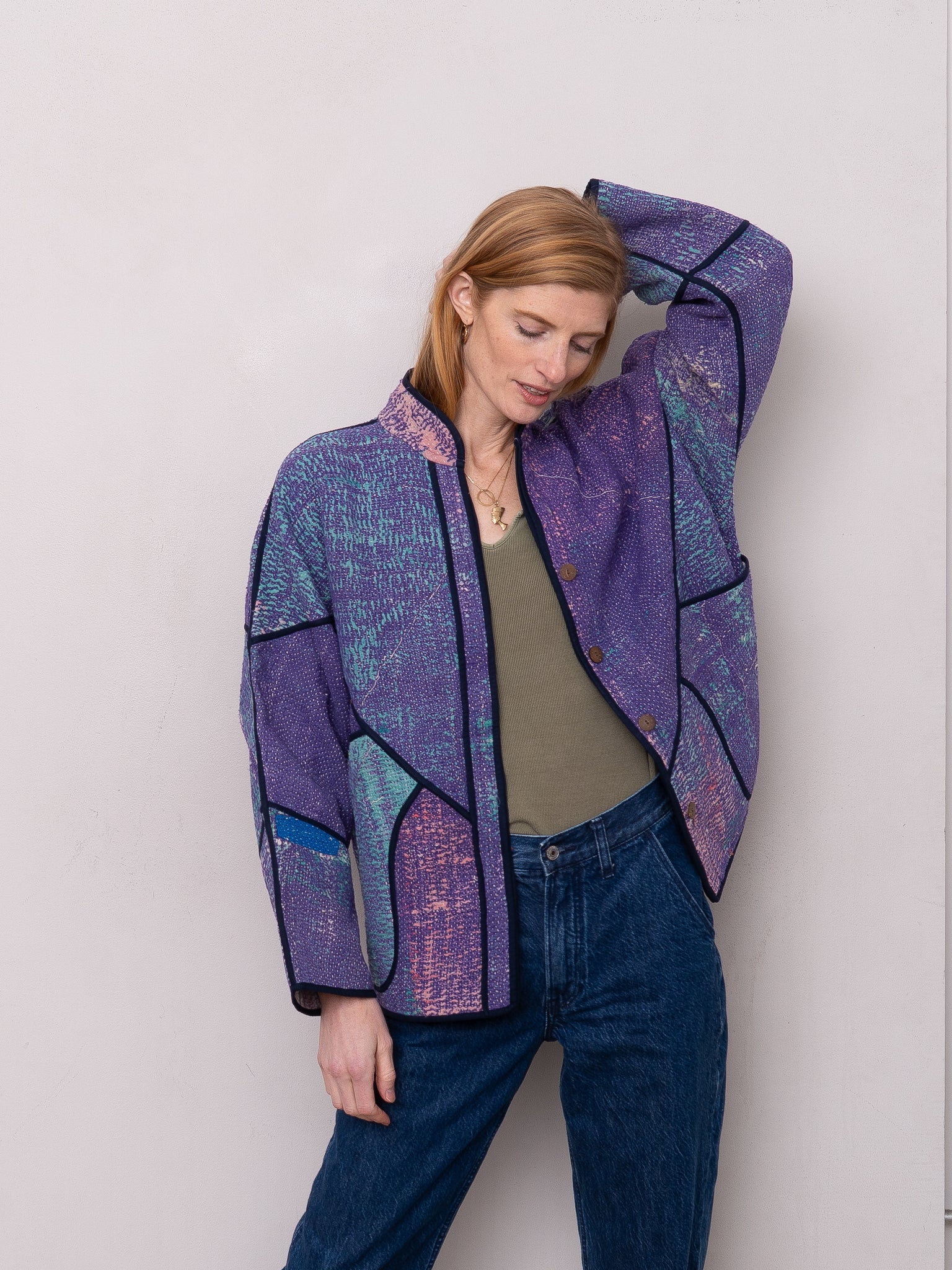 The Ladhiya Jacket is a relaxed, hip-length style with an easy, oversized fit and generous patch pockets on both sides. Fully reversible and made from vintage Kantha quilts, each piece is completely one of a kind—no two are alike. Designed with thoughtful details like rollable sleeves, a mandarin collar, and coconut shell buttons on both sides for effortless wear.