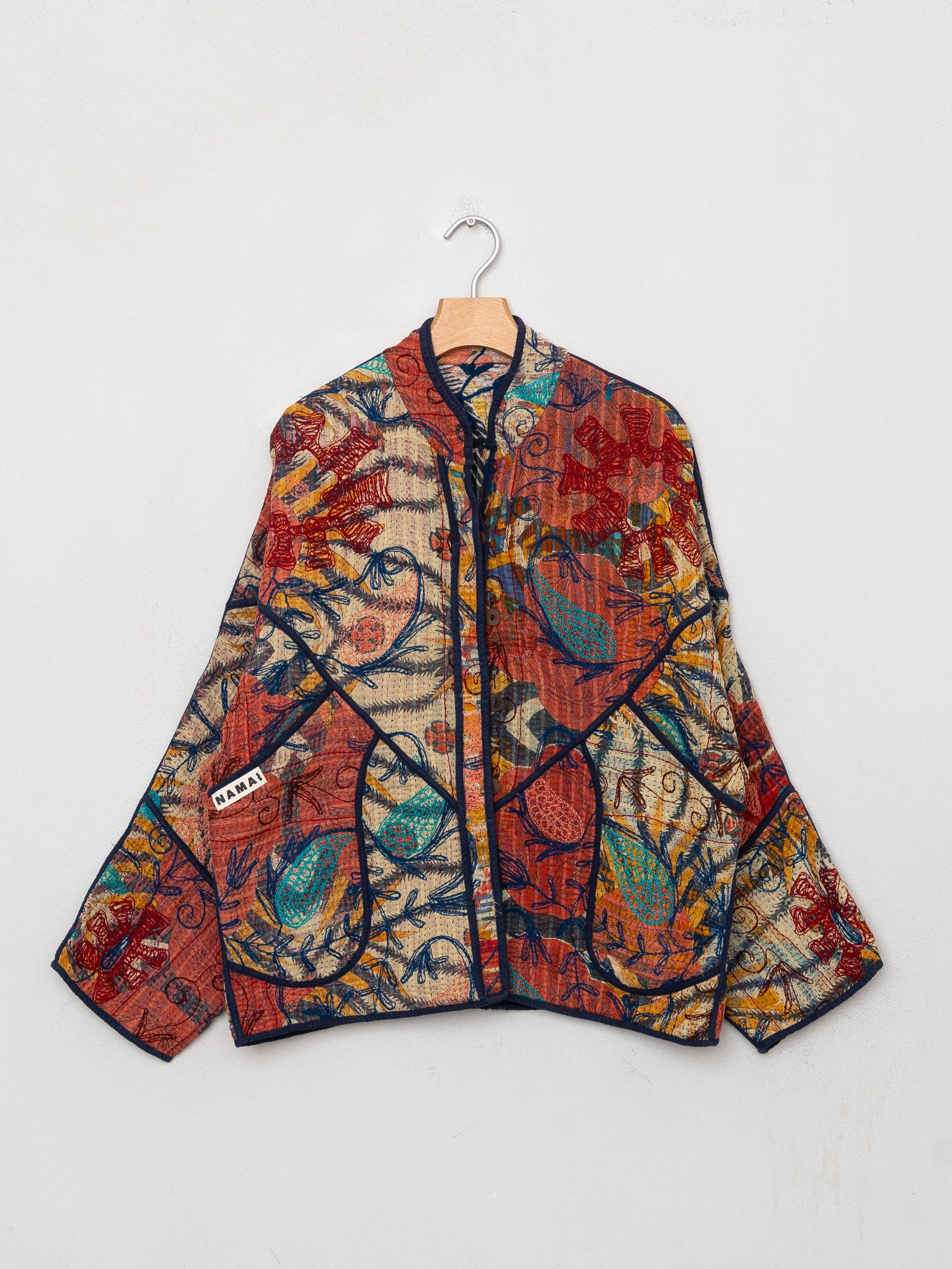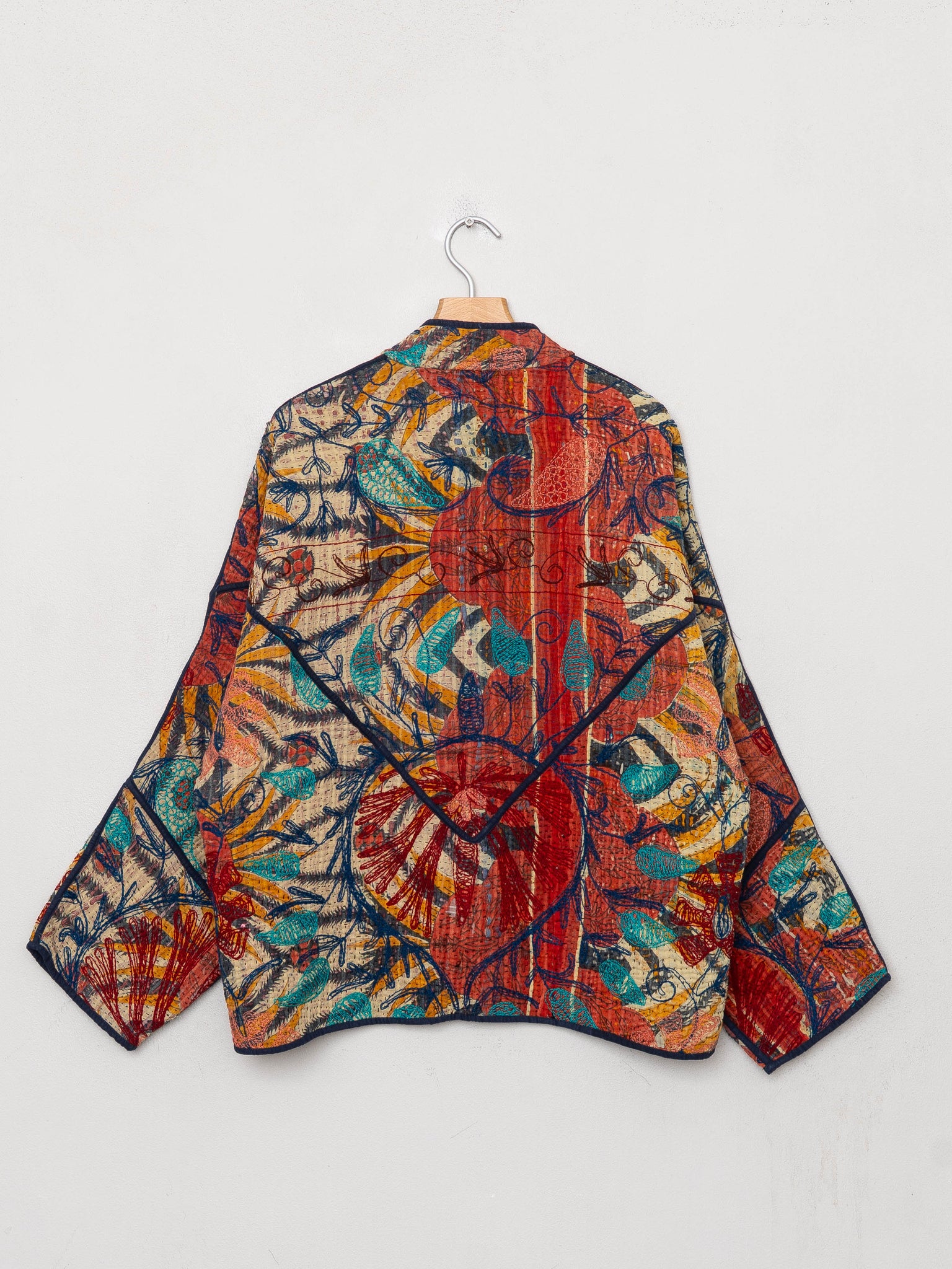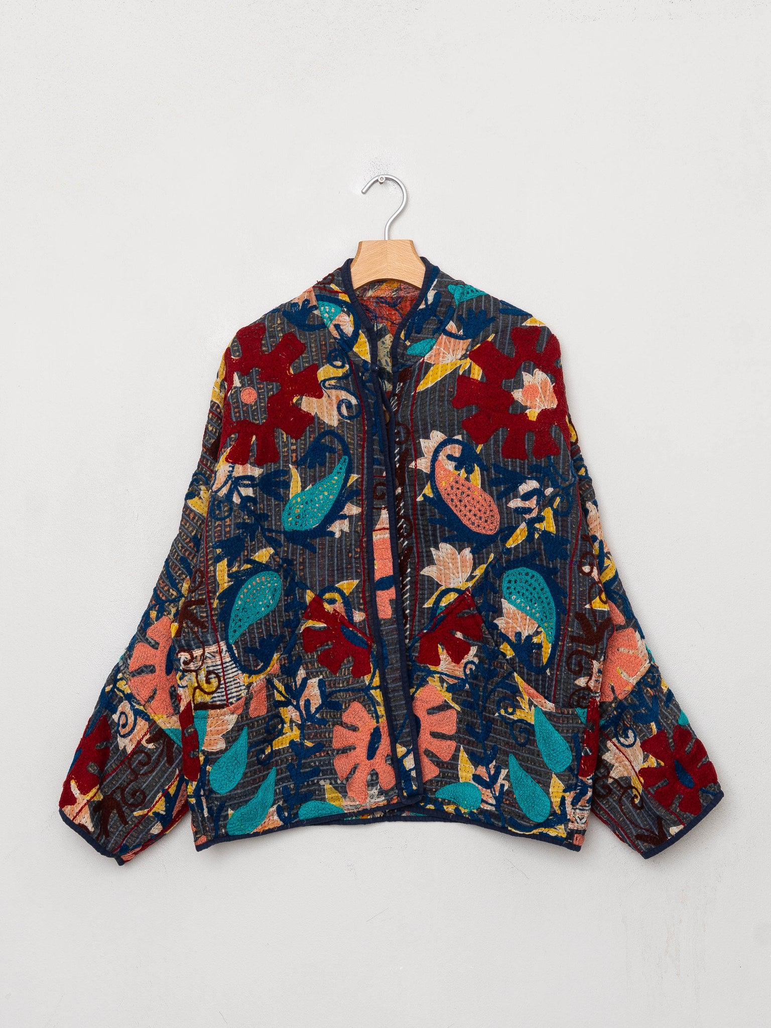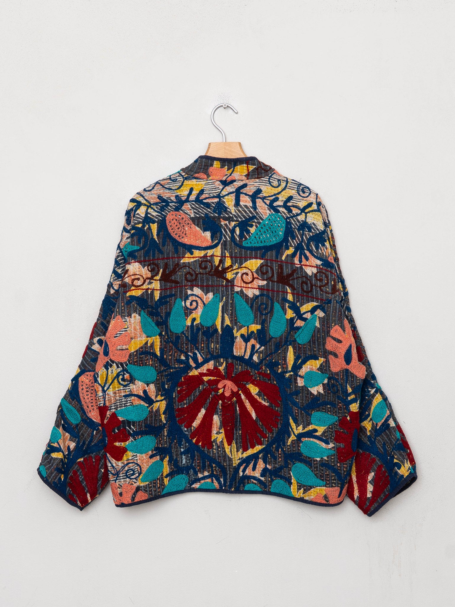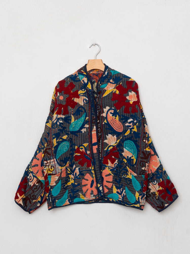 Our Suzani jackets are made from a repurposed Suzani Kantha quilt—vintage cotton stitched with colorful wool embroidery in a flowing chain-stitch style.