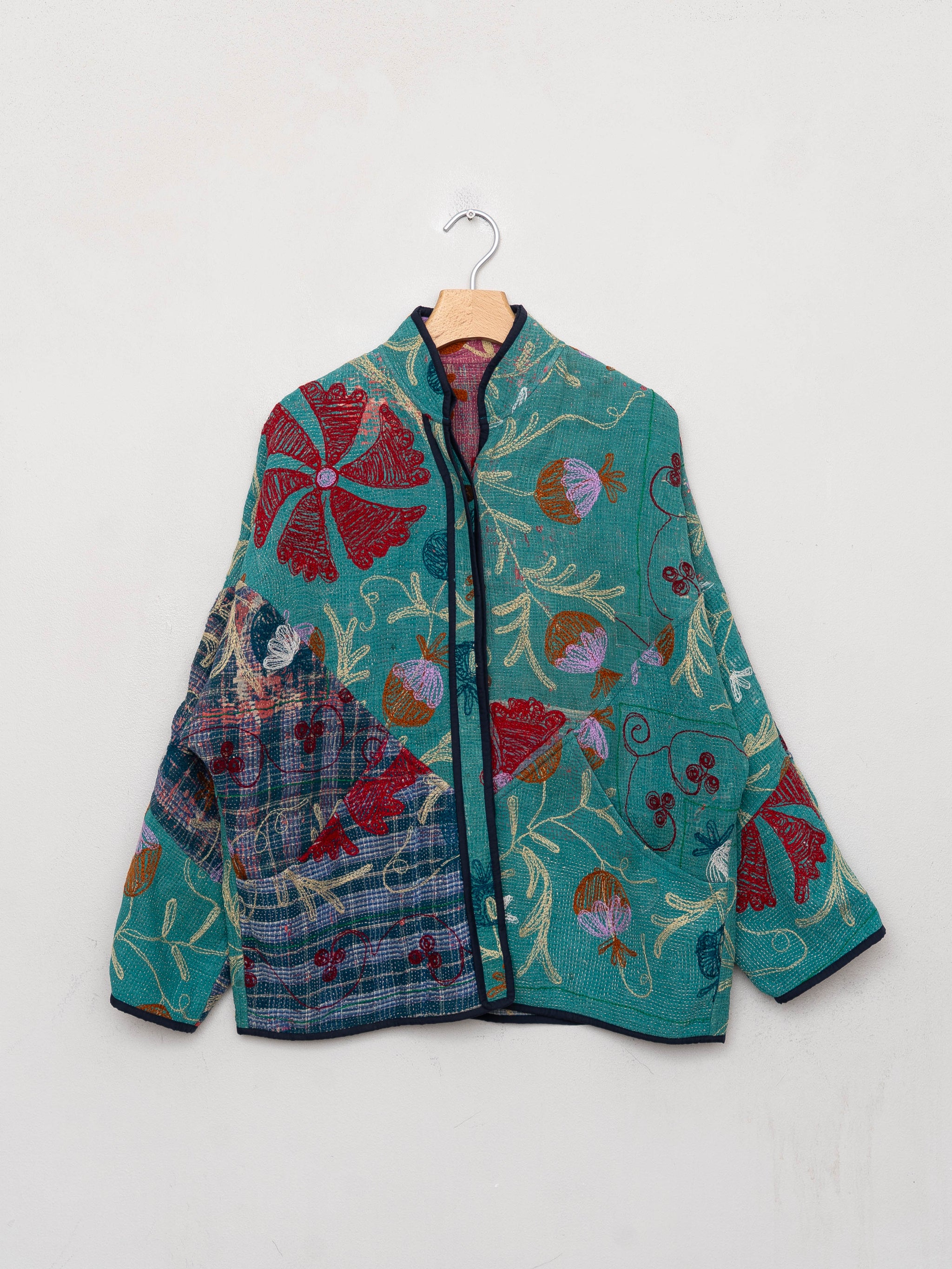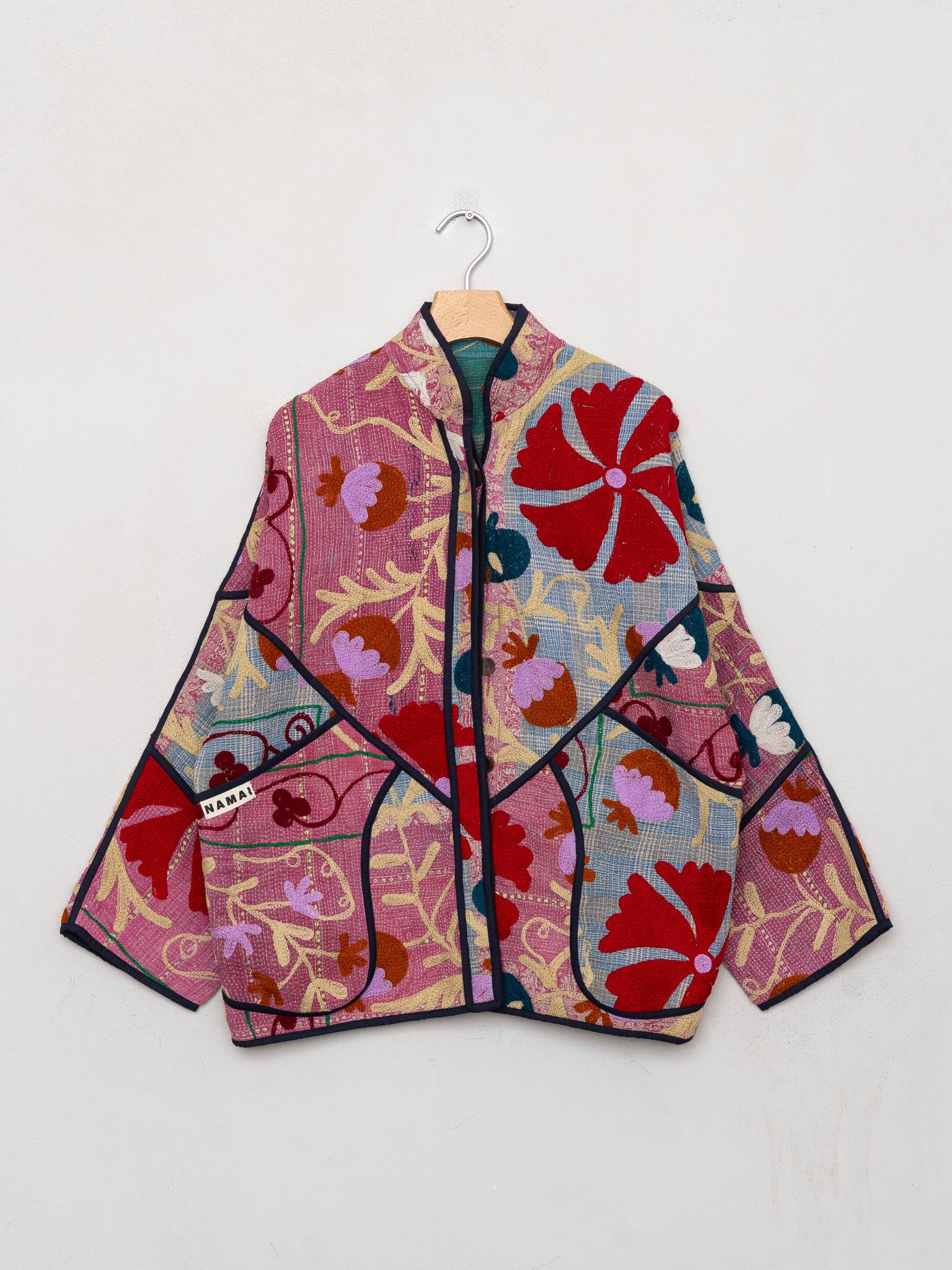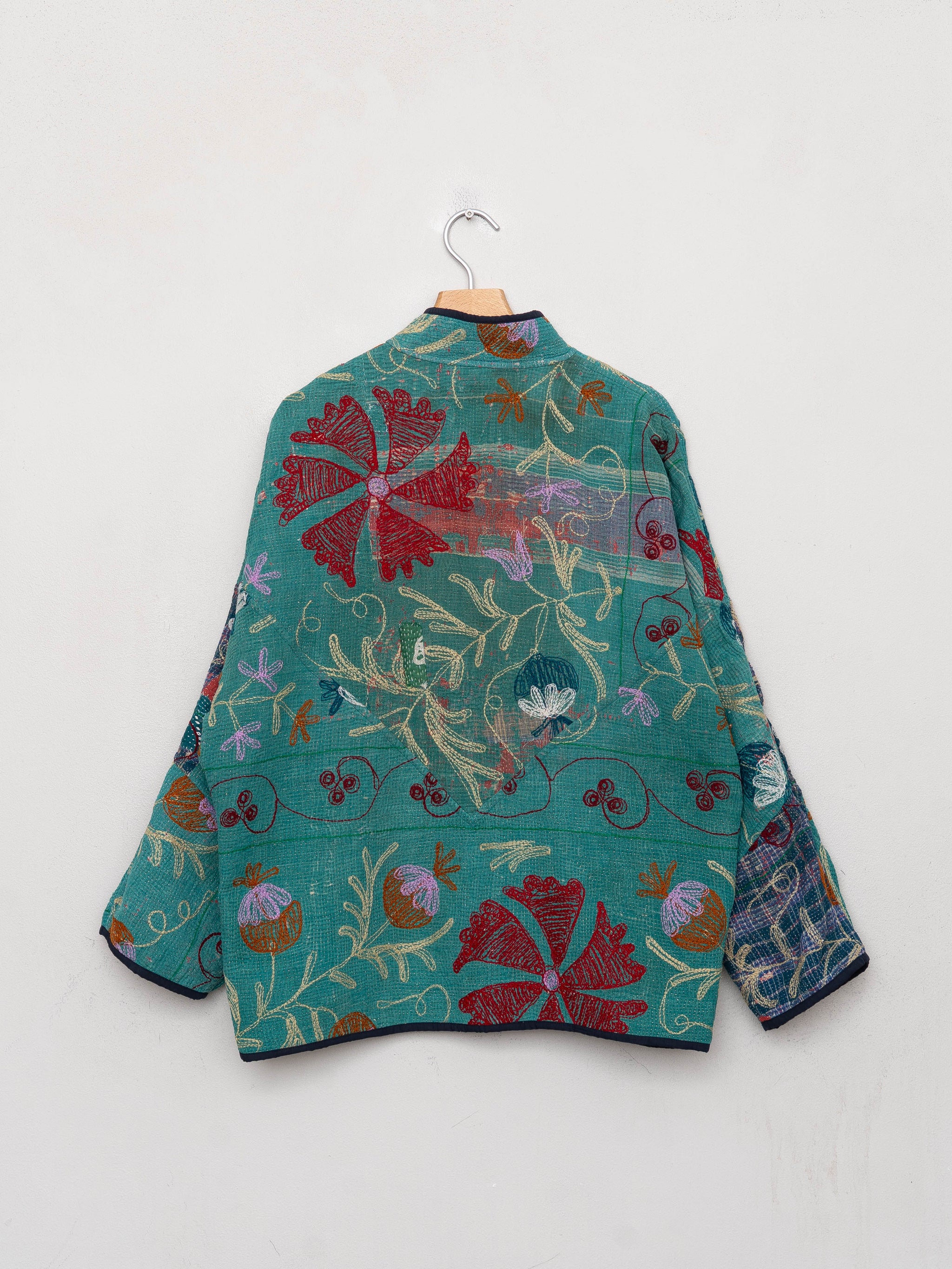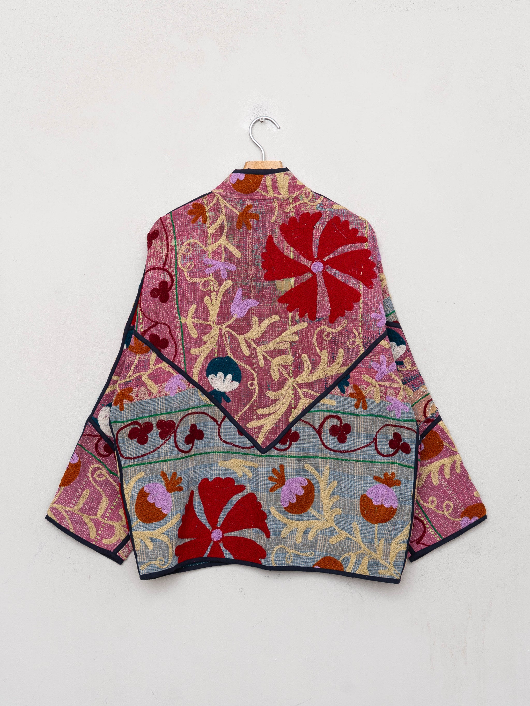 Our Suzani jackets are made from a repurposed Suzani Kantha quilt—vintage cotton stitched with colorful wool embroidery in a flowing chain-stitch style.