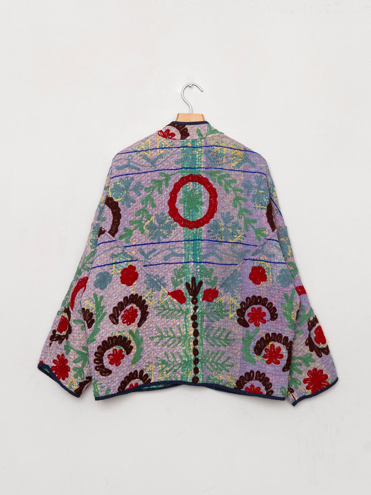 Our Suzani jackets are made from a repurposed Suzani Kantha quilt—vintage cotton stitched with colorful wool embroidery in a flowing chain-stitch style.