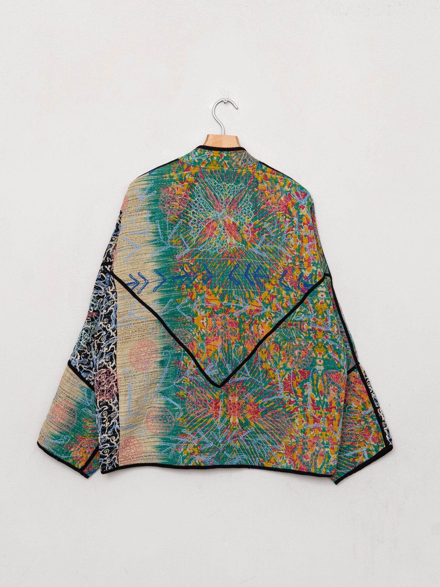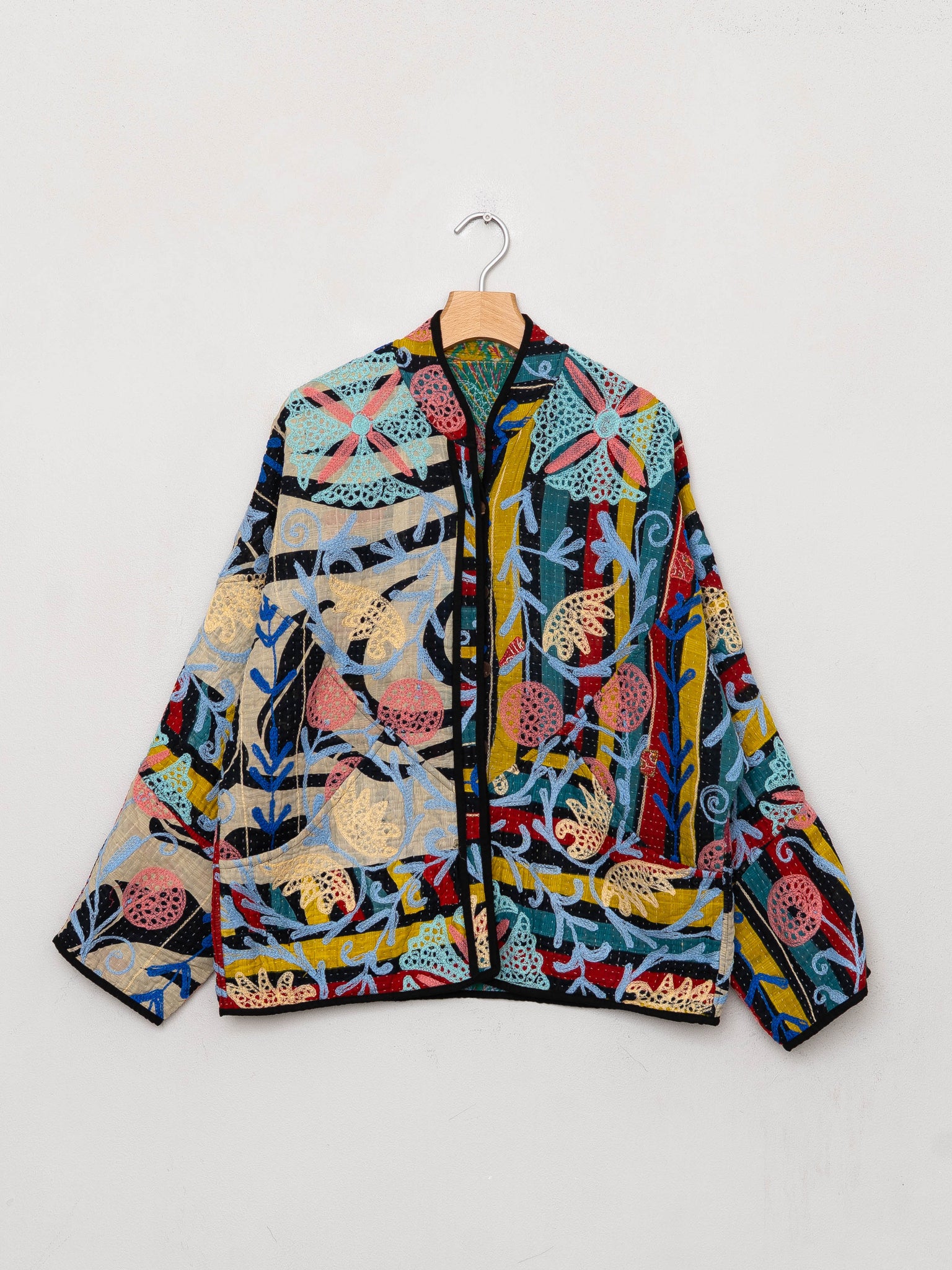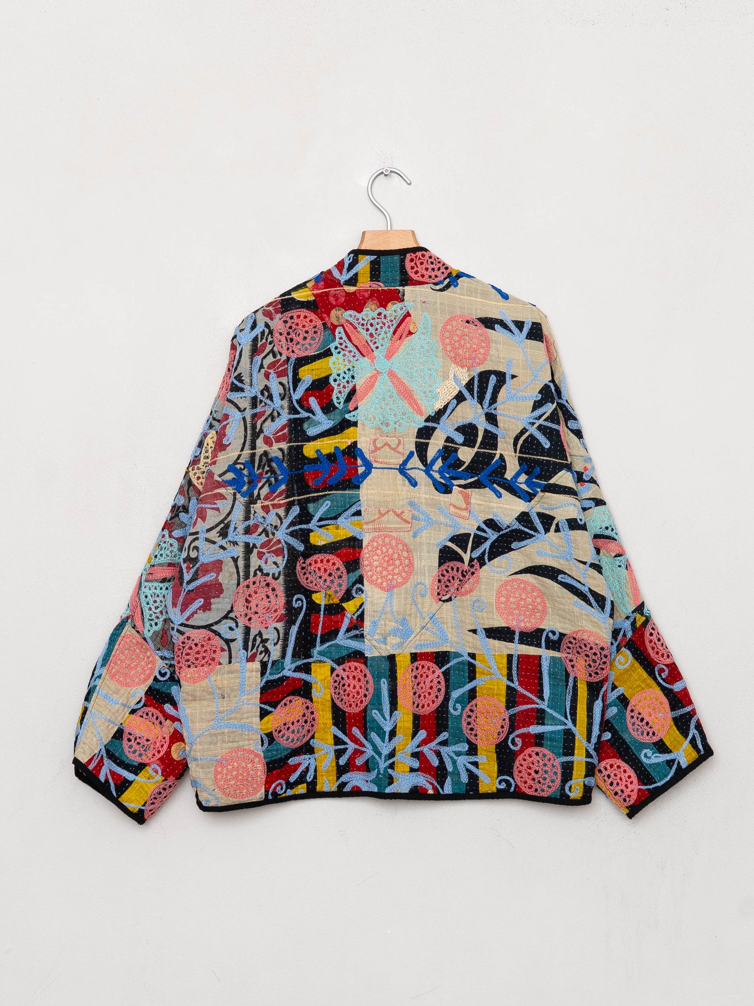 Our Suzani jackets are made from a repurposed Suzani Kantha quilt—vintage cotton stitched with colorful wool embroidery in a flowing chain-stitch style.