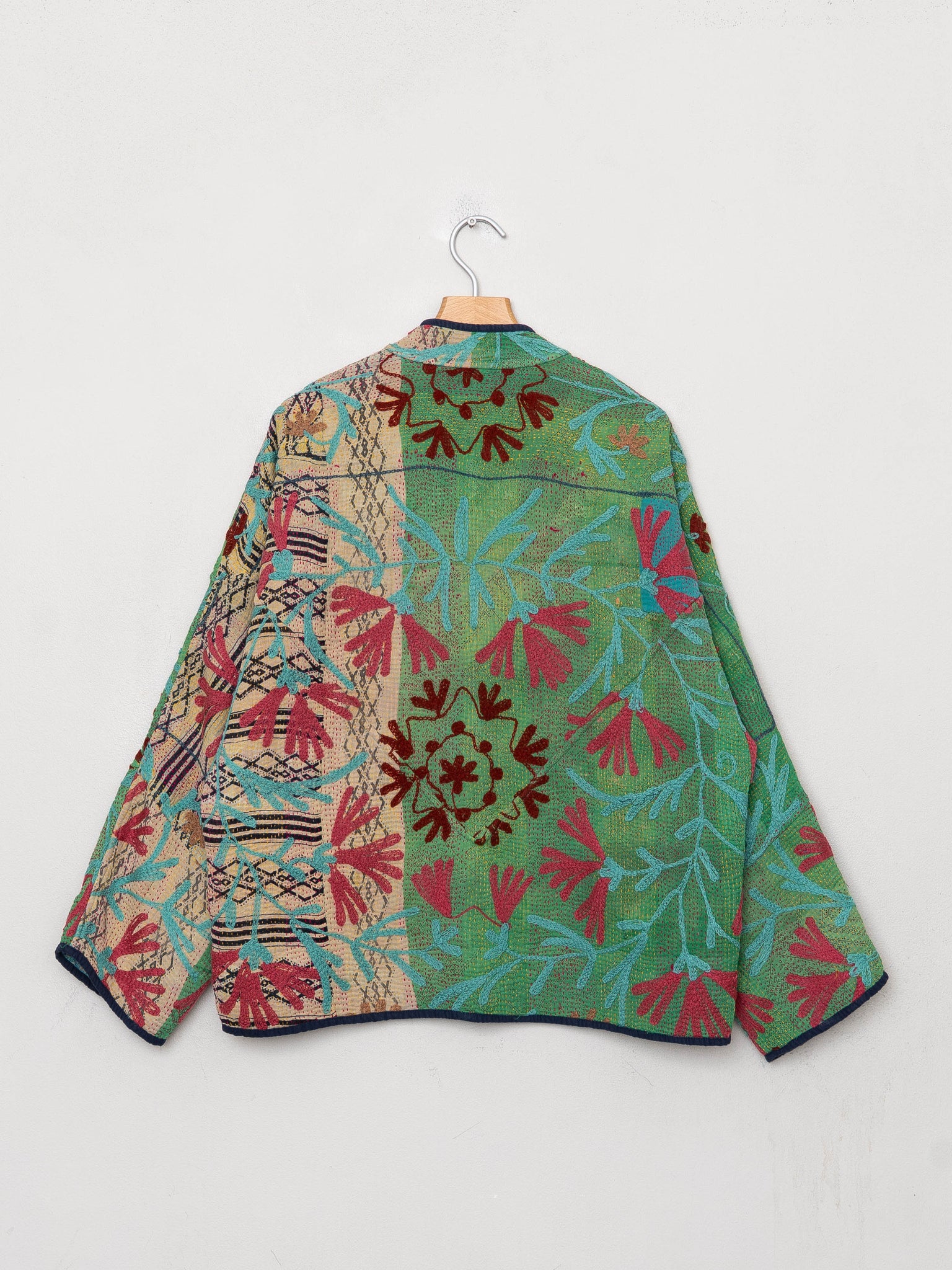 Our Suzani jackets are made from a repurposed Suzani Kantha quilt—vintage cotton stitched with colorful wool embroidery in a flowing chain-stitch style.