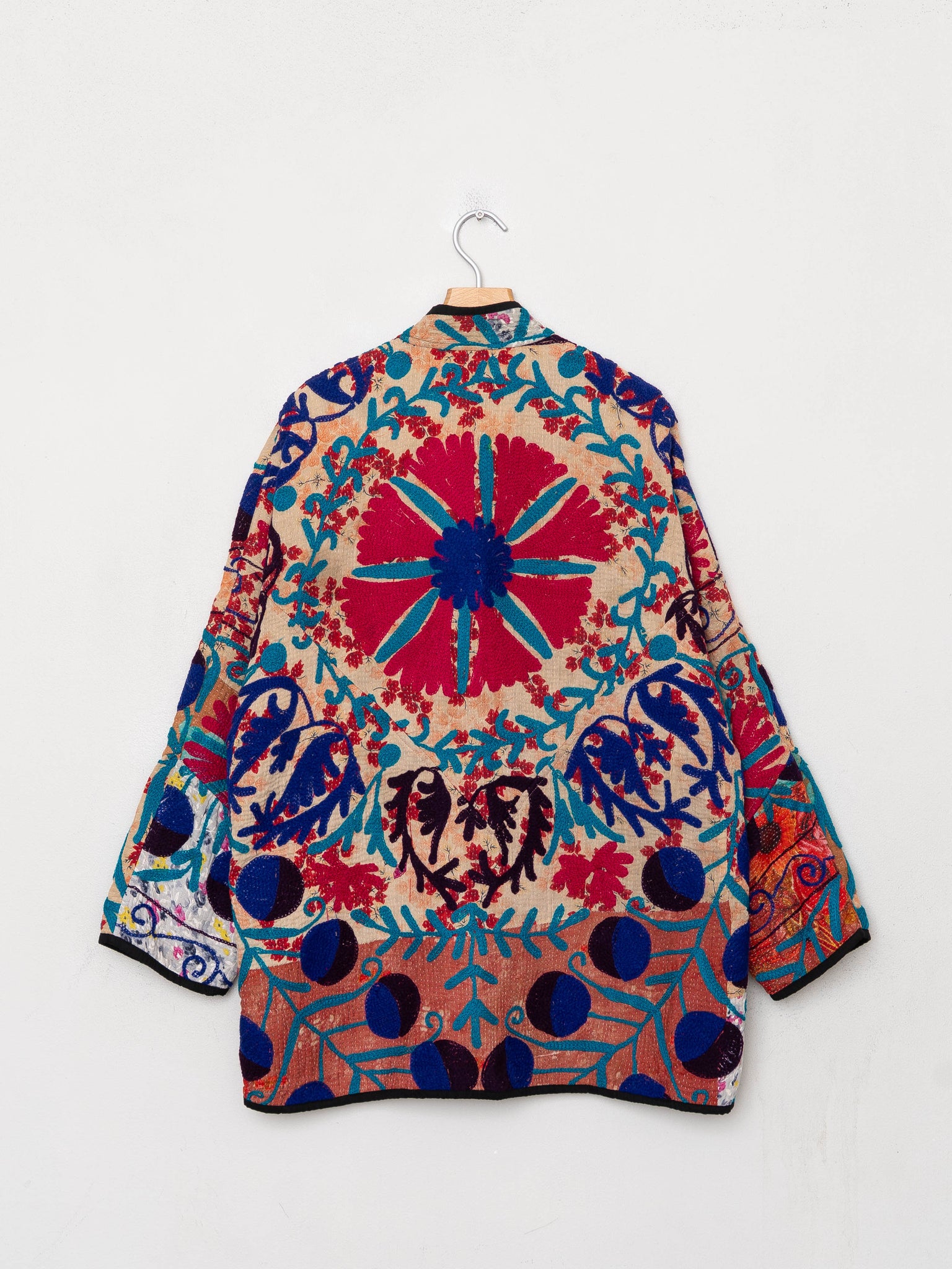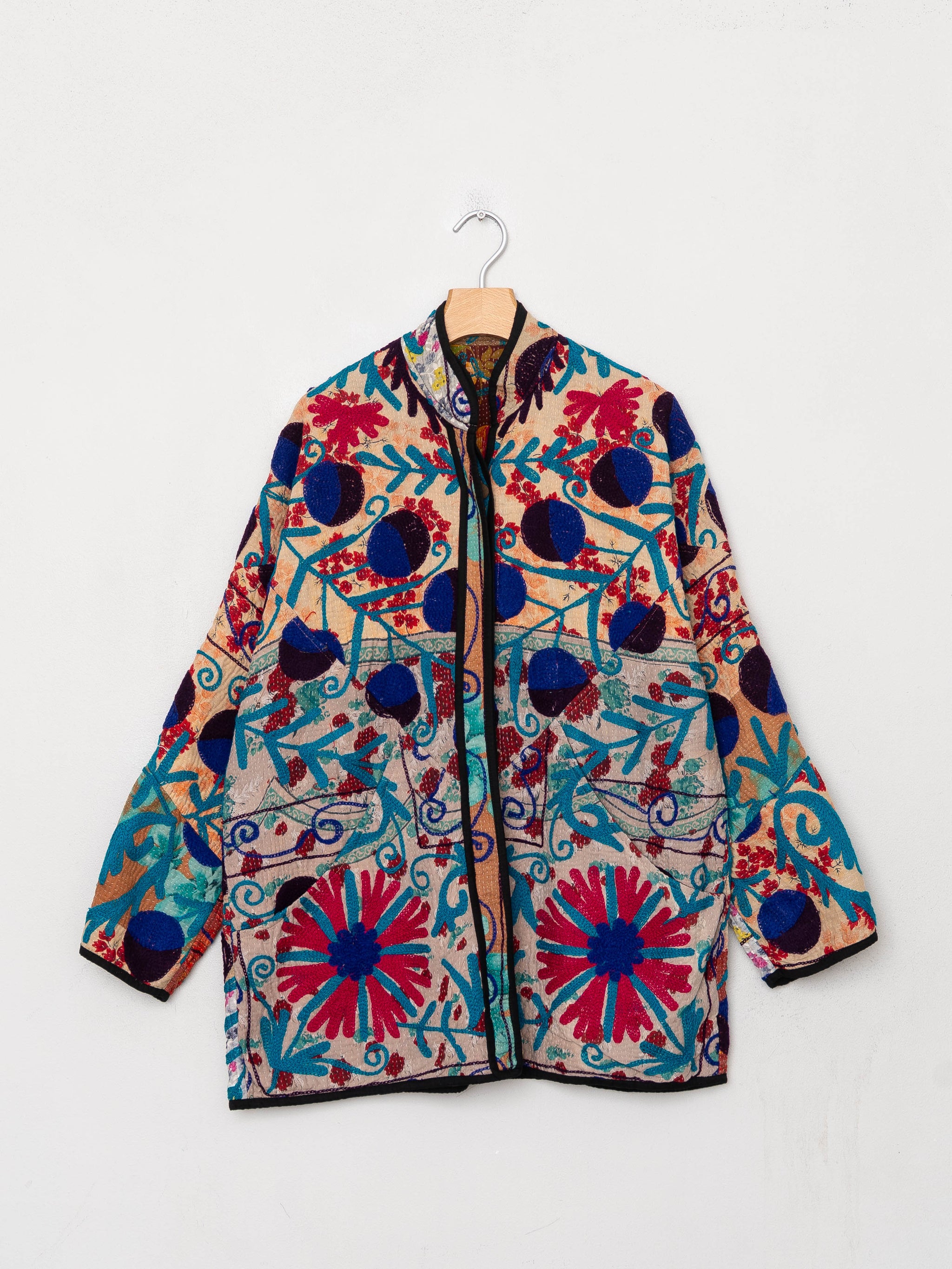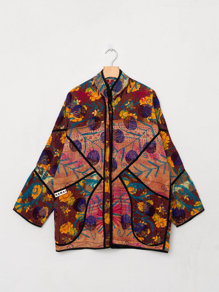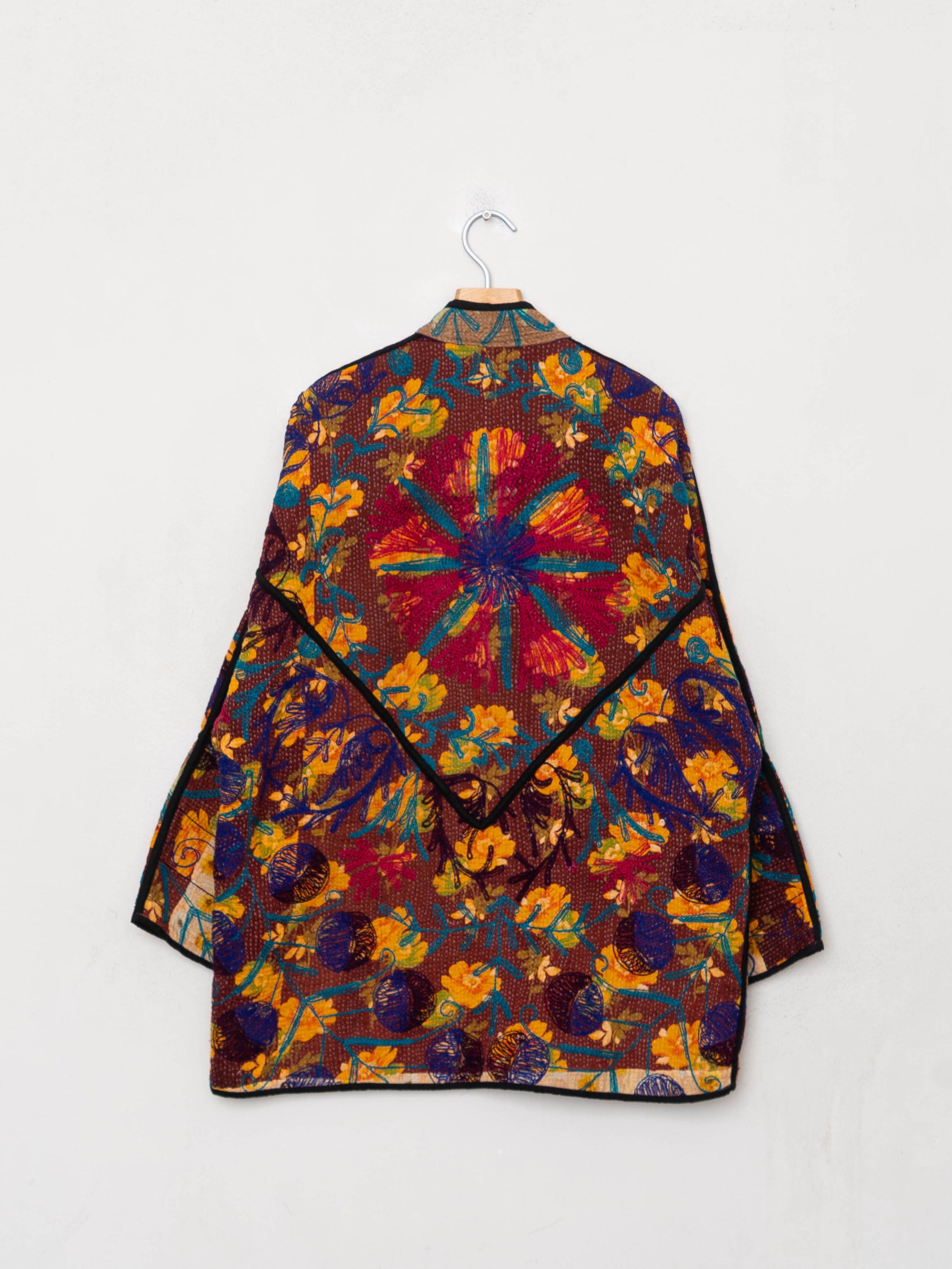 This Jacket features mud resist motifs dyed with plant based dyes over the Vintage Kantha textiles.