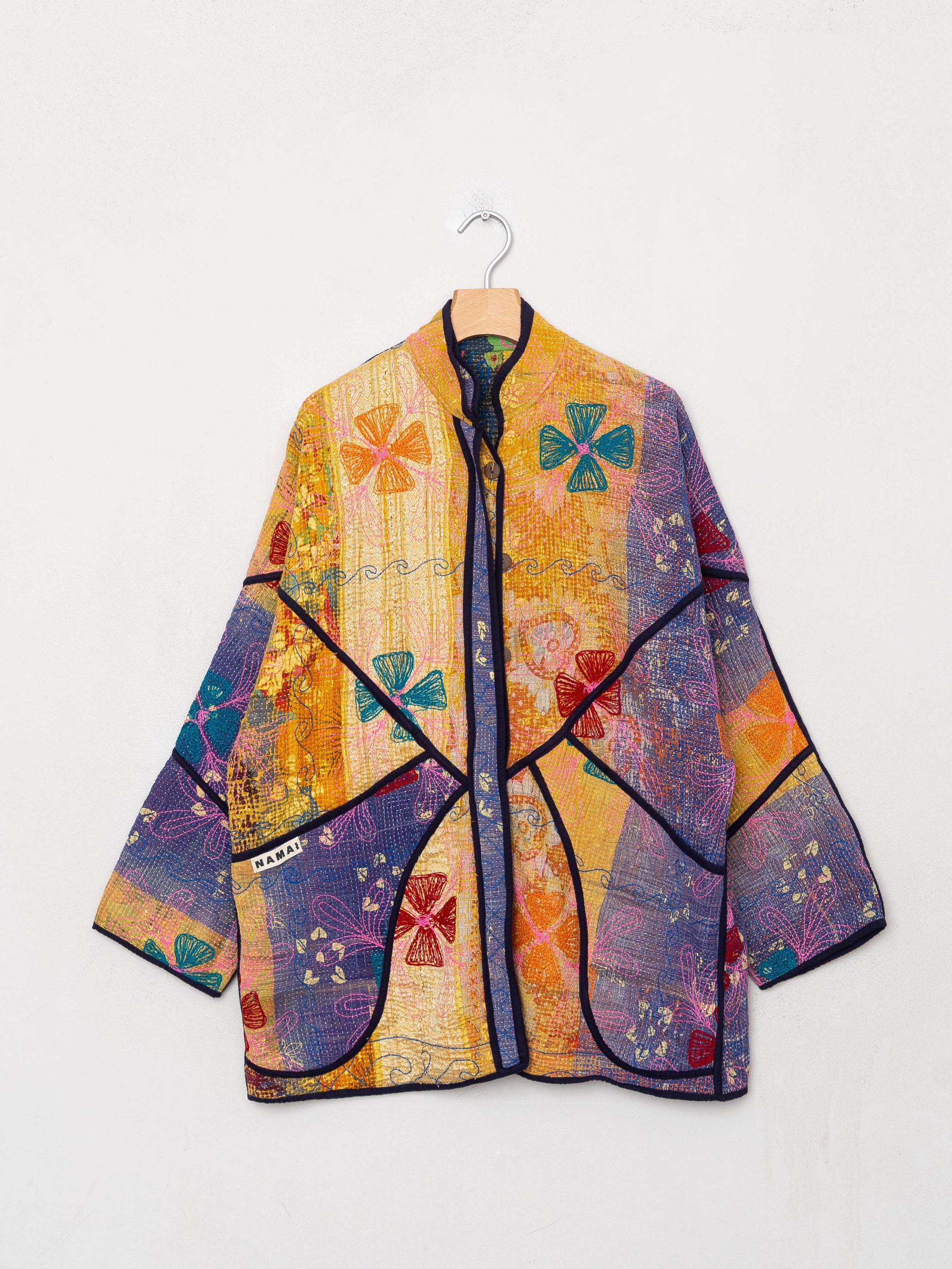 This Jacket features mud resist motifs dyed with plant based dyes over the Vintage Kantha textiles.